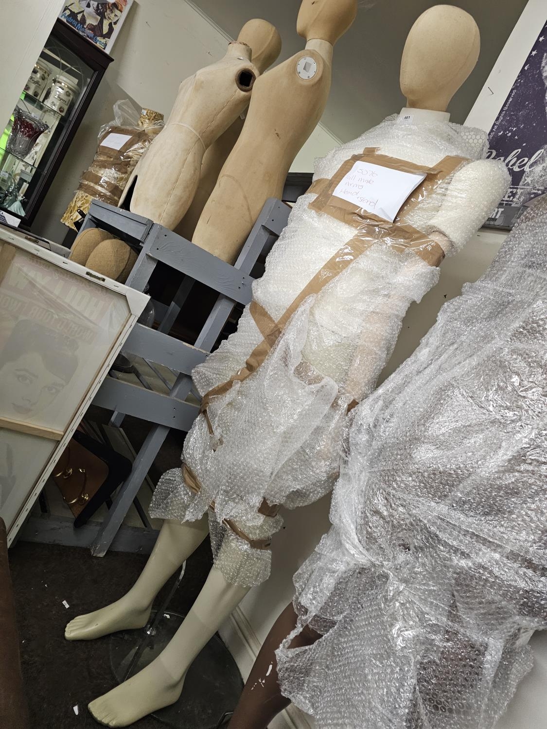 Quality full size male mannequin with articulating wooden arms ex shop display dummy on glass and metal stand