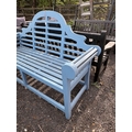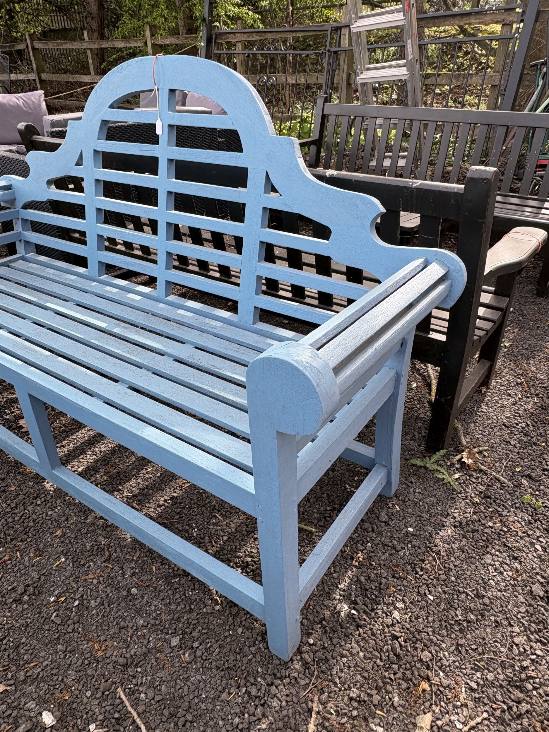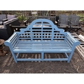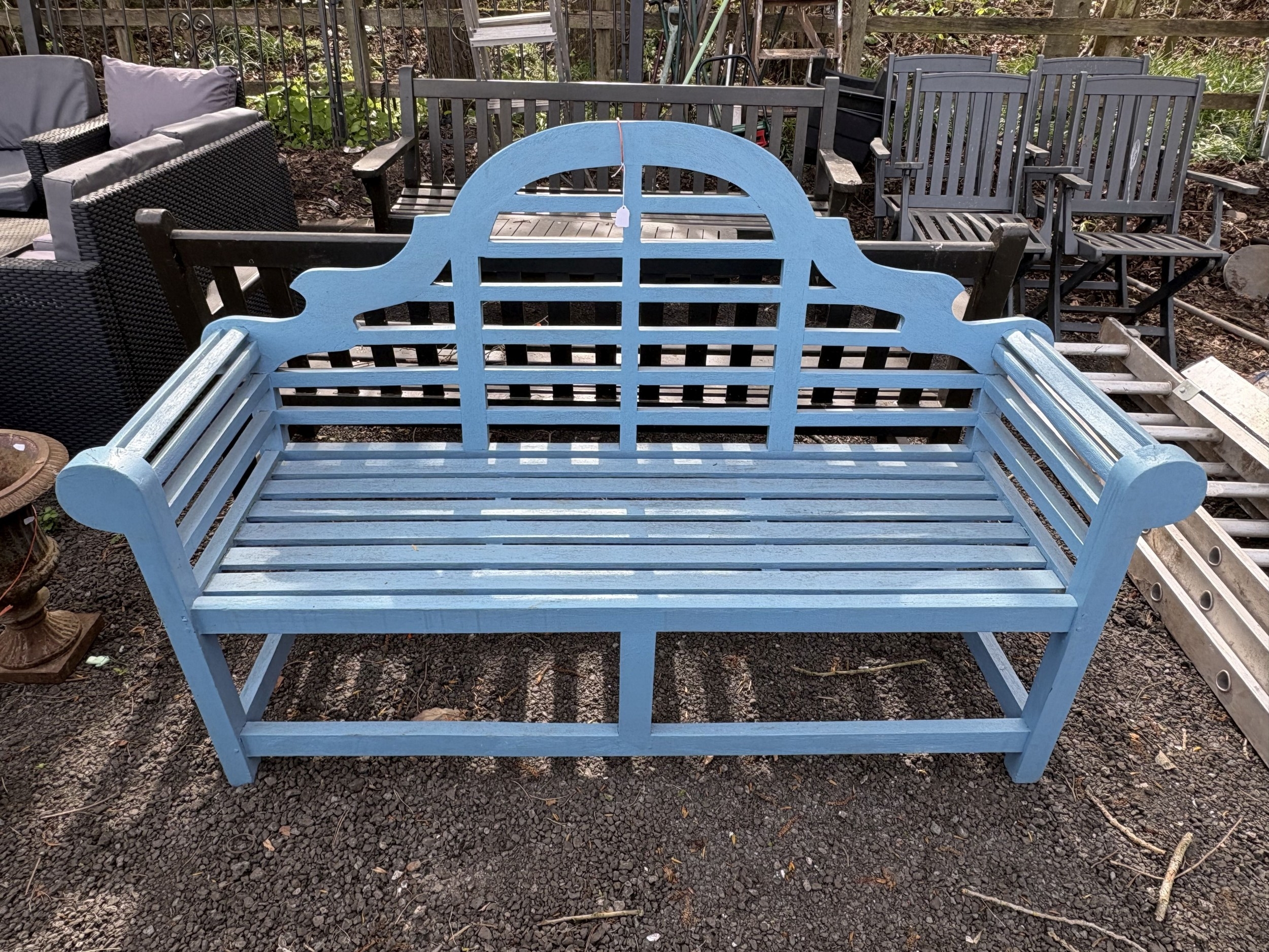 A BLUE PAINTED TEAK LUTYENS BENCH, length 165cm, condition report: frame is solid