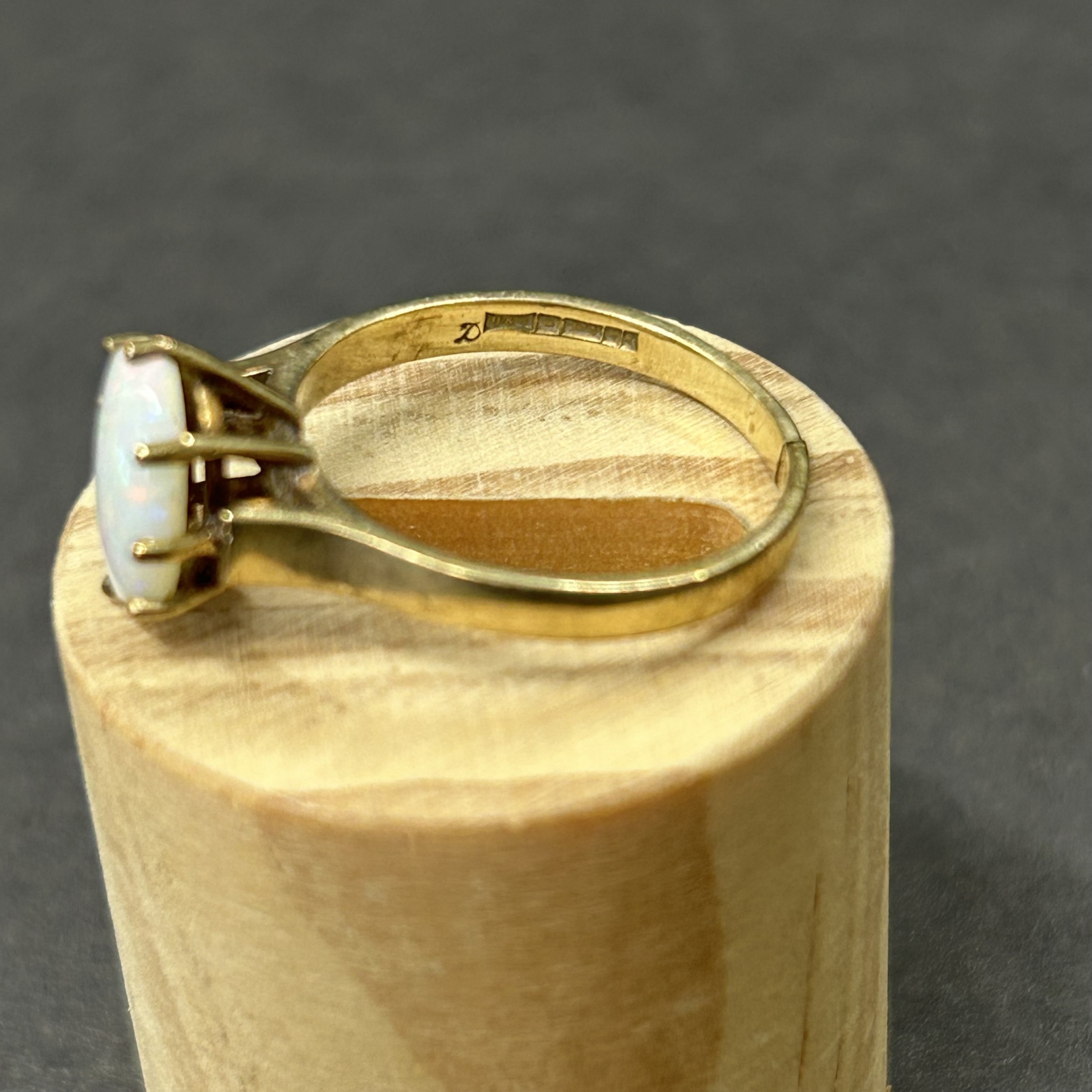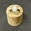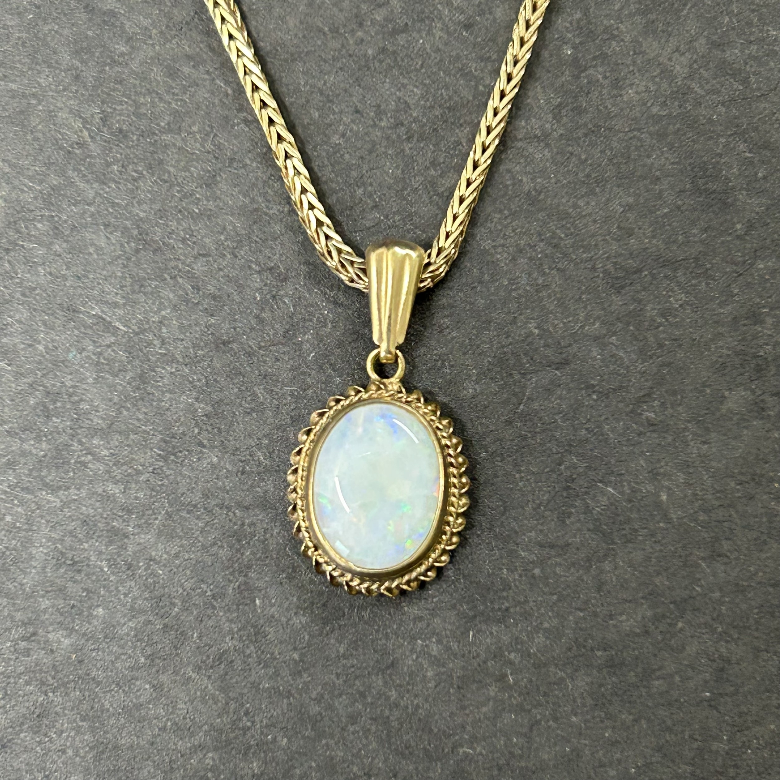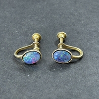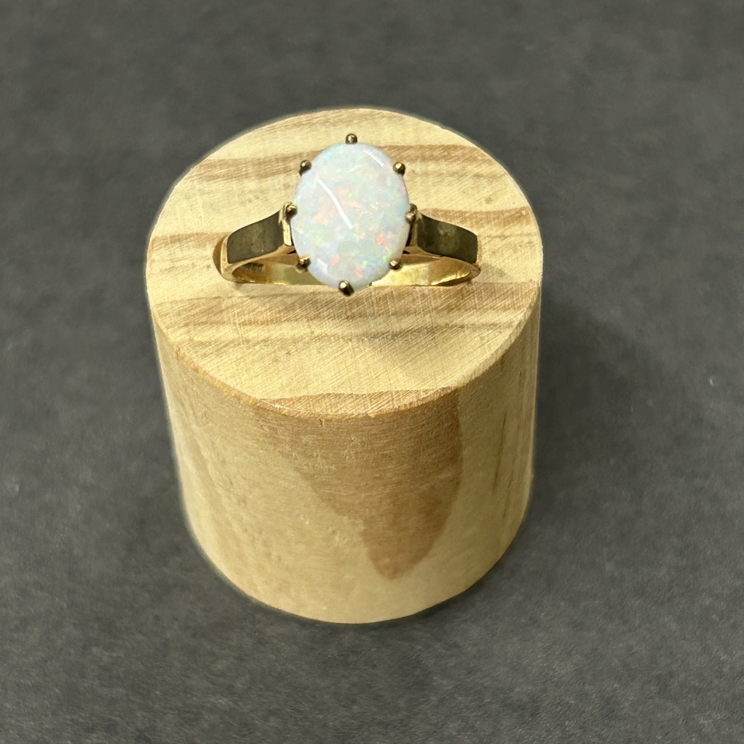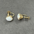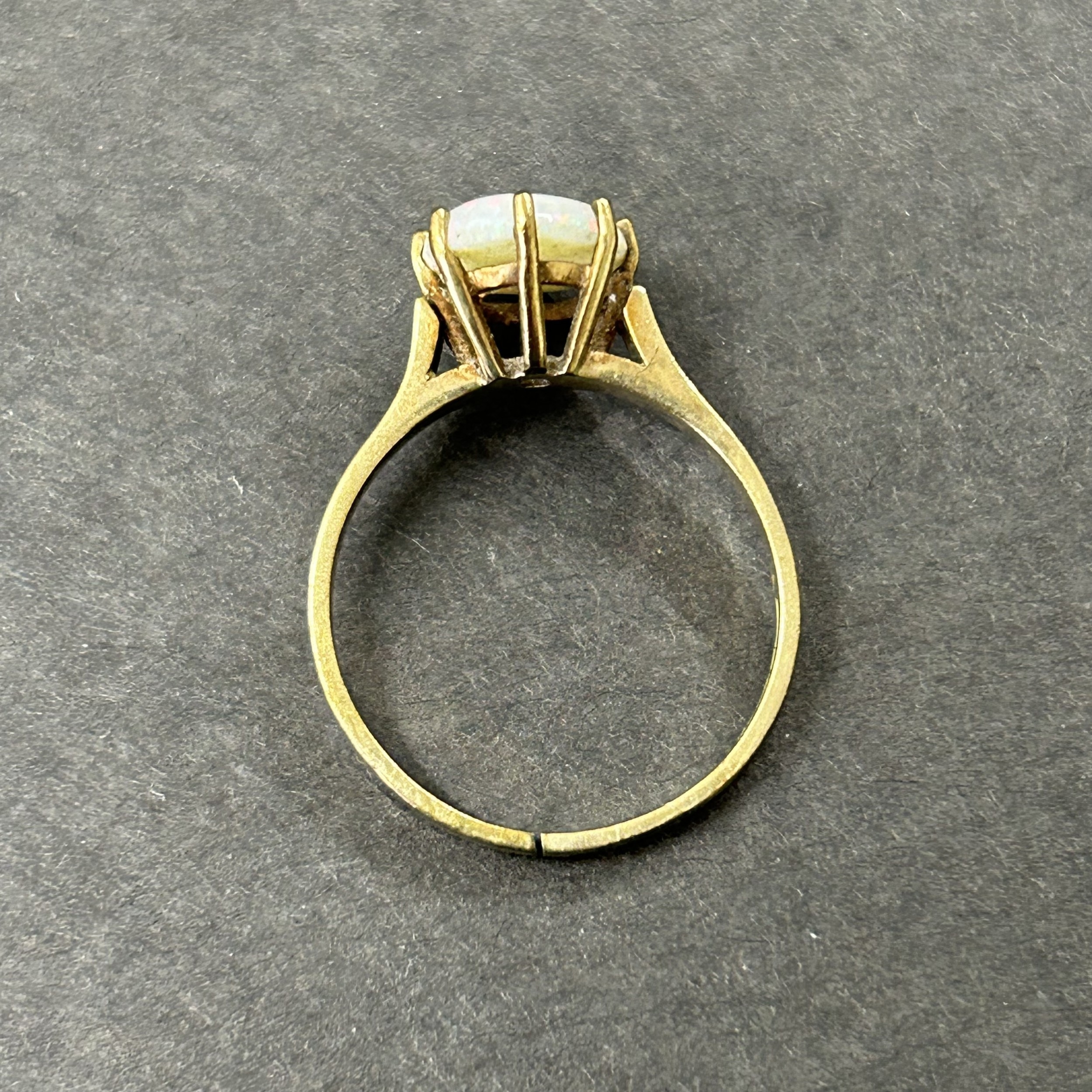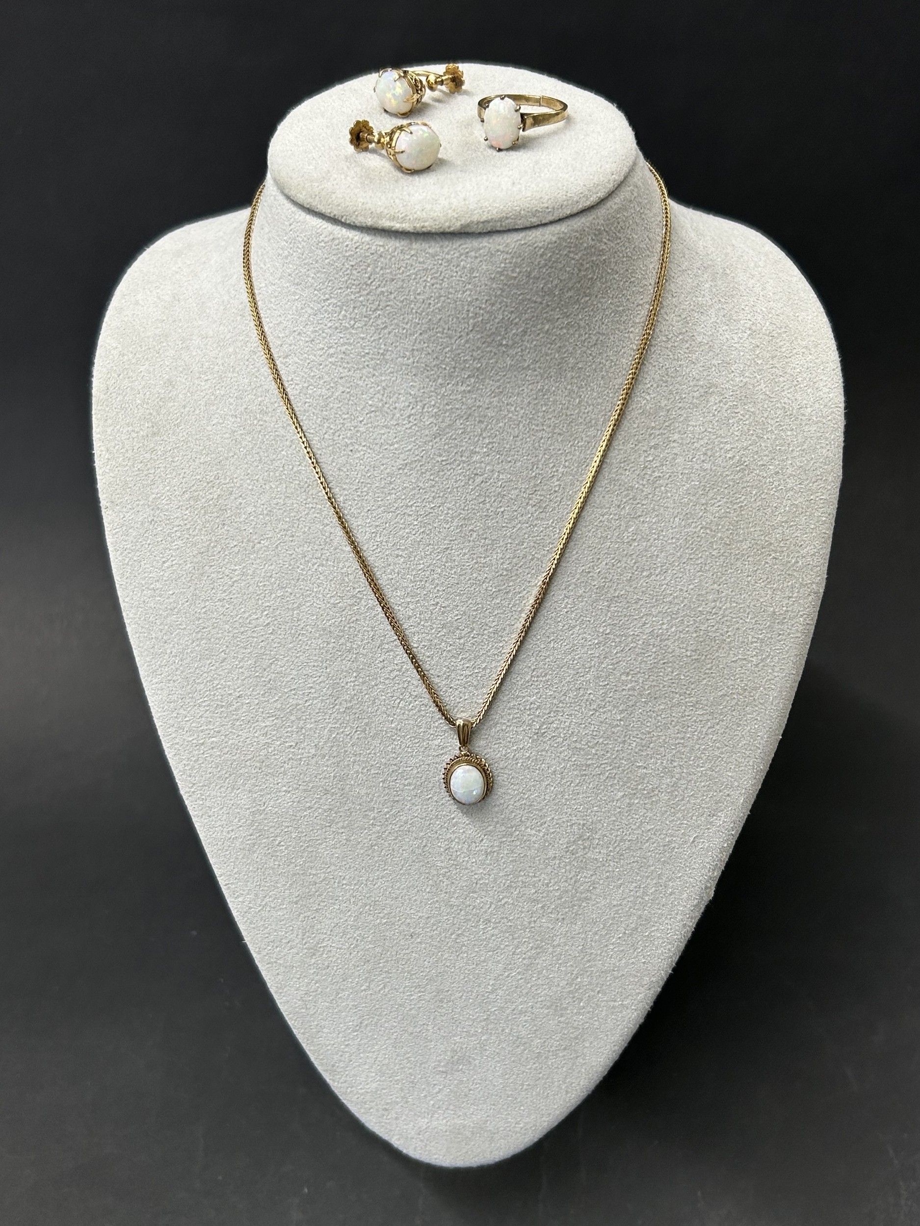 A 9ct gold and opal set ring, approx. size O, weight approx. 2.2g (the shank has been cut) together with matching yellow metal screw-on earrings and a 9ct gold chain with yellow metal mounted opal pendant, weight approx. 4.5g