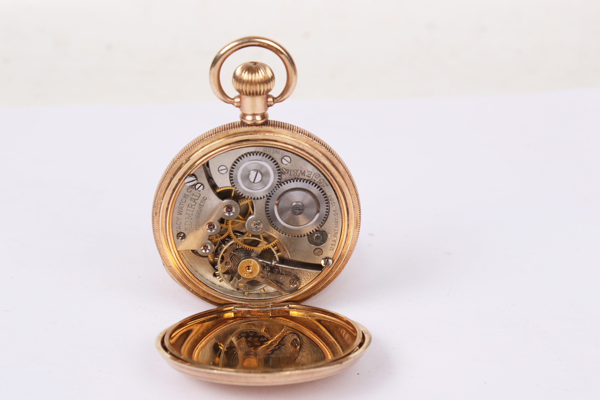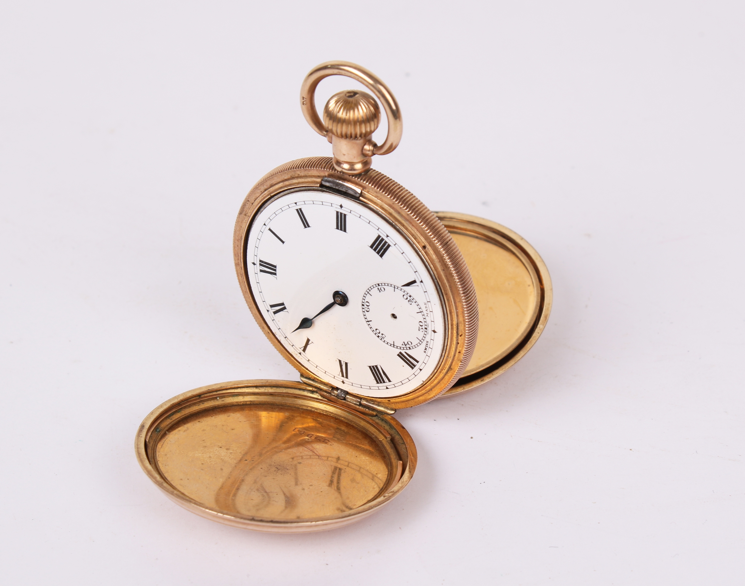 TBV. A vintage yellow metal full hunter pocket watch. With engine turned decoration to both sides, black Roman numerals and subsidiary dial (hand missing), inside back case marked 'Star , Dennison Watch Case Co Ltd'. Case diameter 4.8cm, gross weight 1.5.2g.