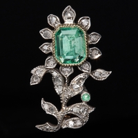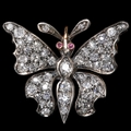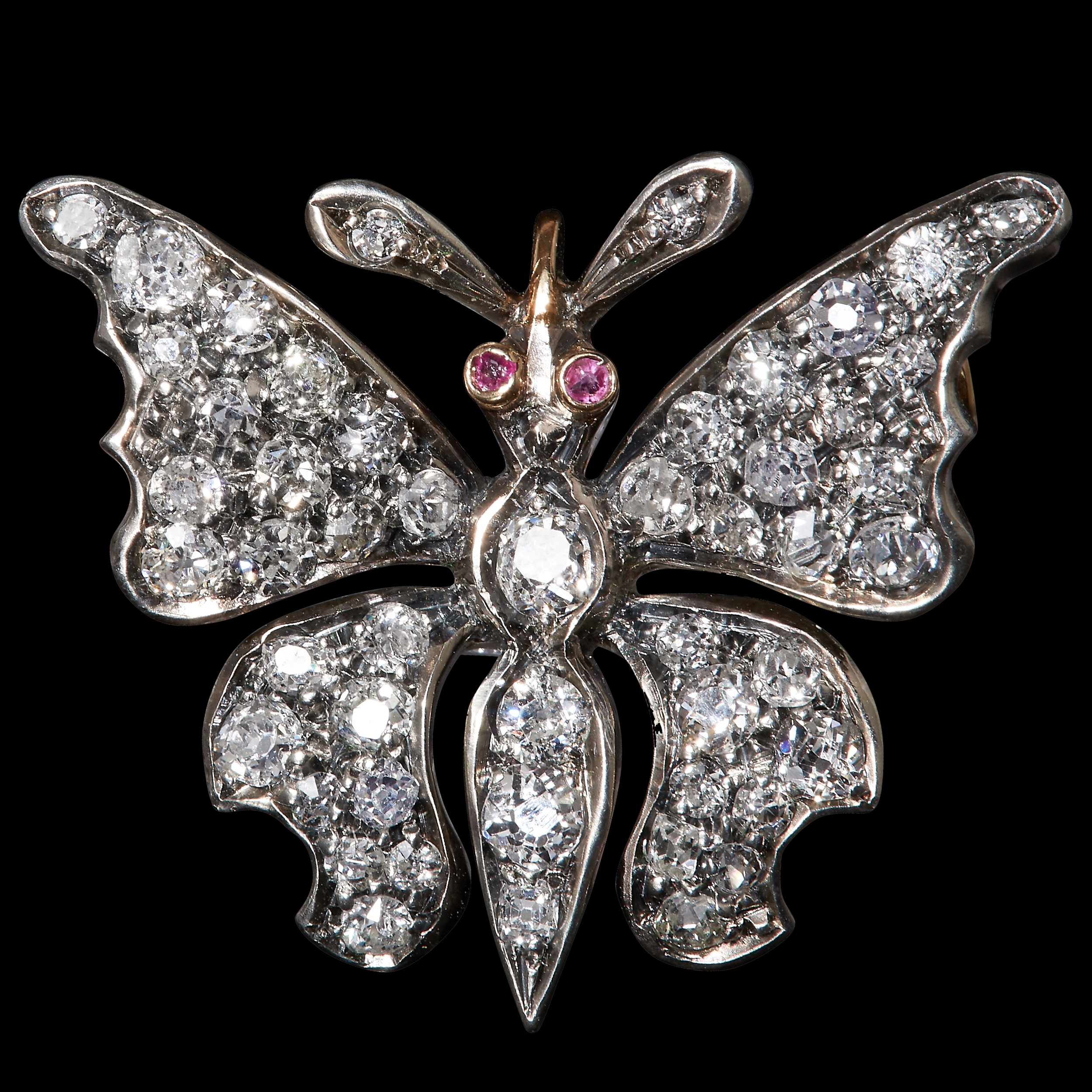 VICTORIAN DIAMOND BUTTERFLY BROOCH, set with old cut diamonds totalling approx. 1.50 ct. and 2 ruby accents as eyes. W. 2.7 cm. 4.6 grams. With fitted box.