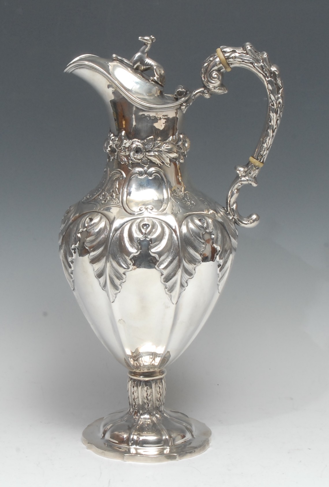A William IV Scottish silver lobed ovoid wine ewer, hinged cover with cast recumbent hound finalchased with bands of flowers and stiff leaves, fluted shaped circular foot, 34cm high, Andrew Wilkie, Edinburgh 1836, 32.5oz