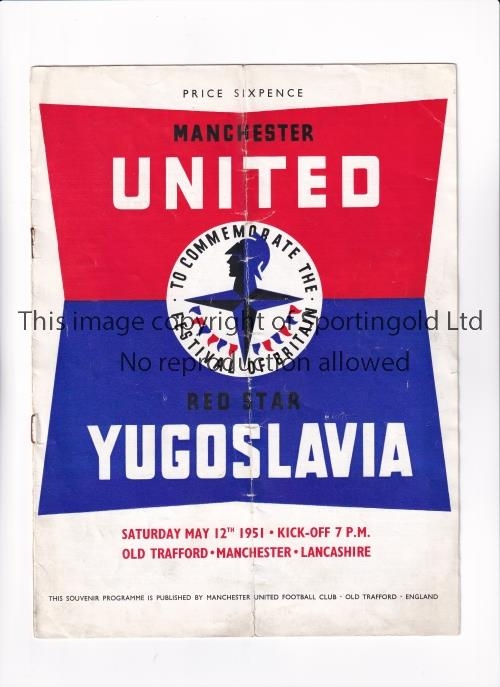 MANCHESTER UNITED / FESTIVAL OF BRITAIN Programme for the home match v Red Star Belgrade 12/5/1951, vertical fold and minor tears at the bottom. Fair to generally good