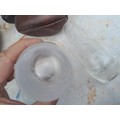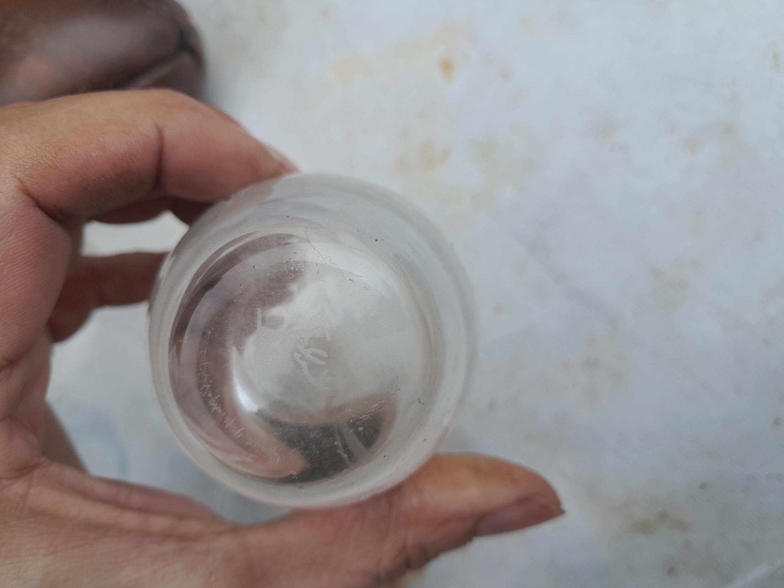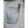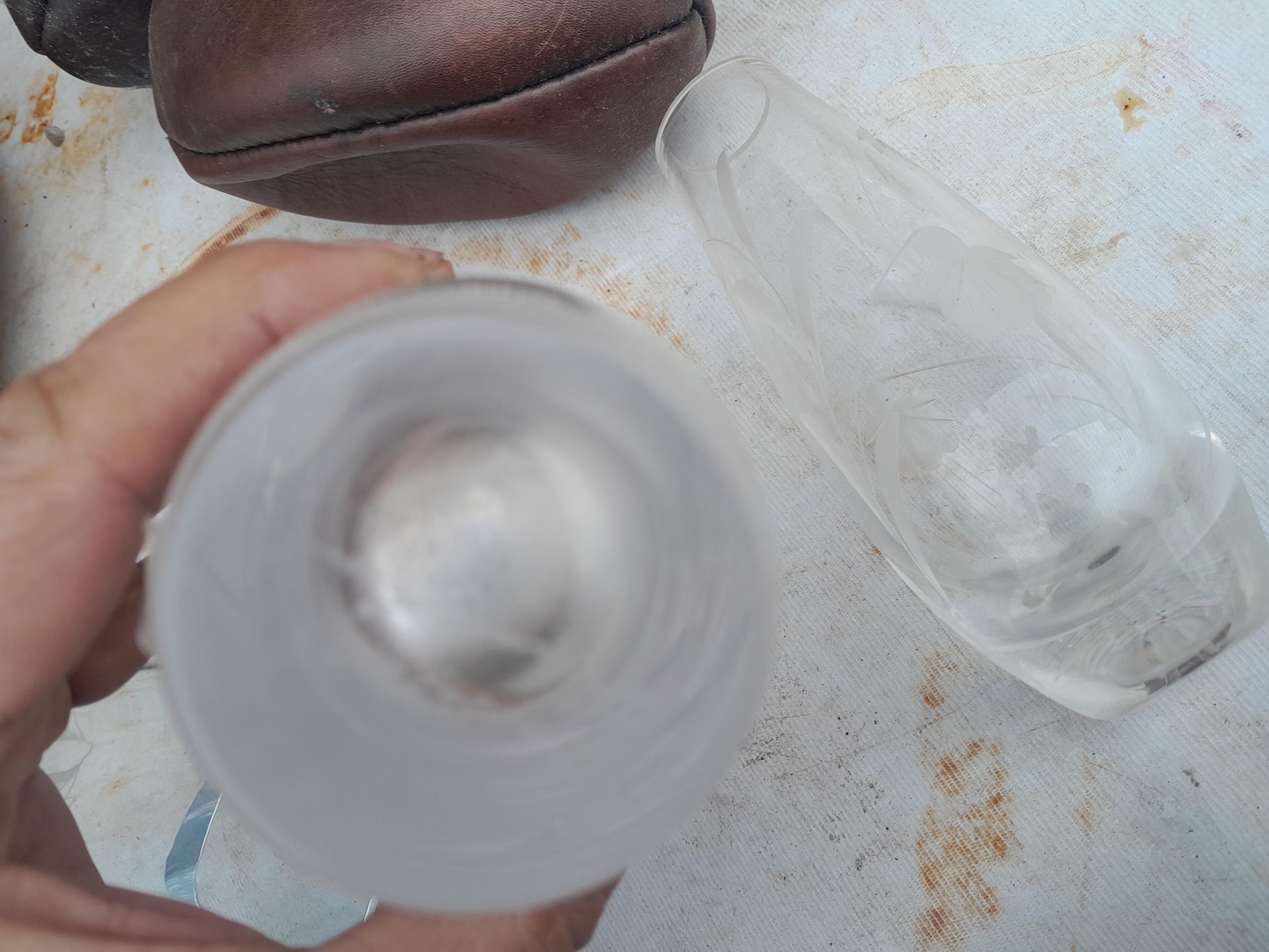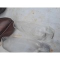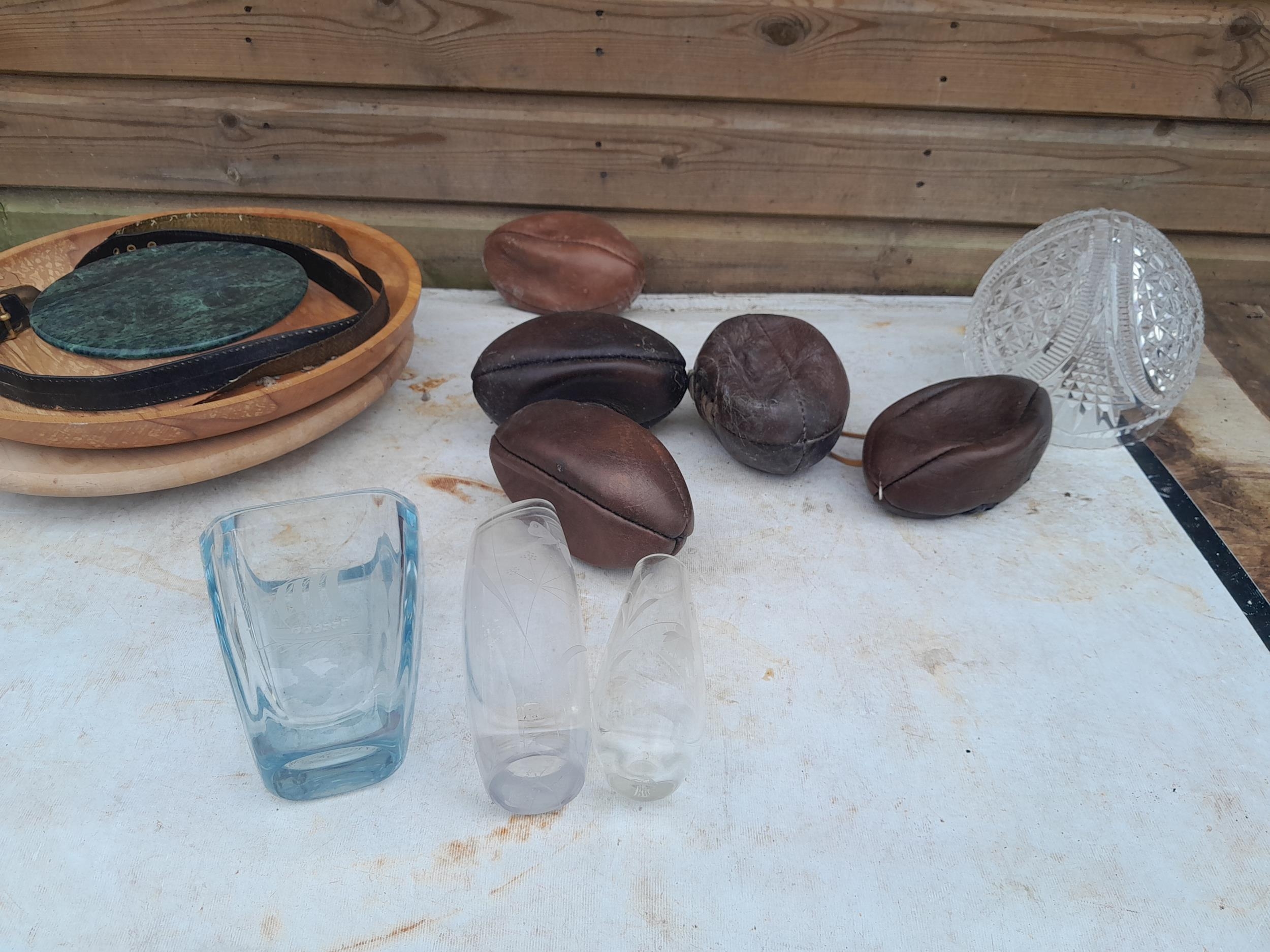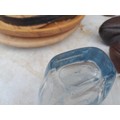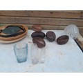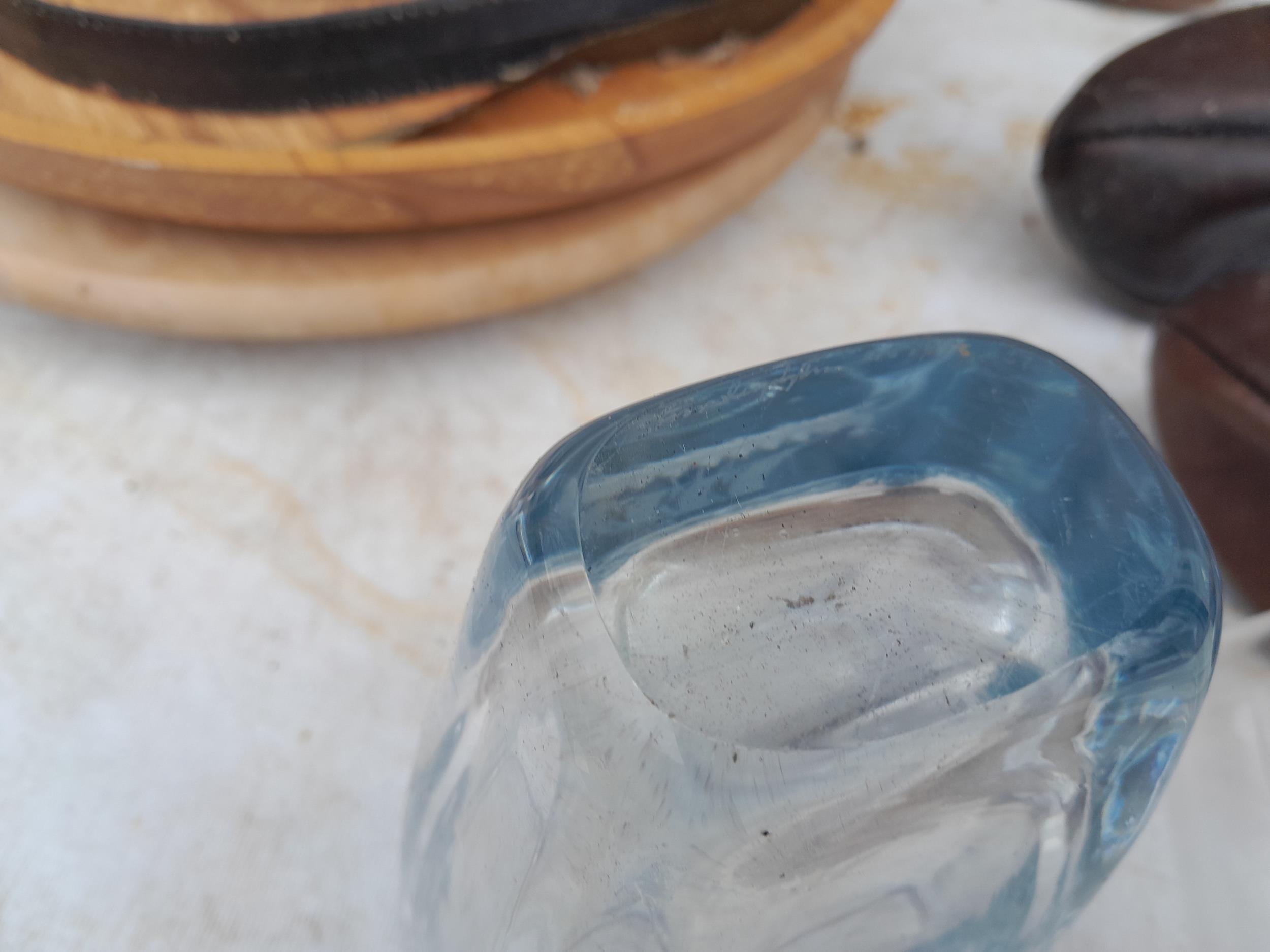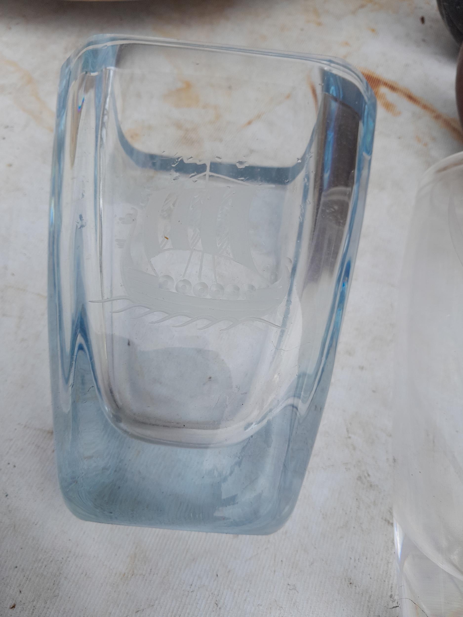 Box of oddments : 3 x pieces of etched glass (2 x signed Scandinavian), wooden lazy Susan