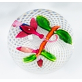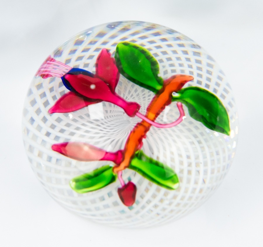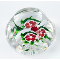 ST LOUIS FUCHSIA MINIATURE GLASS PAPERWEIGHT, 1 ¾” (4.4cm) high, 2 ¼” (5.7cm) diameter, etched 2100 and with red and white sticky label 112 C/R- nicks and chips to the top at the centre, numerous smaller chips and nicks
