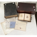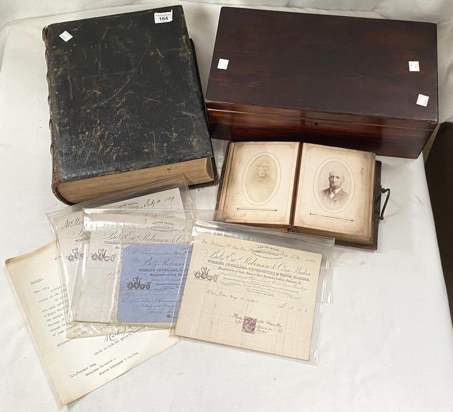 A 19th century Reverend Brown bible; a Victorian leather photo album; a mahogany box containing vintage receipts in copperplate; etc.