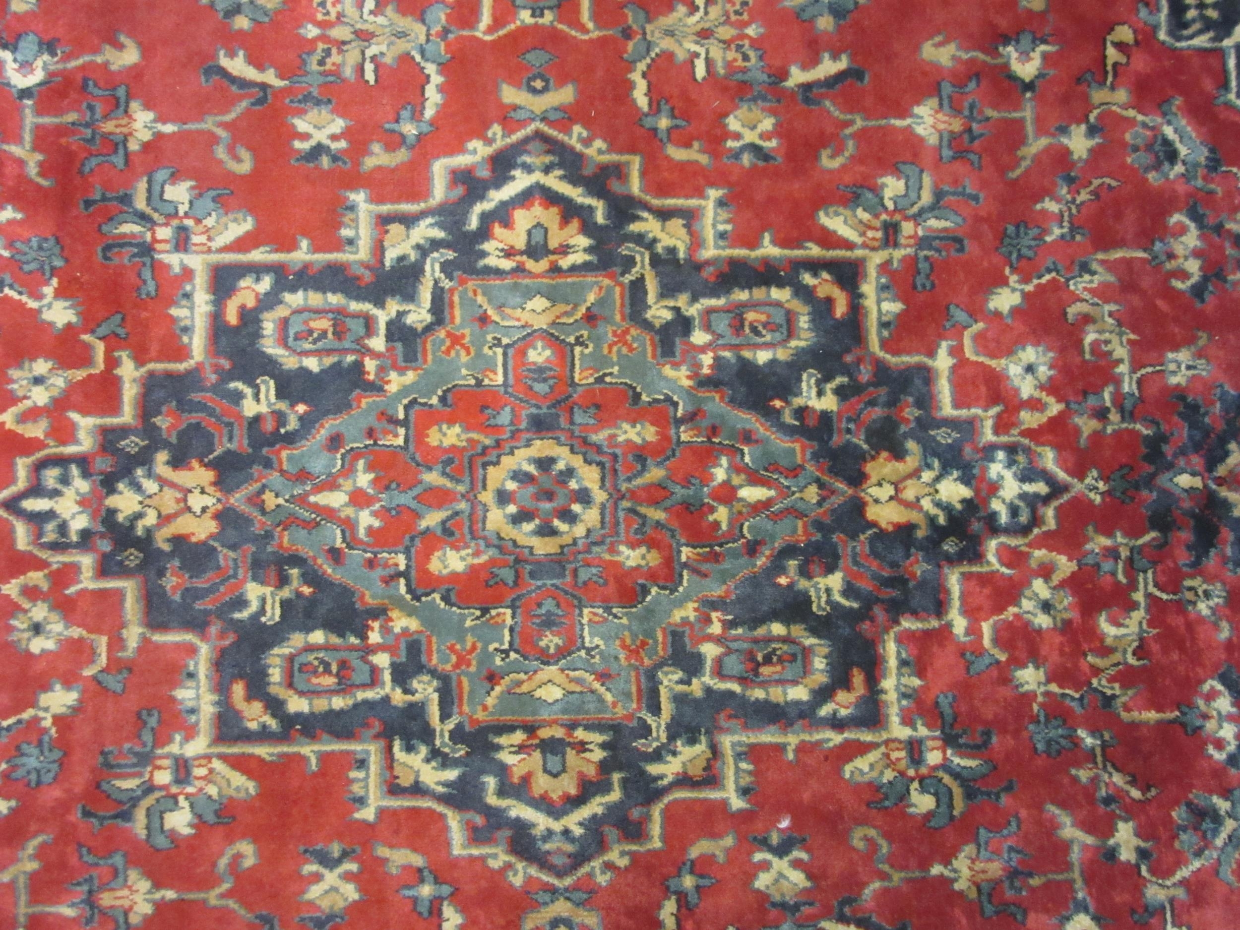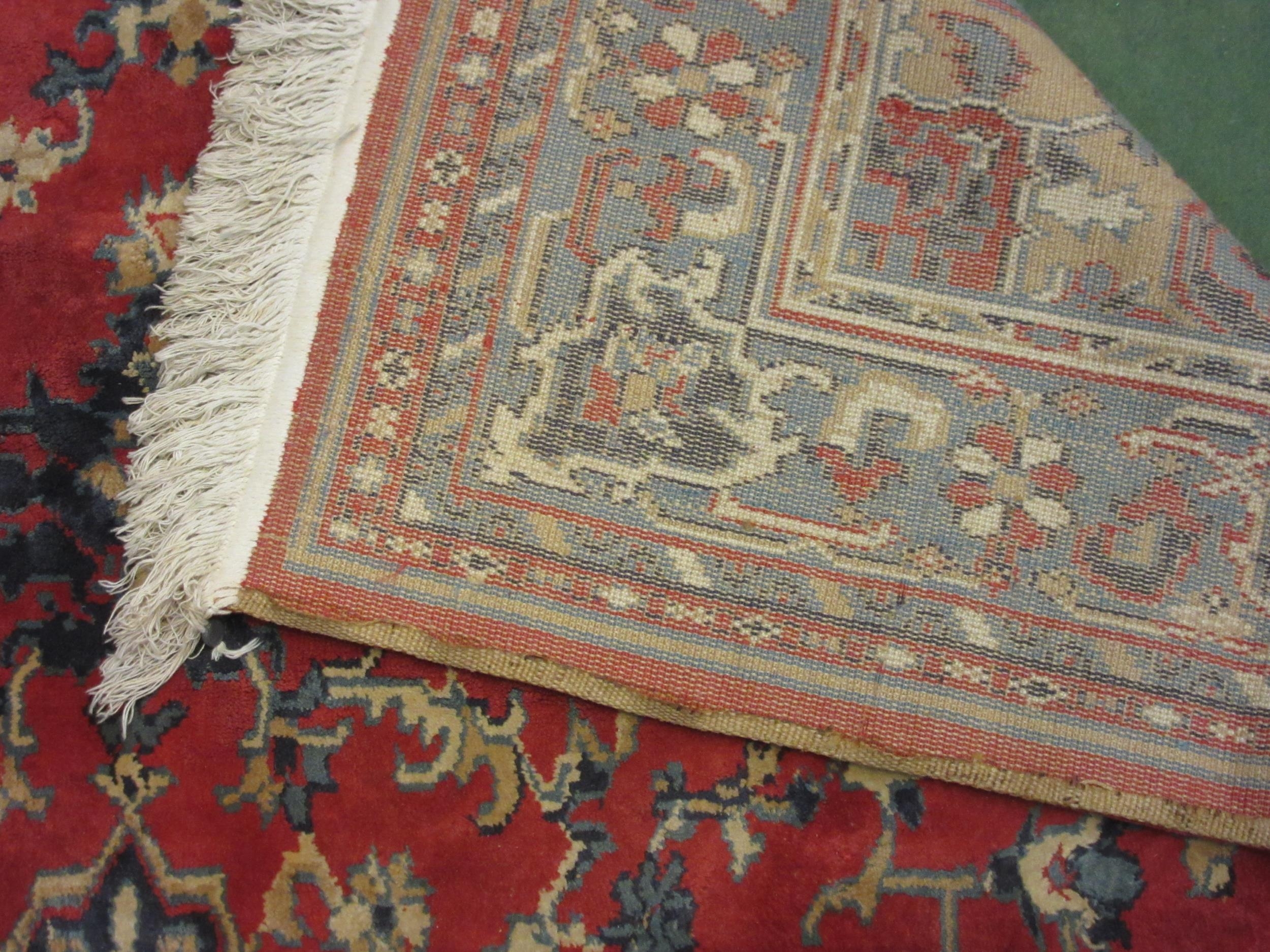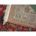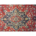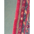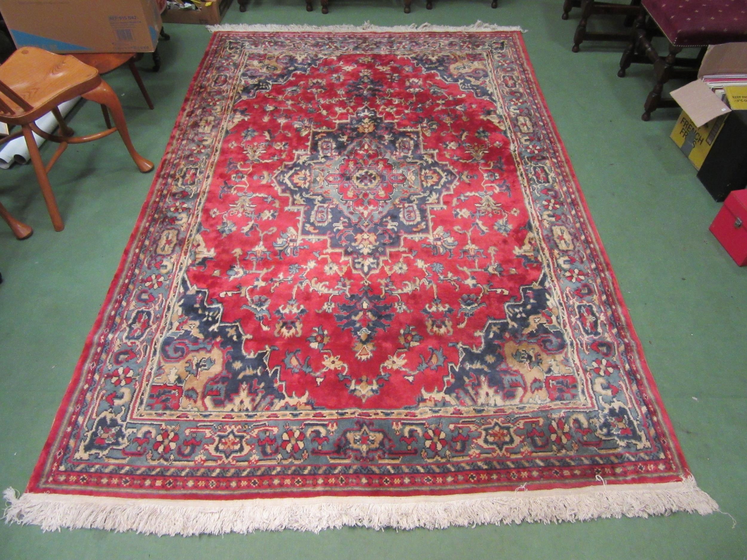 A large red and blue ground wool rug, central geometric panel and floral design with multiple borders and tasselled ends, 270cm x 180cm