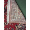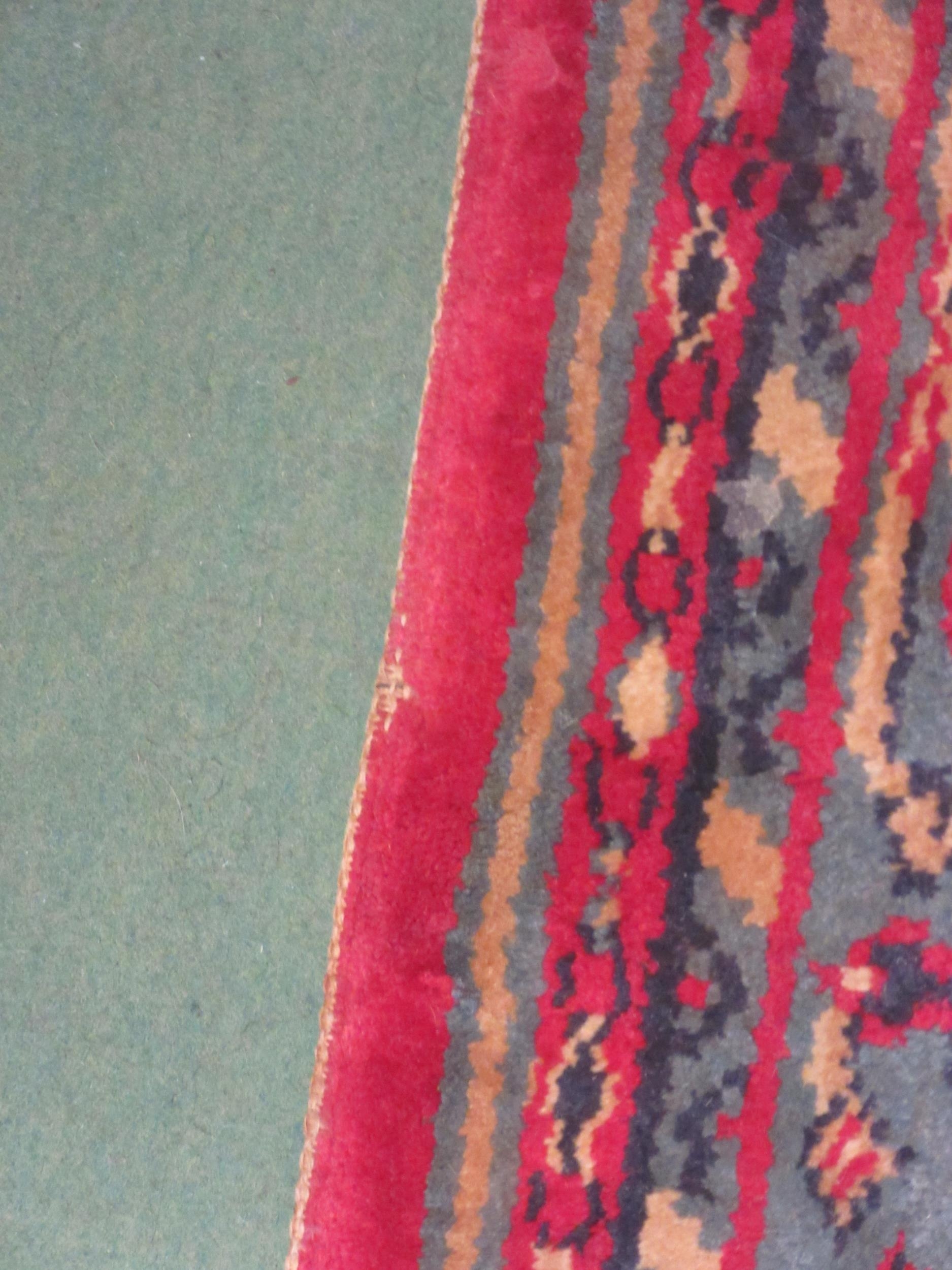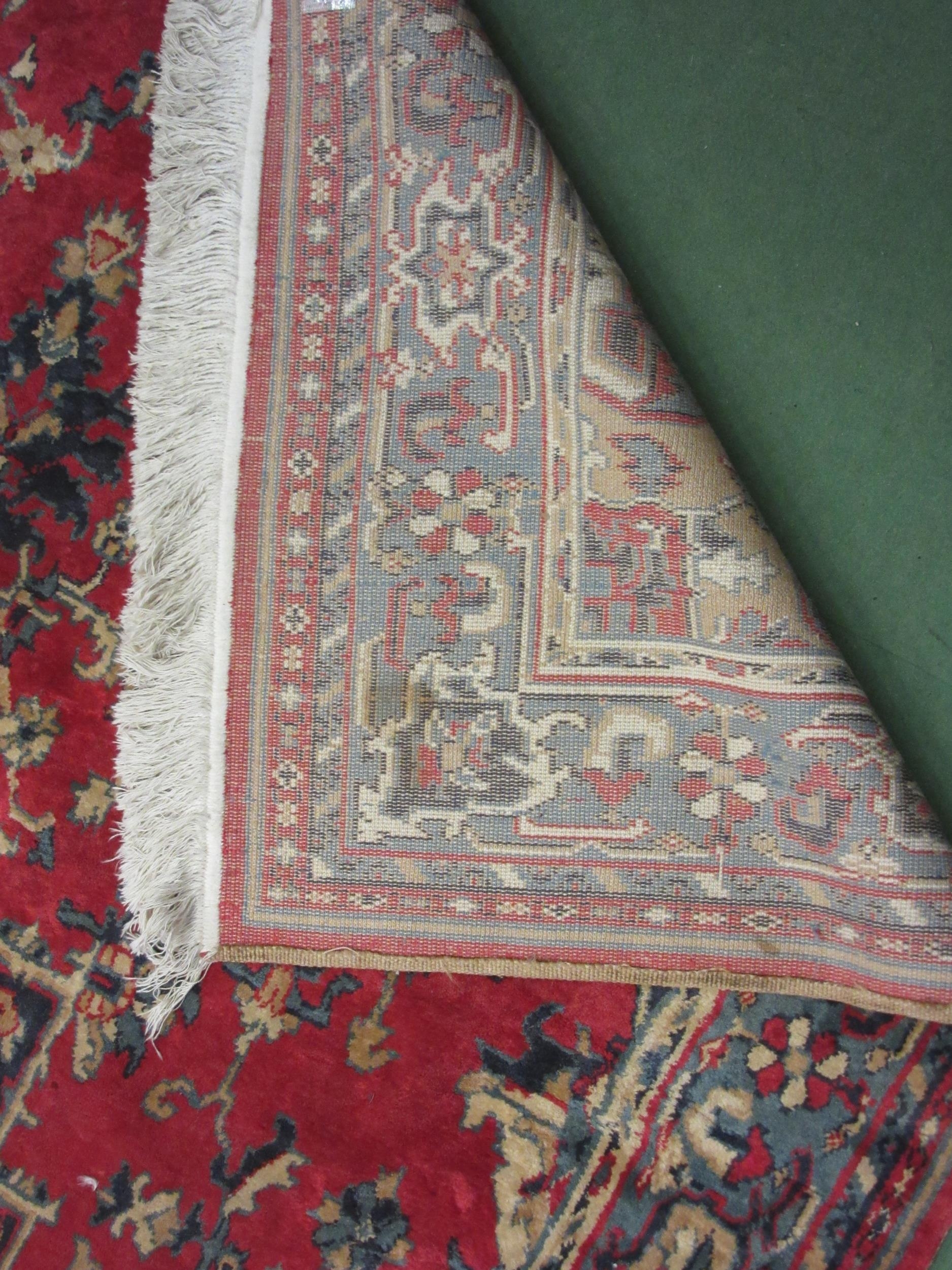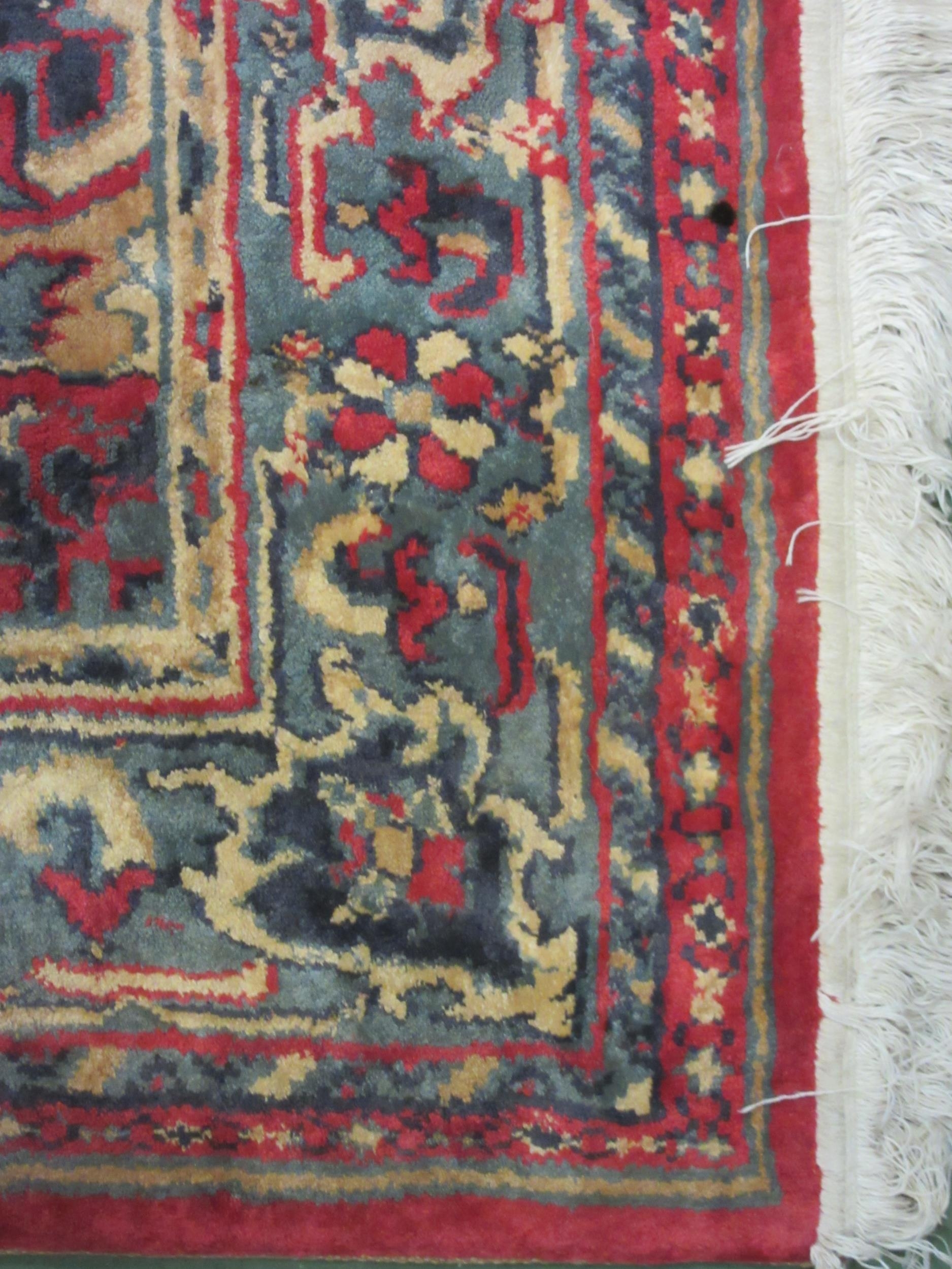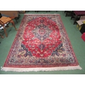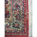 A large red and blue ground wool rug, central geometric panel and floral design with multiple borders and tasselled ends, 270cm x 180cm