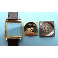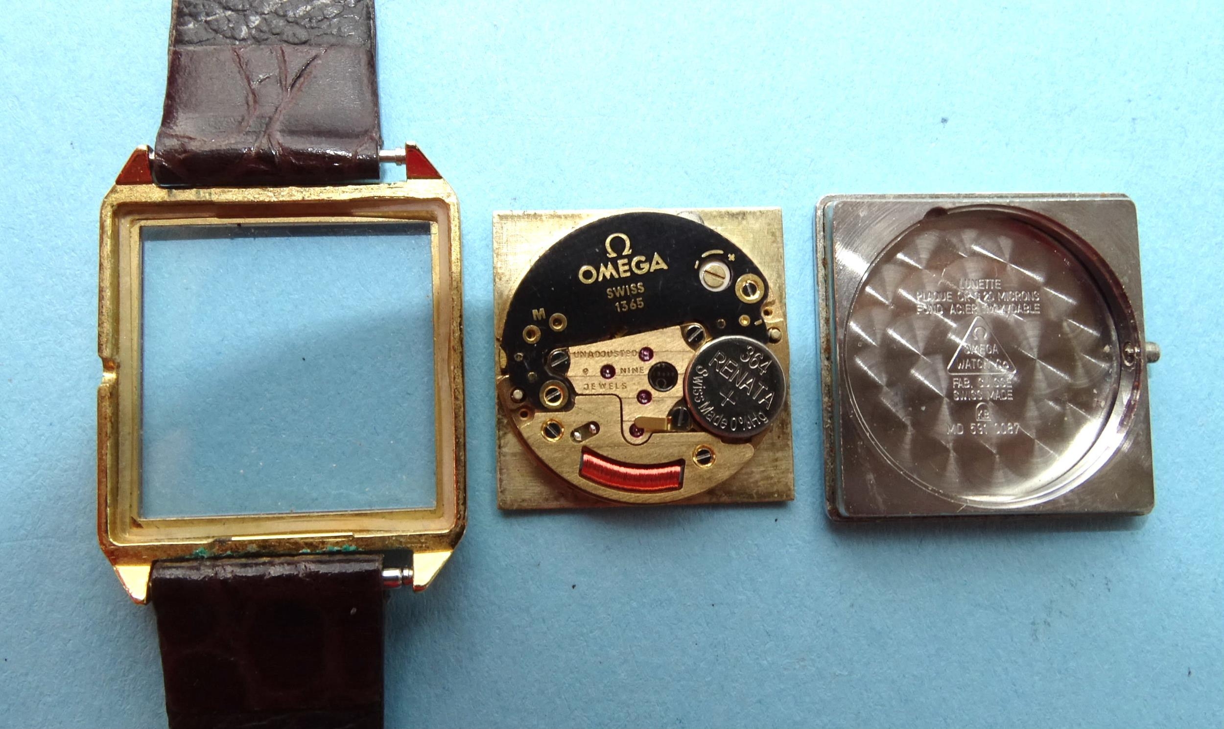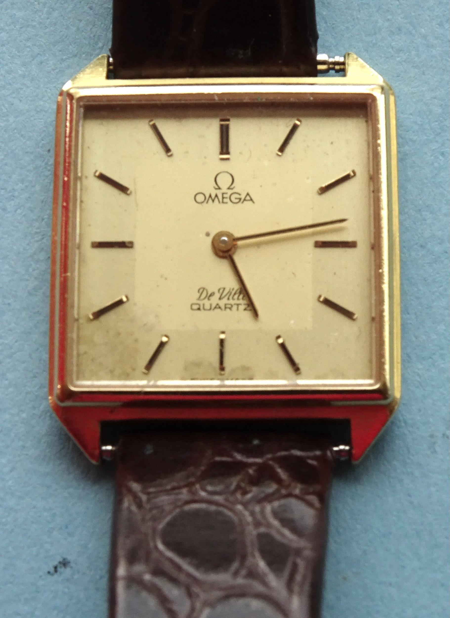 Omega De Ville, a lady's square face gold-plated wrist watch with quartz movement (untested), numbered 1365 on back, (some discolouration to dial), on leather strap.