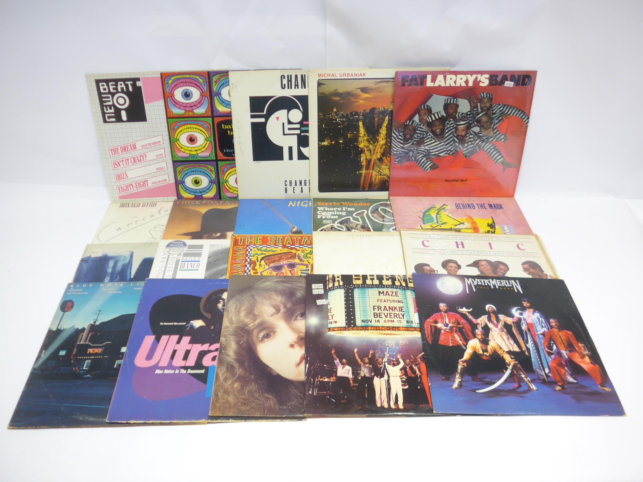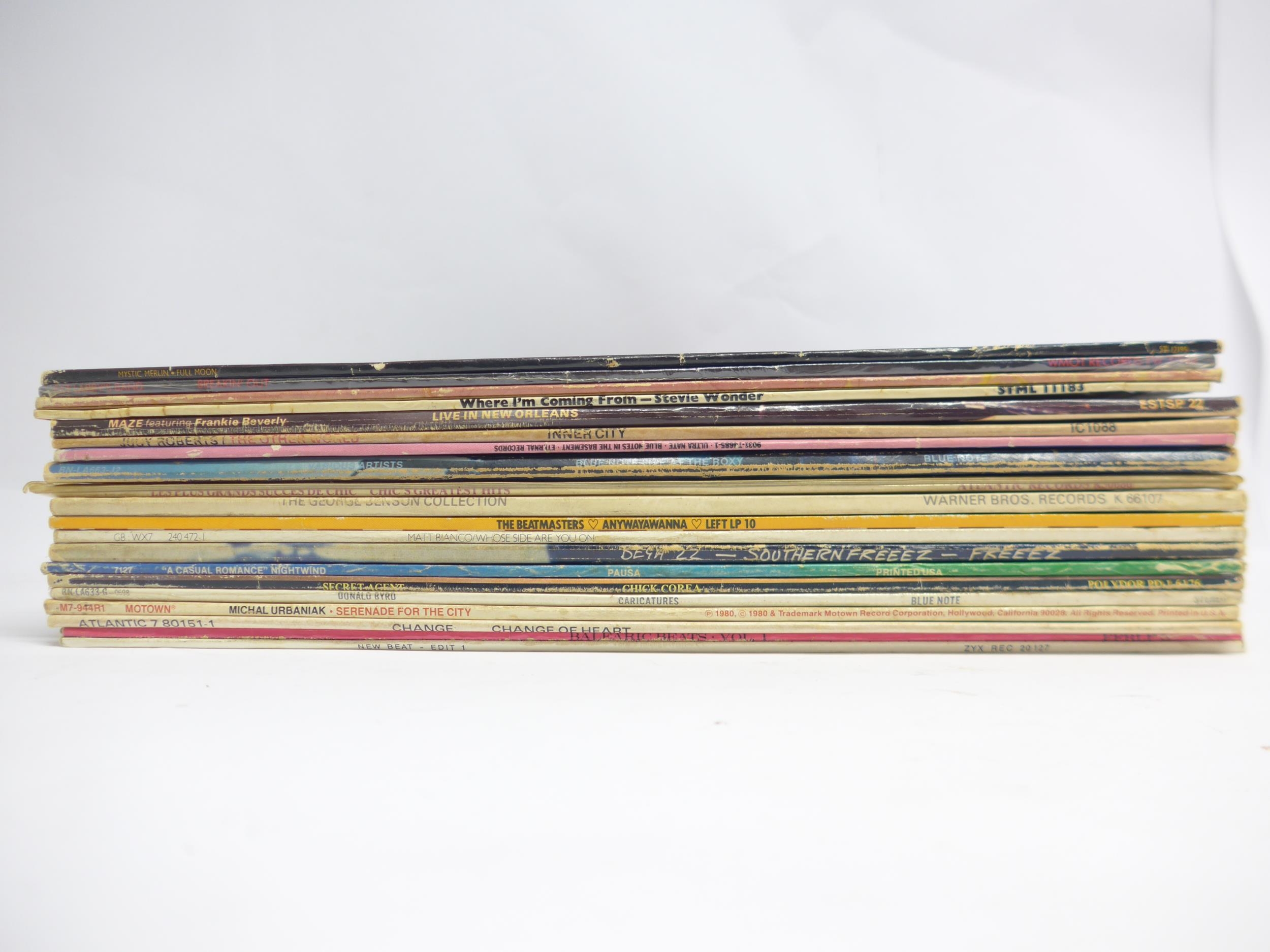 Jazz-Funk / Disco / Soul / House - A collection of twenty LPs to include MYSTIC MERLIN: 'Full Moon' (Capitol Records ST-12195), THE WARRIORS: 'Behind The Mask' (Ensign ENVY 6001), FAT LARRY'S BAND: 'Breakin Out' (WMOT Records FW 37968), CHIC: 'Les Pus Grands Succes De Chic (Chic's Greatest Hits' (Atlantic K 50686), CHICK COREA: 'Secret Agent' (Polydor PD-1-6176), NIGHTWIND: 'A Casual Romance' (Pausa Records PR 7127), STEVIE WONDER: 'Where I'm Coming From' (Tamla Motown STML 11183), FREEZ: 'Southern Freeez' (Beggars Banquet BEGA 22), MATT BIANCO: 'Whose Side Are You On' (WEA 240 472-1), THE BEATMASTERS: 'Anywayawanna' (Rhythm King LEFT LP 10), MICHAEL URBANIAK: 'Serebade For The City' (Motown M7-944R1), DONALD BYRD: 'Caricatures' (Blue Note BN-LA633-G), MAZE FEATURING FRANKIE BEVERLY: 'Live In New Orleans' (Capitol Records ESTSP 22), JUDY ROBERTS: 'The Other World' (Inner City Records IC 1088), GEORGE BENSON: 'The George Benson Collection' (Warner Bros. K 66107), ULTRA NATE: 'Blue Notes In The Basement' (Eternal WX410), CHANGE: 'Change Of Heart' (RFC Records 80151-1), and compilations comprising 'Balaeric Beats The Album Volume 1' (FFRR 828 118-1), 'Blue Note Live At The Roxy' (Blue Note BN-LA663-J2) and 'New Beat - Edit 1' (ZYX Records ZXY 20.127) (20, vinyl and sleeves VG-EX)