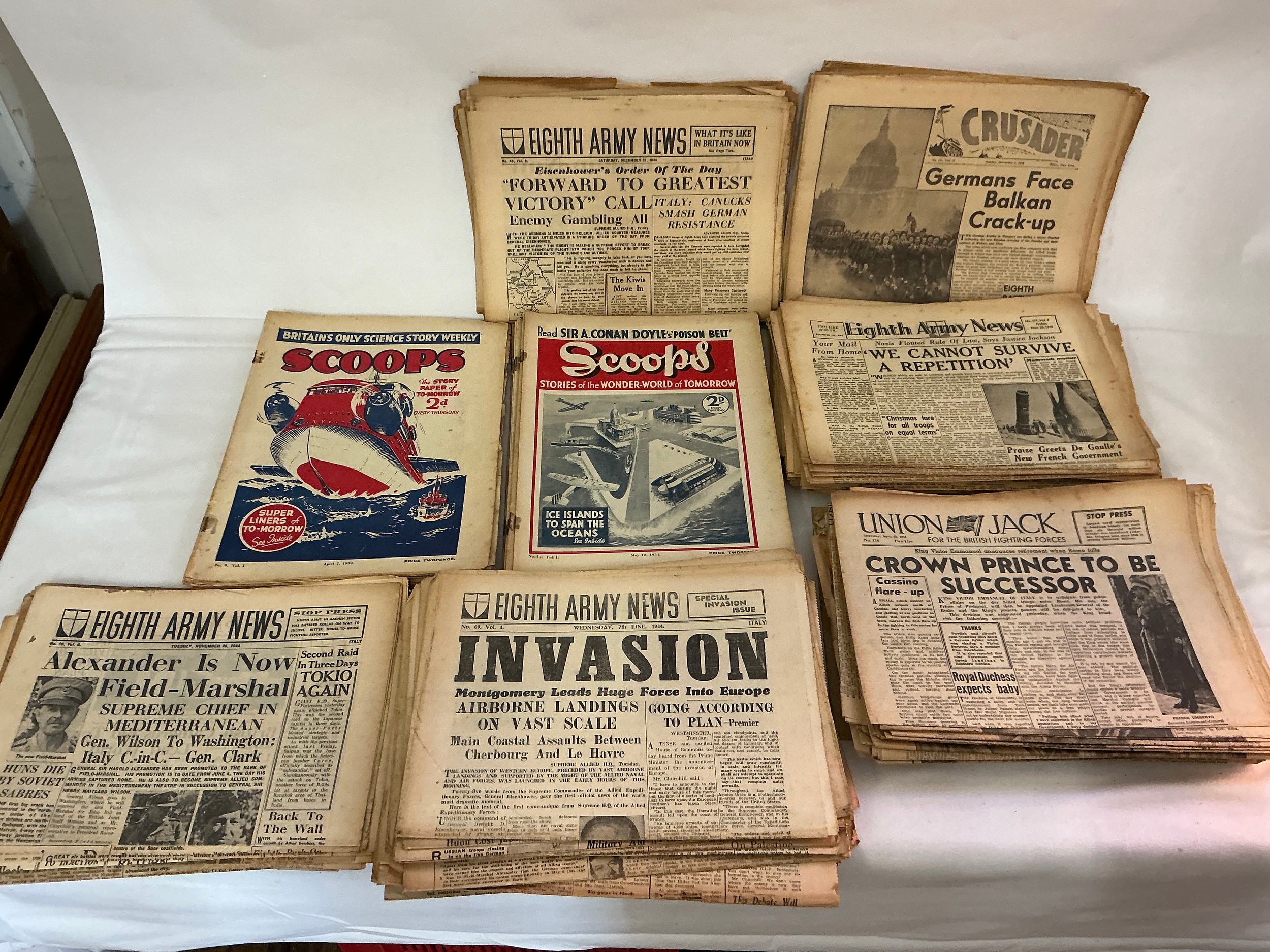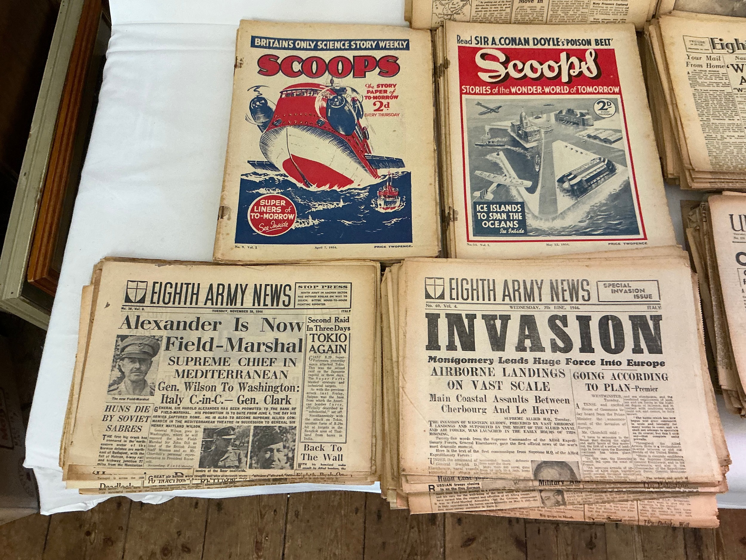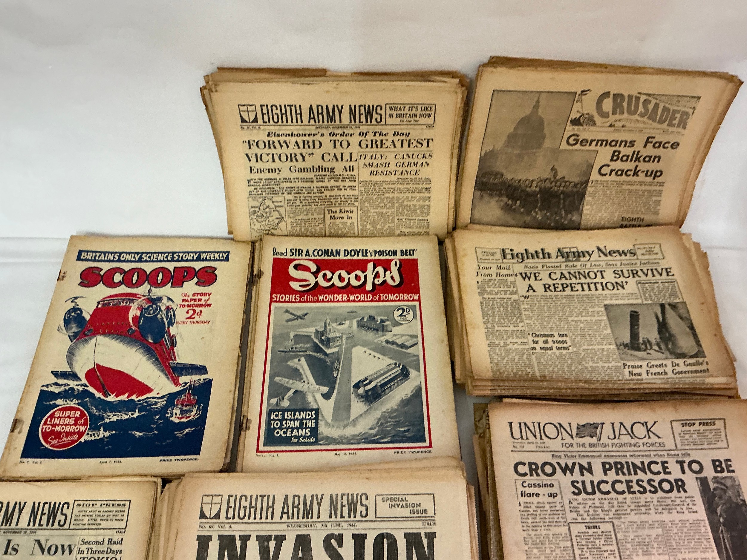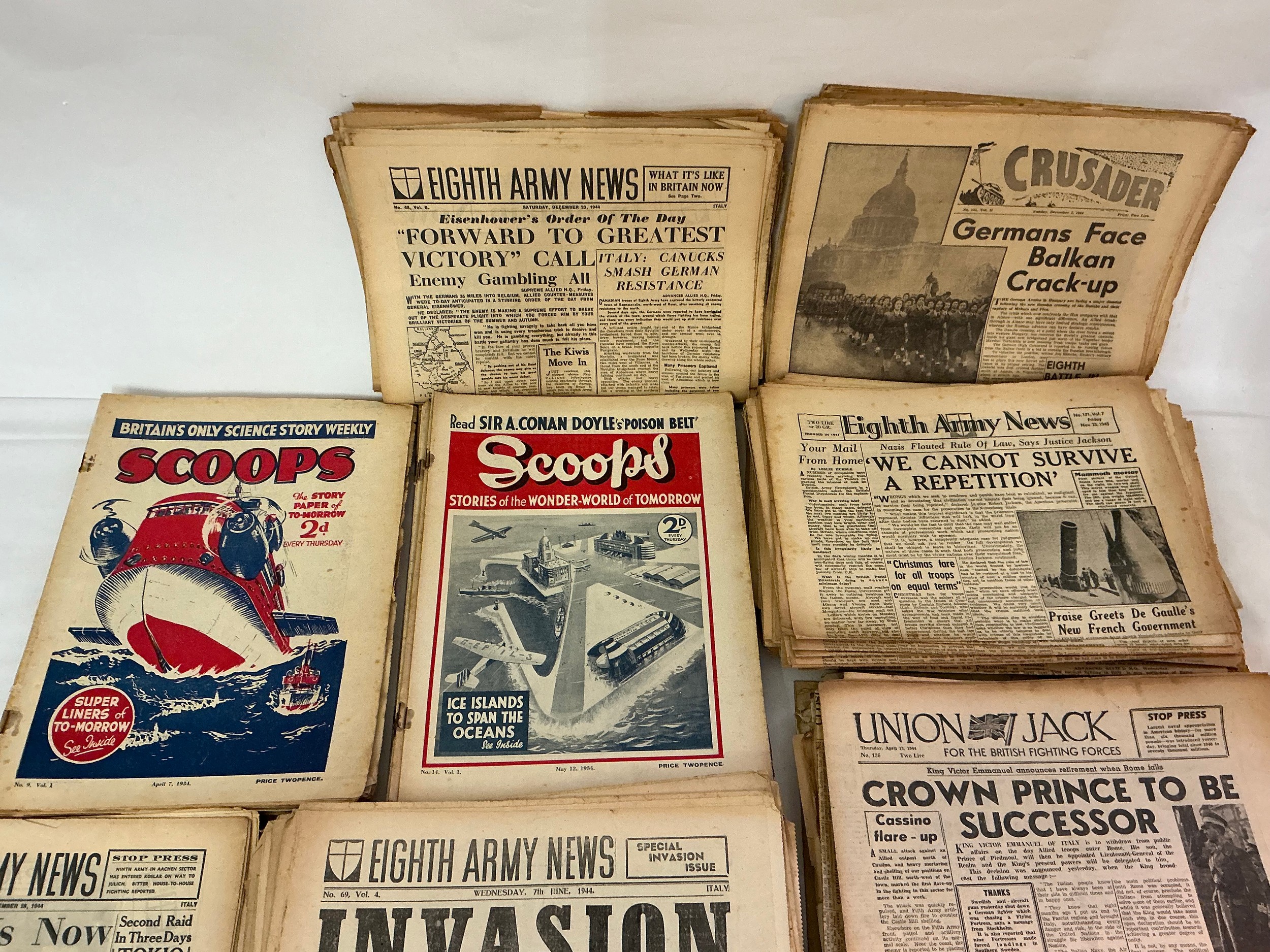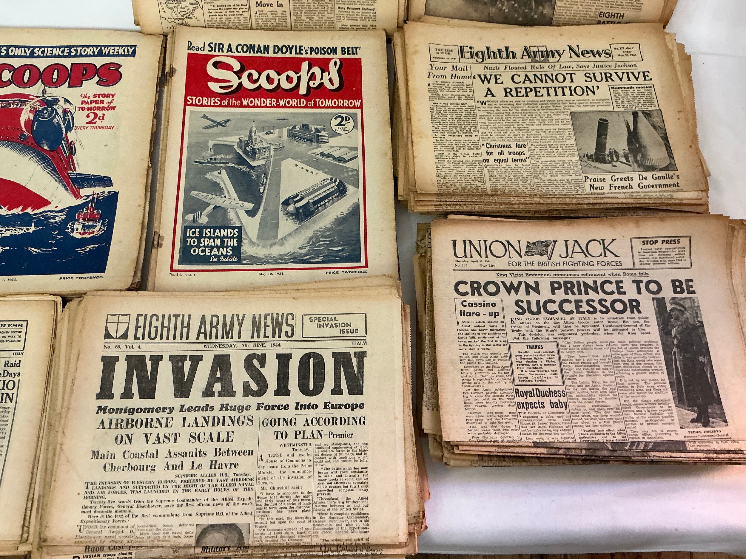 A Large Collection of Pre-War "Scoops" Comics, 1940s "Eighth Army News" Papers, "The Stars & Stripes" & 1940s "Union Jack" Newspapers.