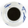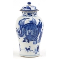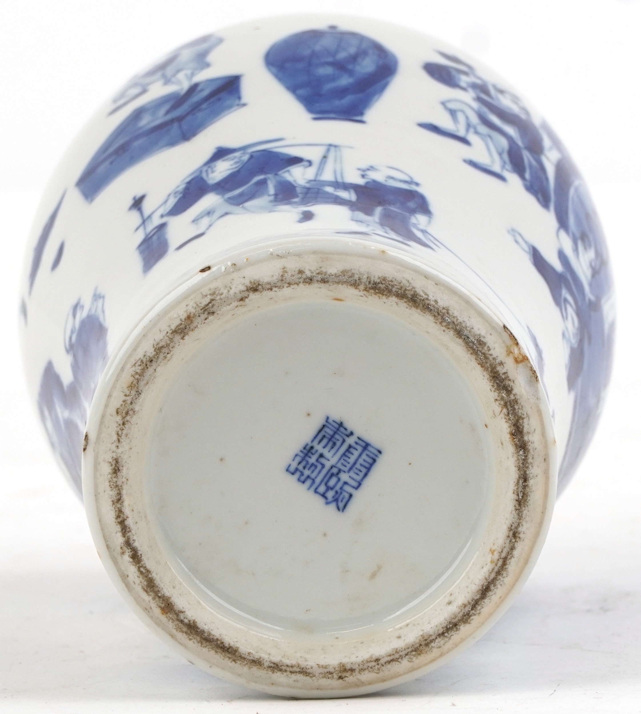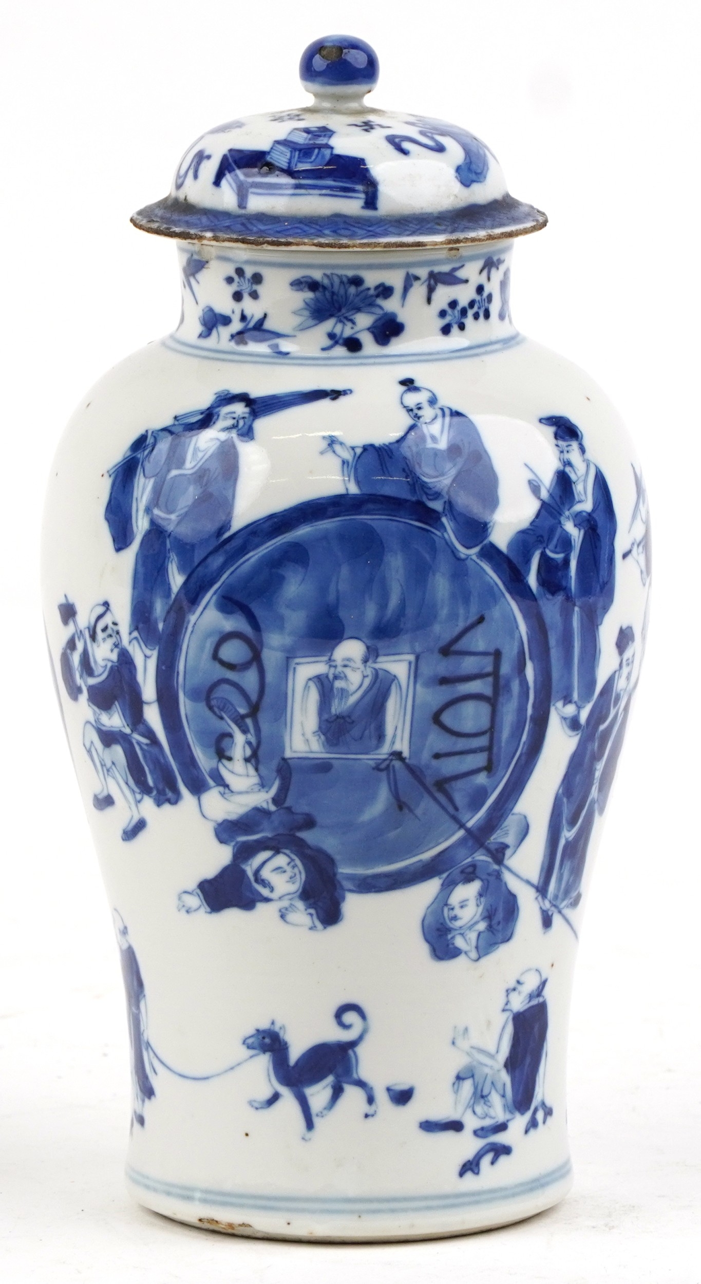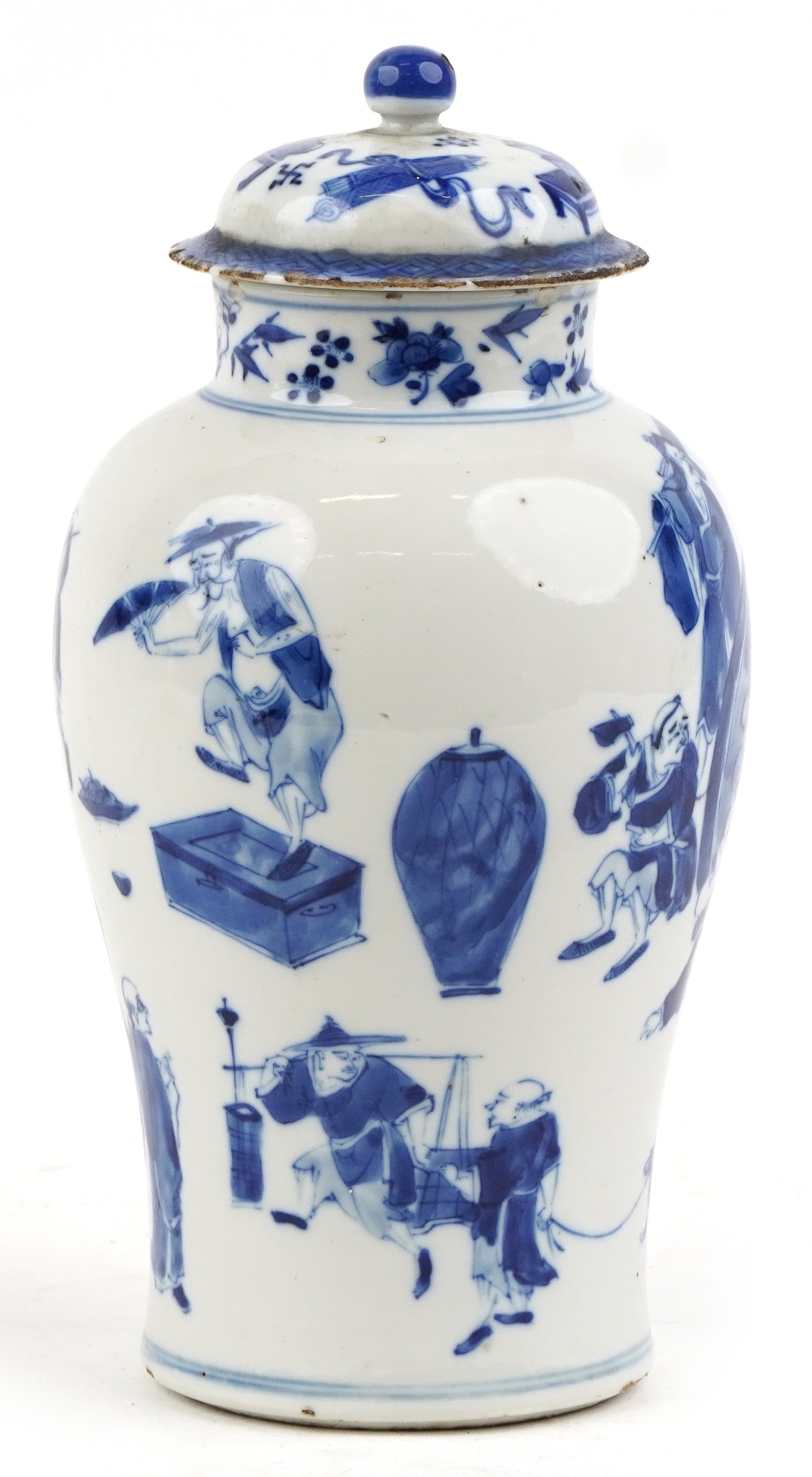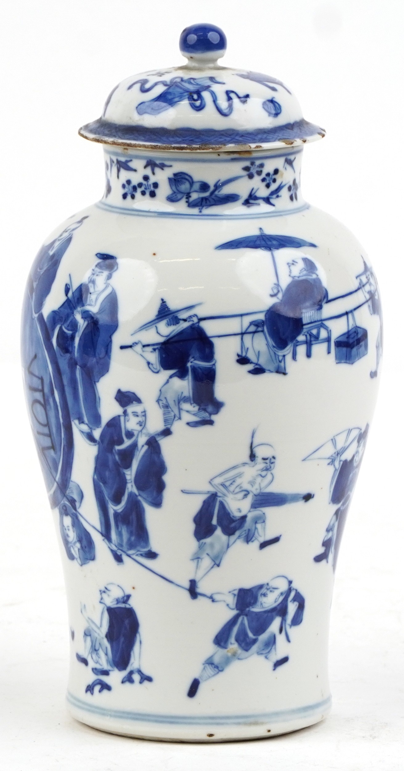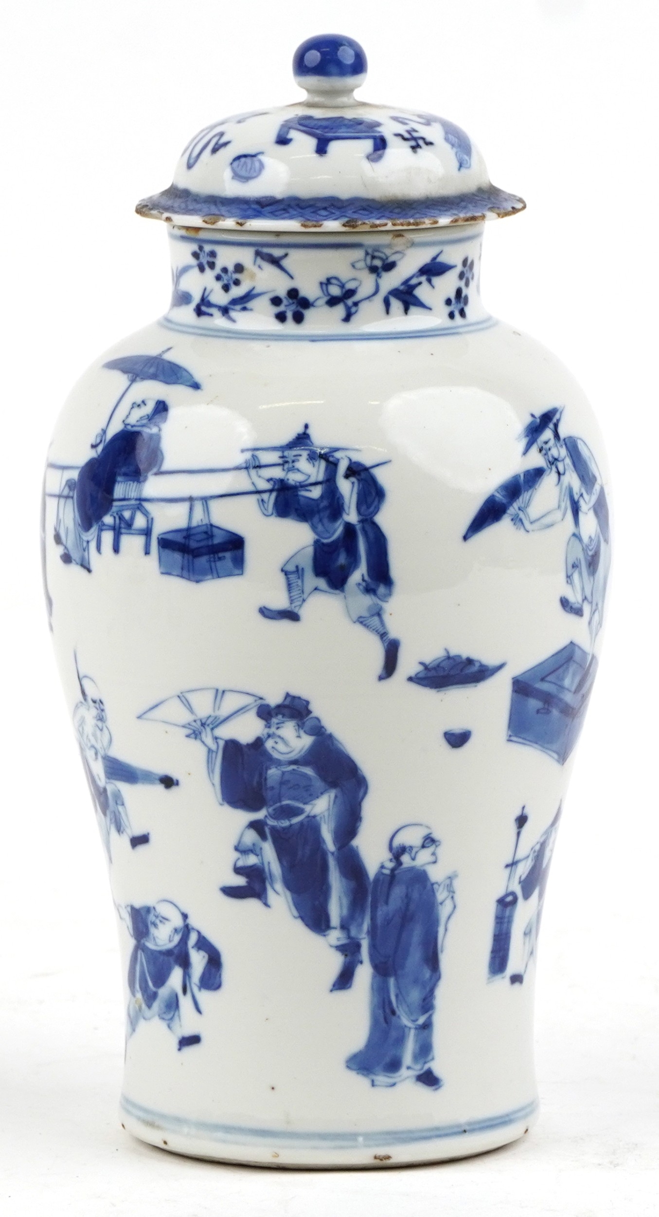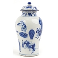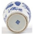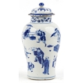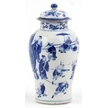 A Chinese porcelain blue and white baluster vase and cover hand painted with figures, character marks to the base, 26cm high.