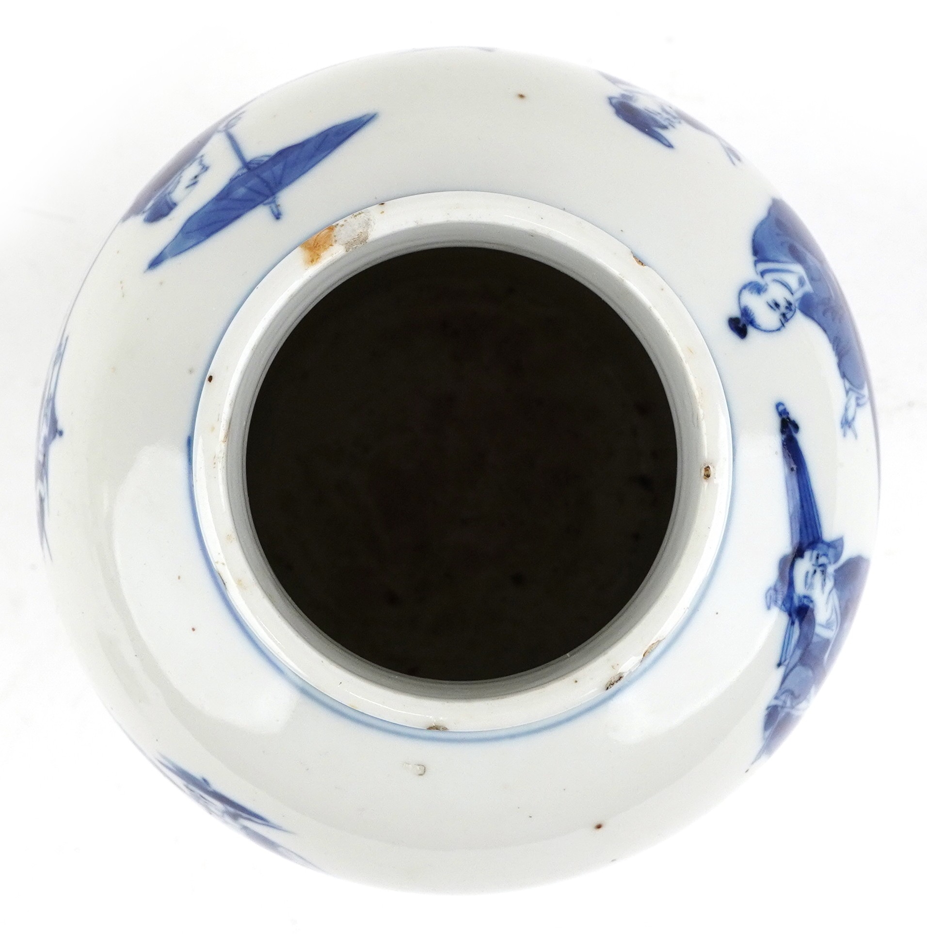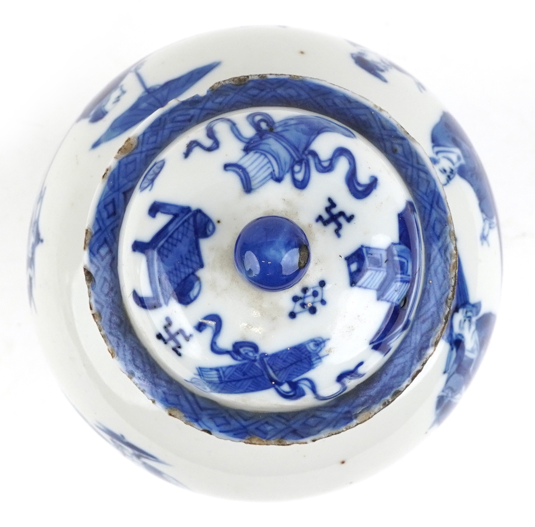 There are multiple small chips to the rim of the vase and around the lid. No other visible chips or cracks. As per the online images