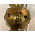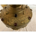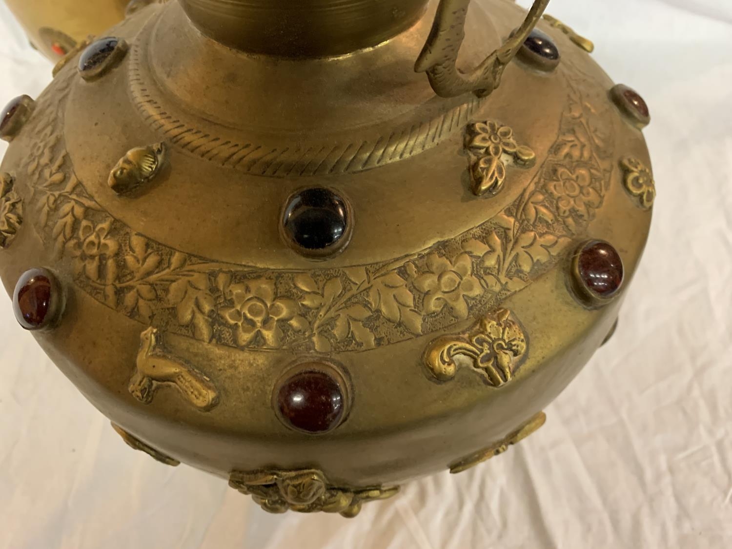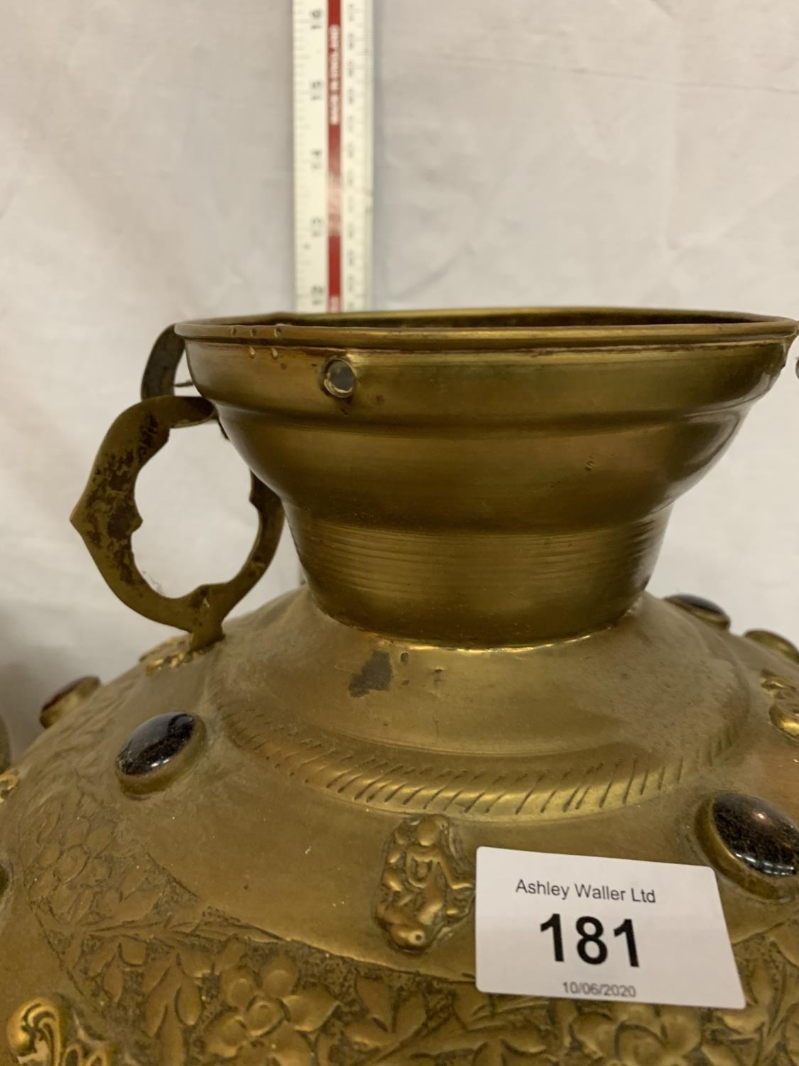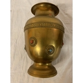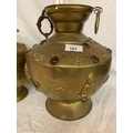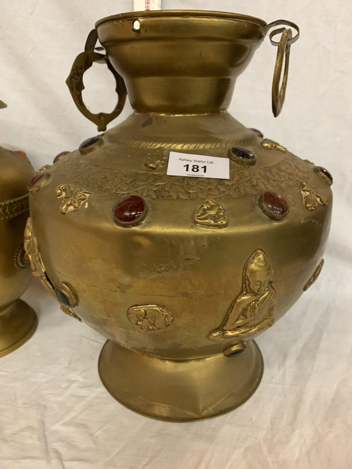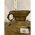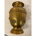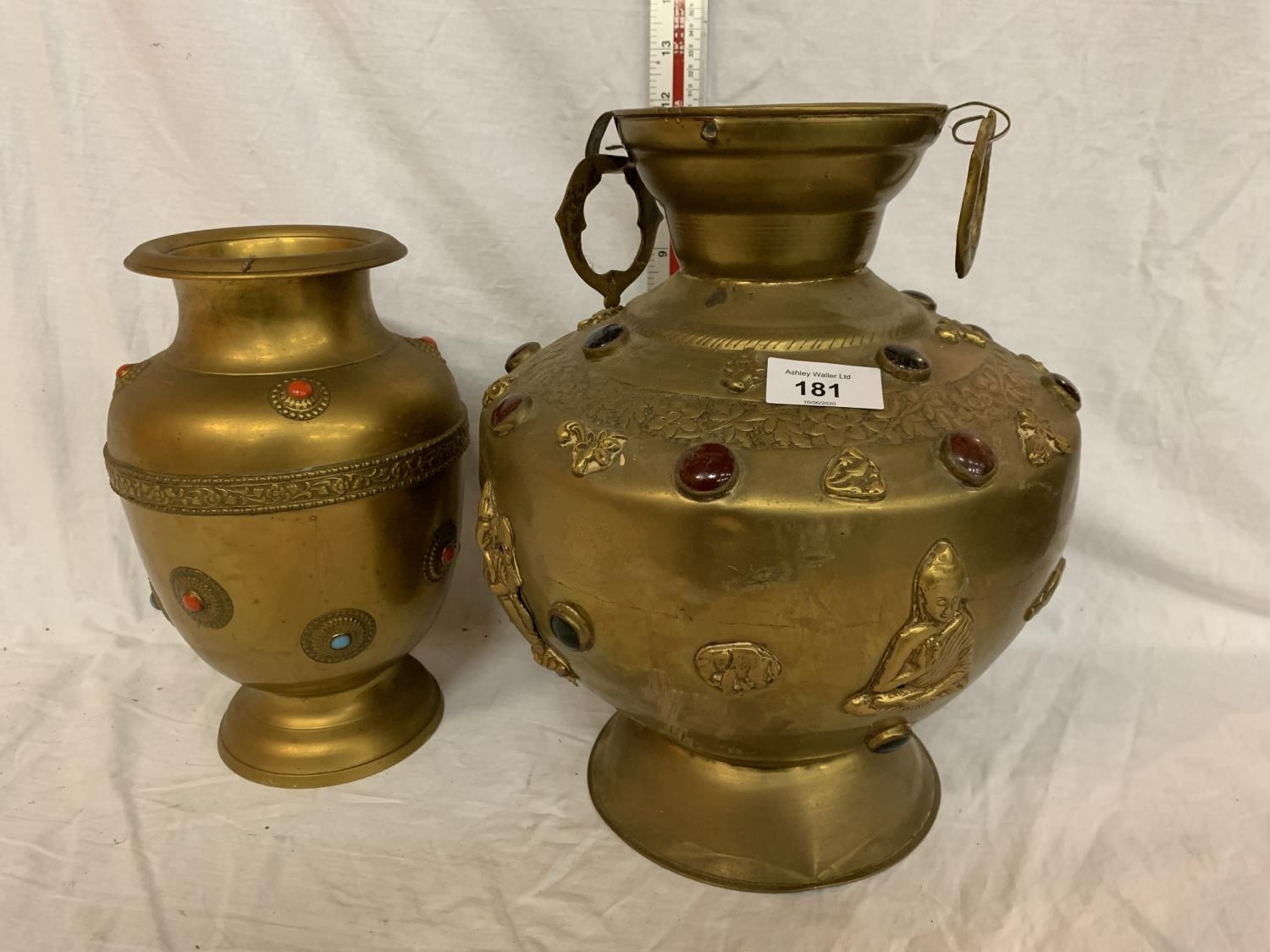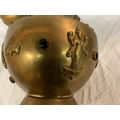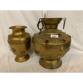 TWO LARGE BRASS POTS WITH ASSORTED STONES ONE WITH ORNATE DETAILING