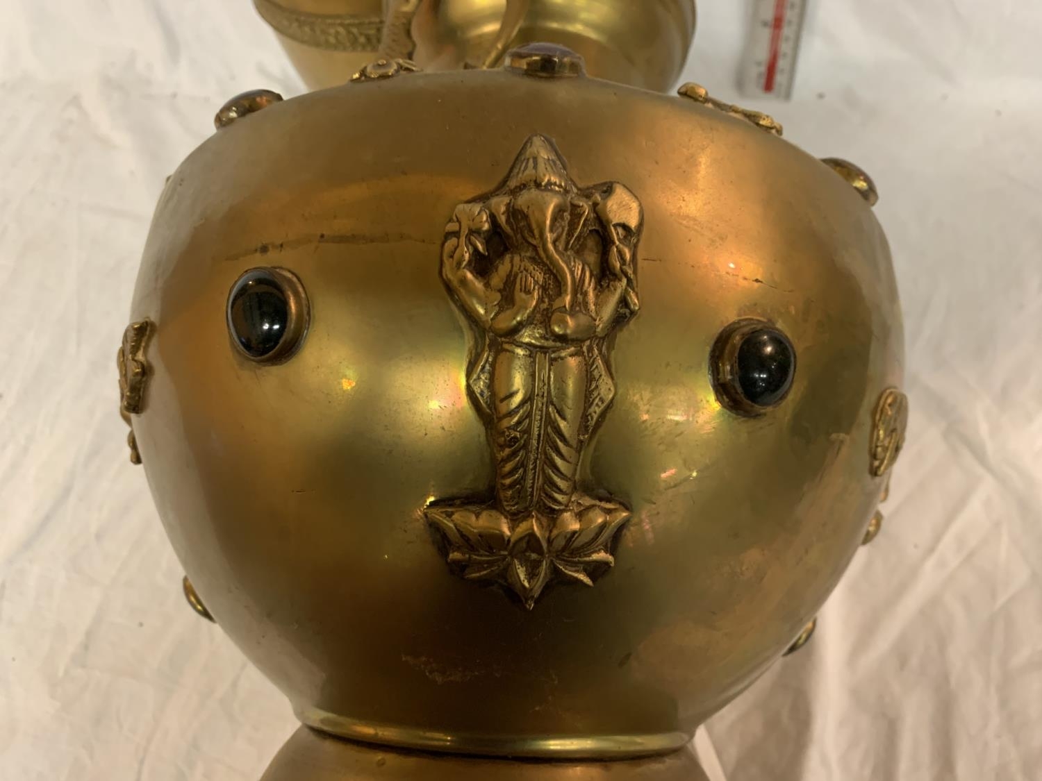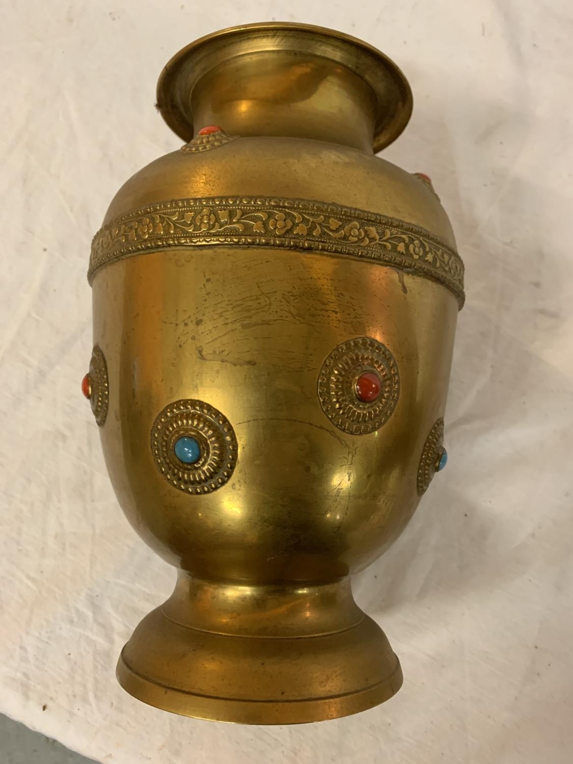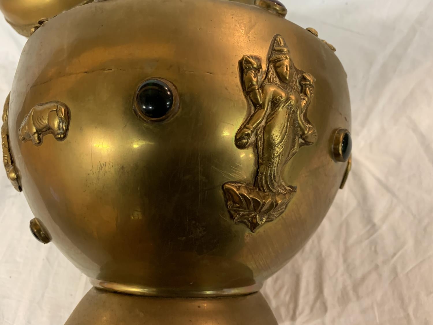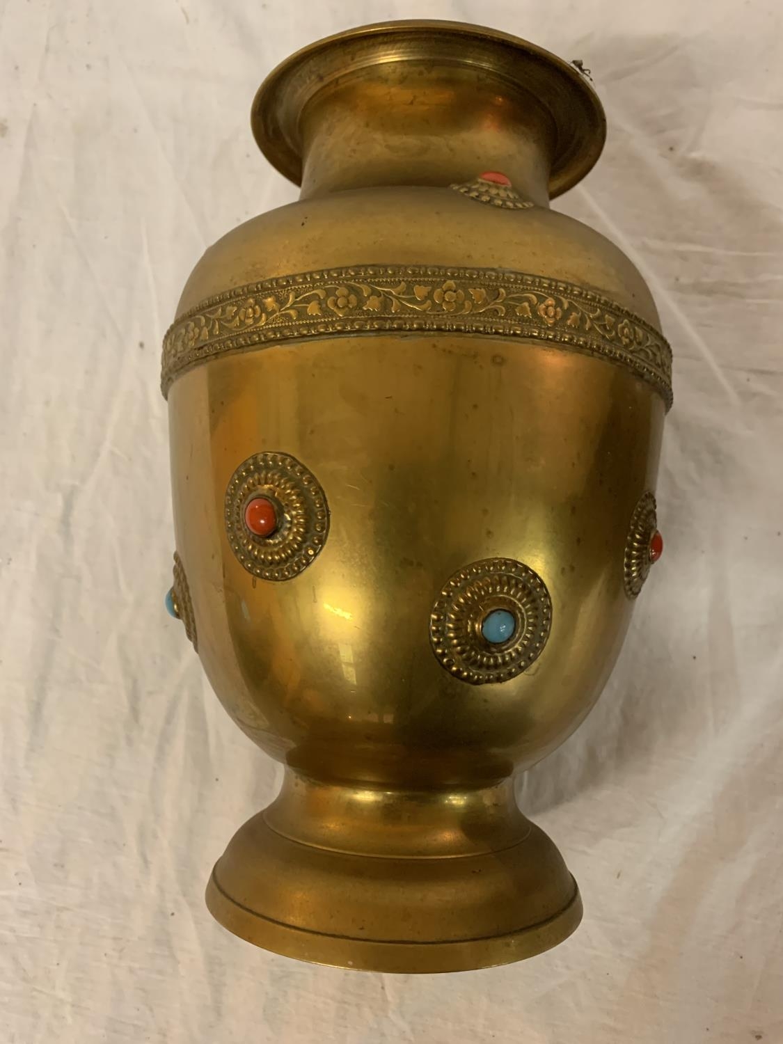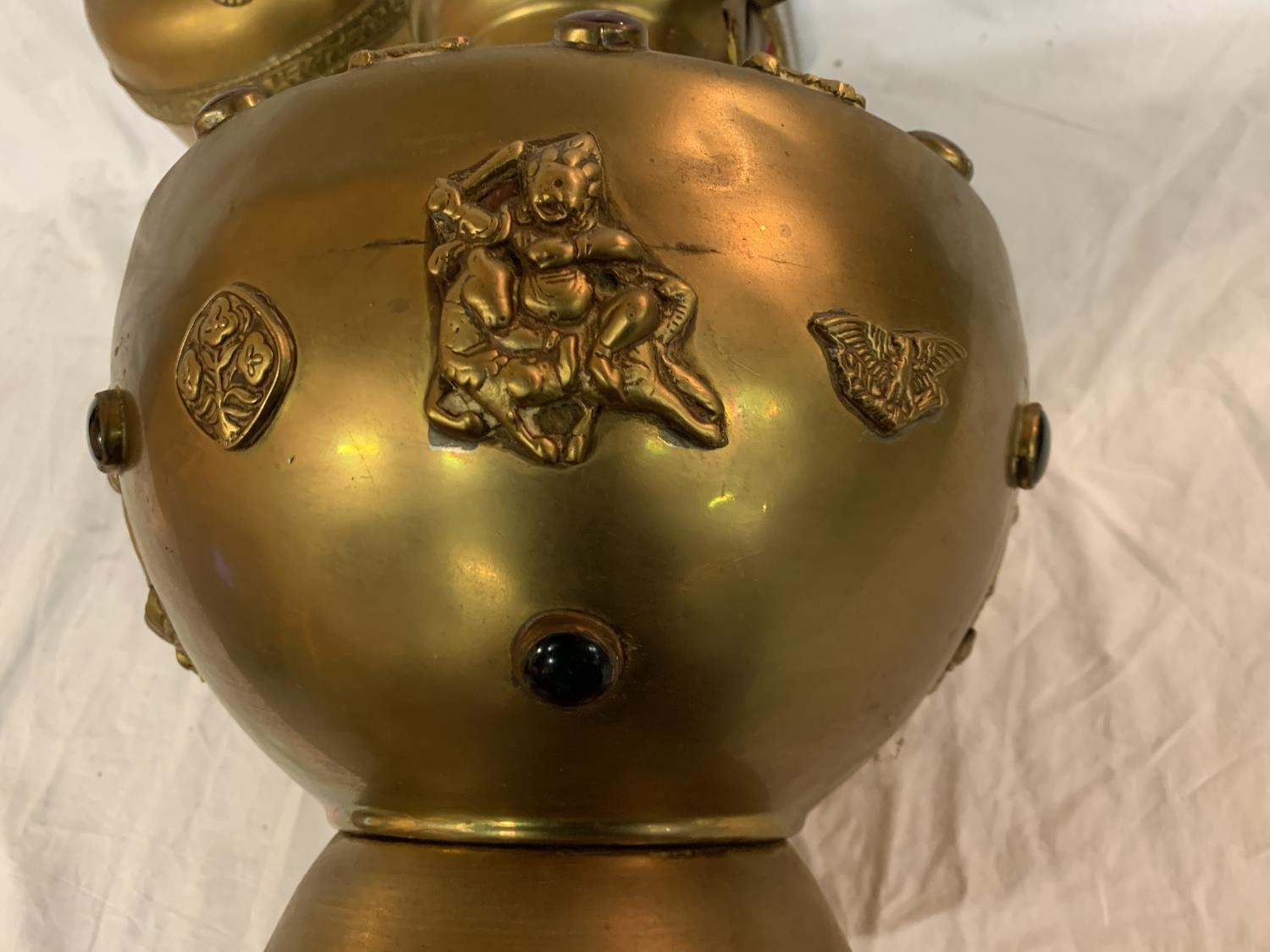 TWO LARGE BRASS POTS WITH ASSORTED STONES ONE WITH ORNATE DETAILING