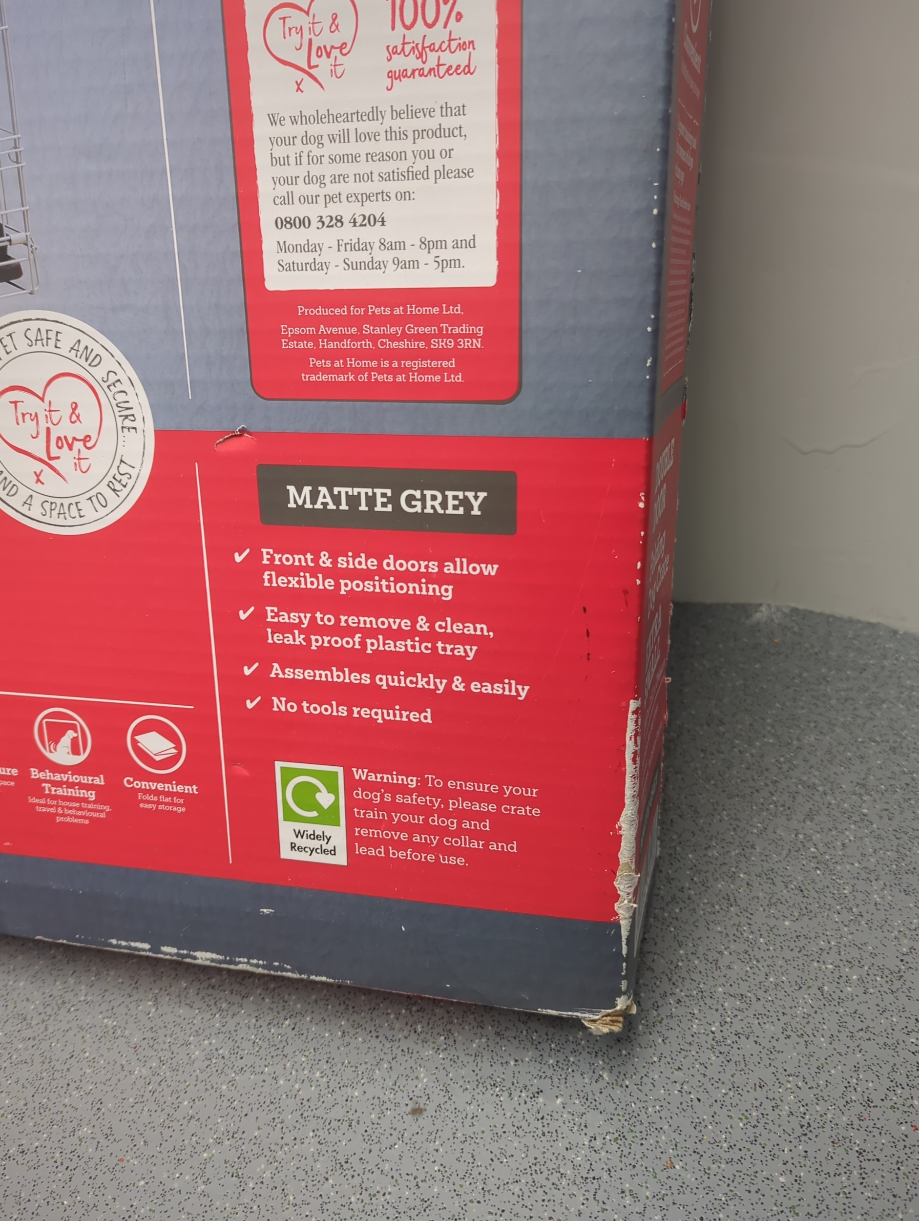 The Pets at Home Double Door Folding Dog Crate is designed for ease of use and security. It is suitable for extra small breeds and features two doors for flexible positioning. The crate includes an easy-to-remove plastic tray and assembles quickly without tools.