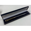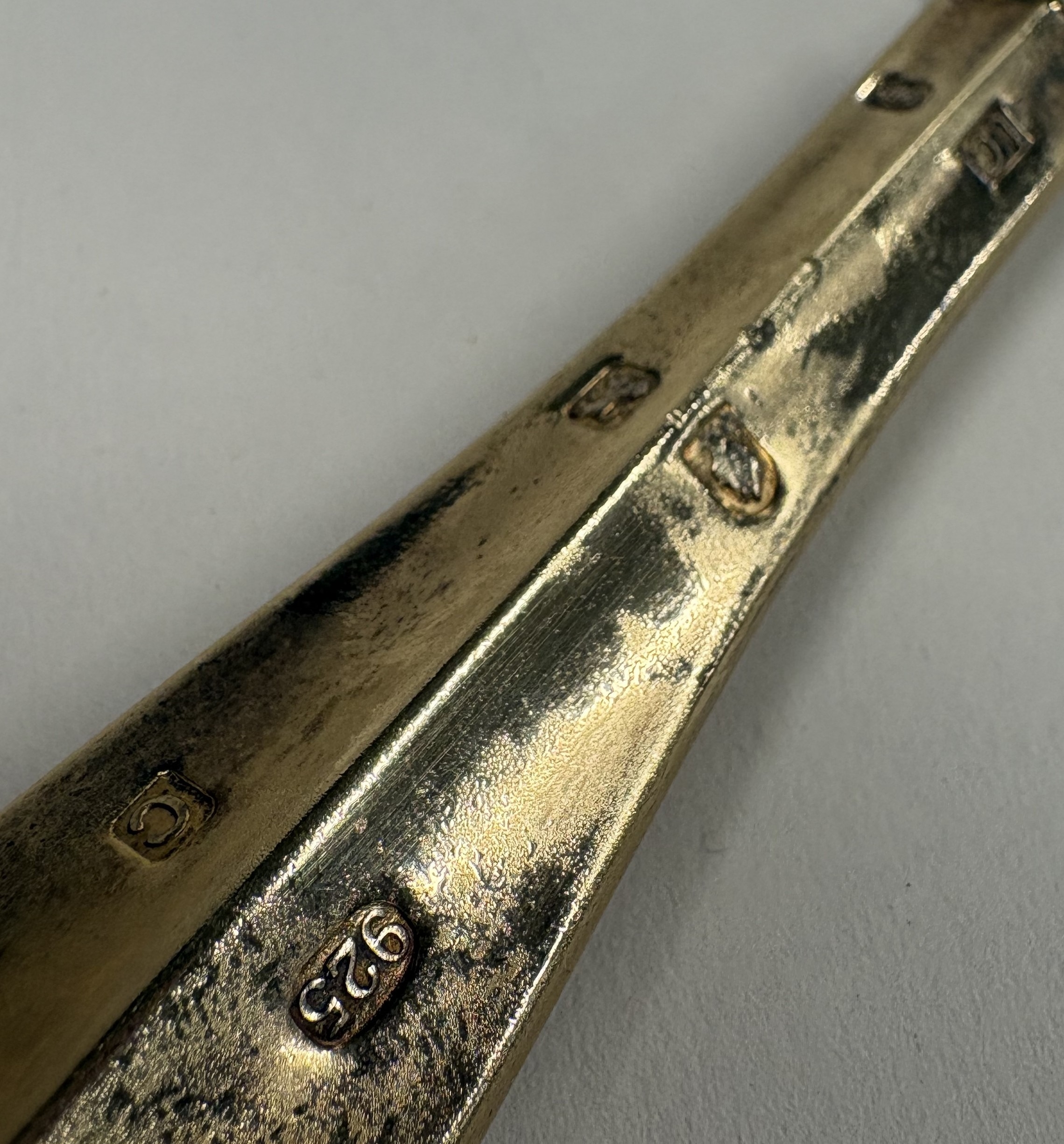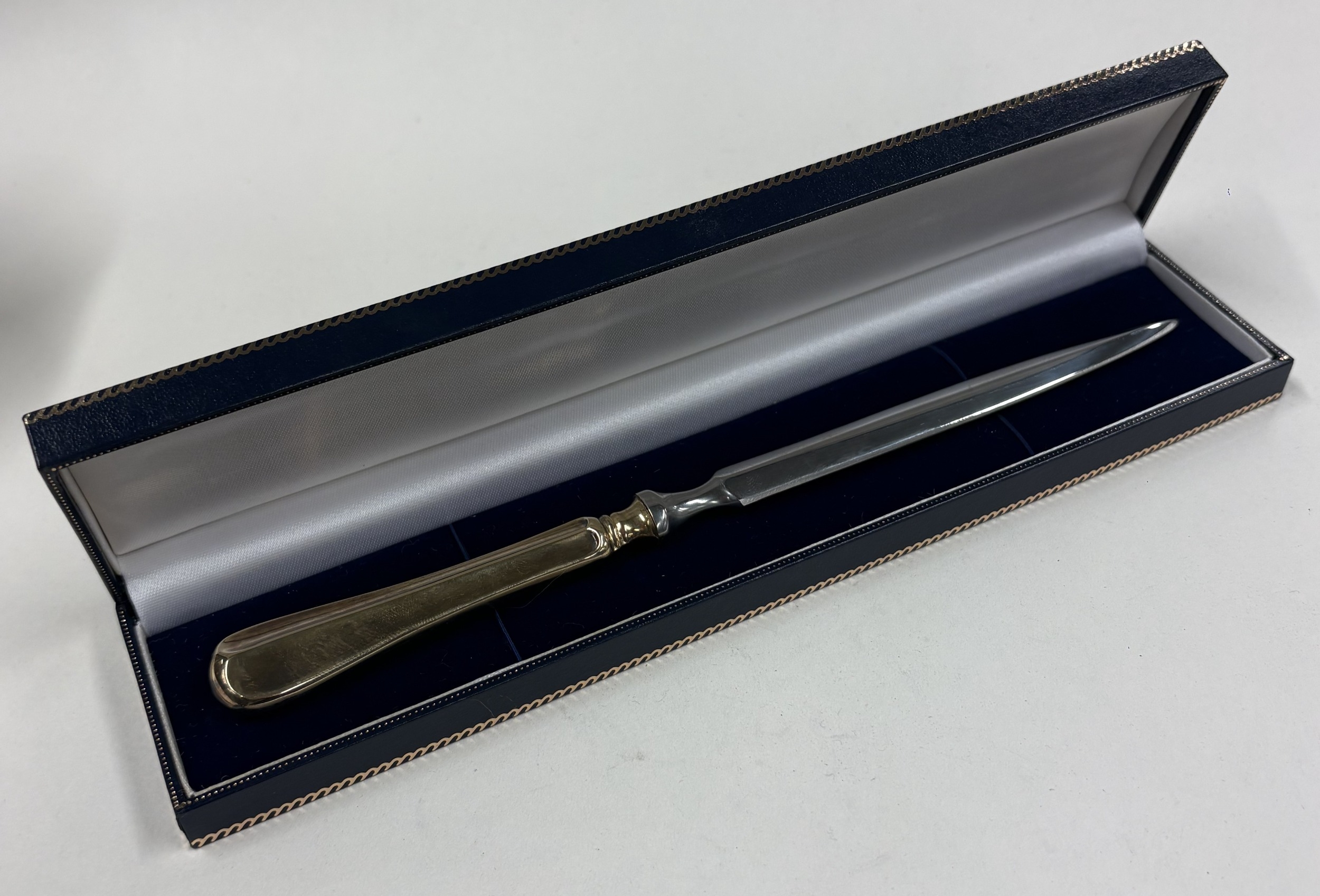 A silver letter opener with gilt handle contained within case. Approx. 63 grams. Est. £50 - £80.