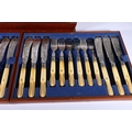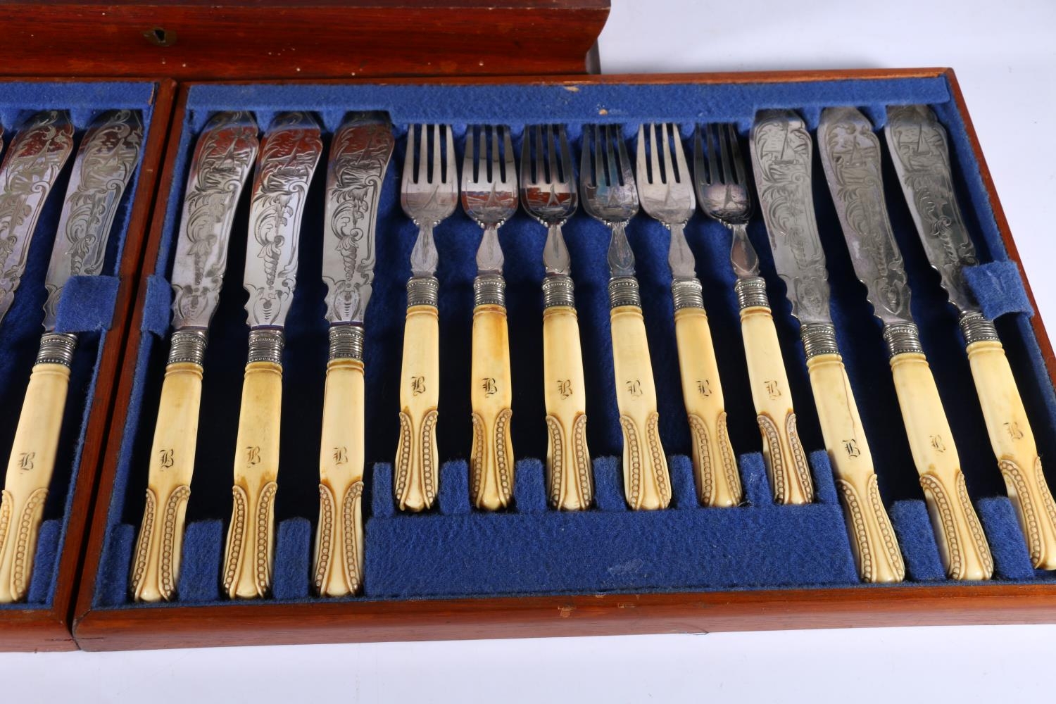 Canteen of eighteen fish knives and forks with engraved blades decorated with sailing boat having carved ivory handles in mahogany case with Crouch of Edinburgh label