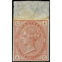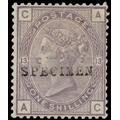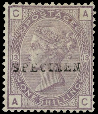 1883 1s Purple Pl.13 (Comb Perf.14). Very fine unused o.g. example lettered AC overprinted ‘SPECIMEN” type 9. This scarce stamp was intended for surcharge but unissued. SG163. Cat. £8,250.