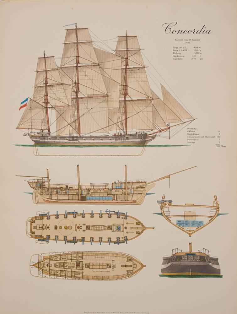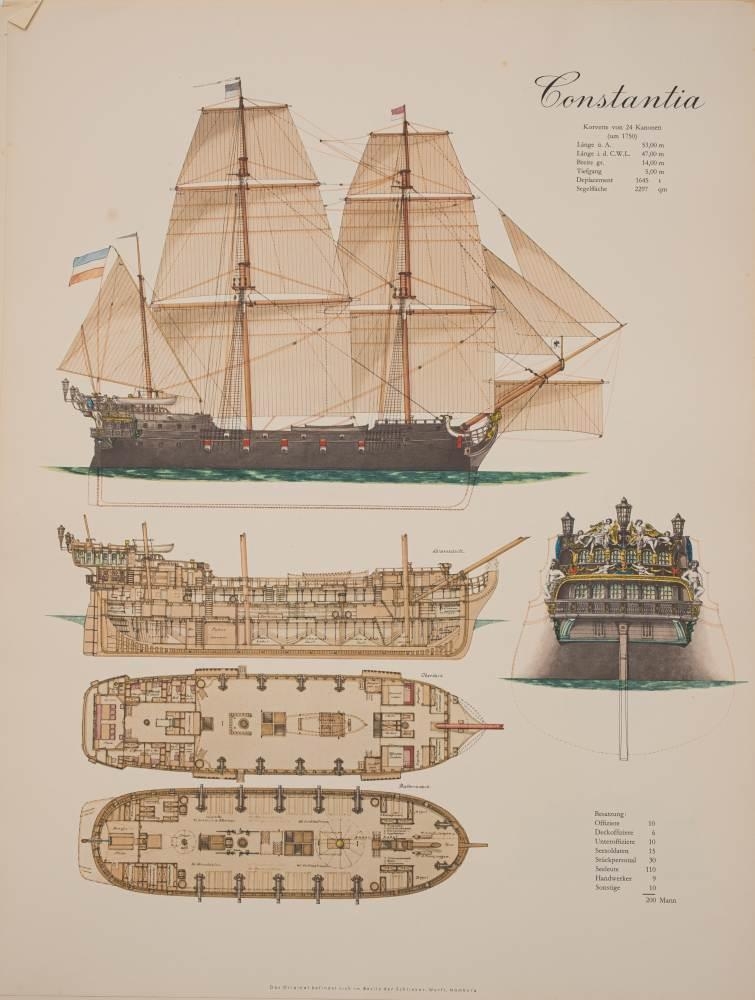 1962 Schliker-Werft Lines illustrations: for several ships including 'Constantia', 'Neptun', 'Nixe', 'Nymphe' and others.