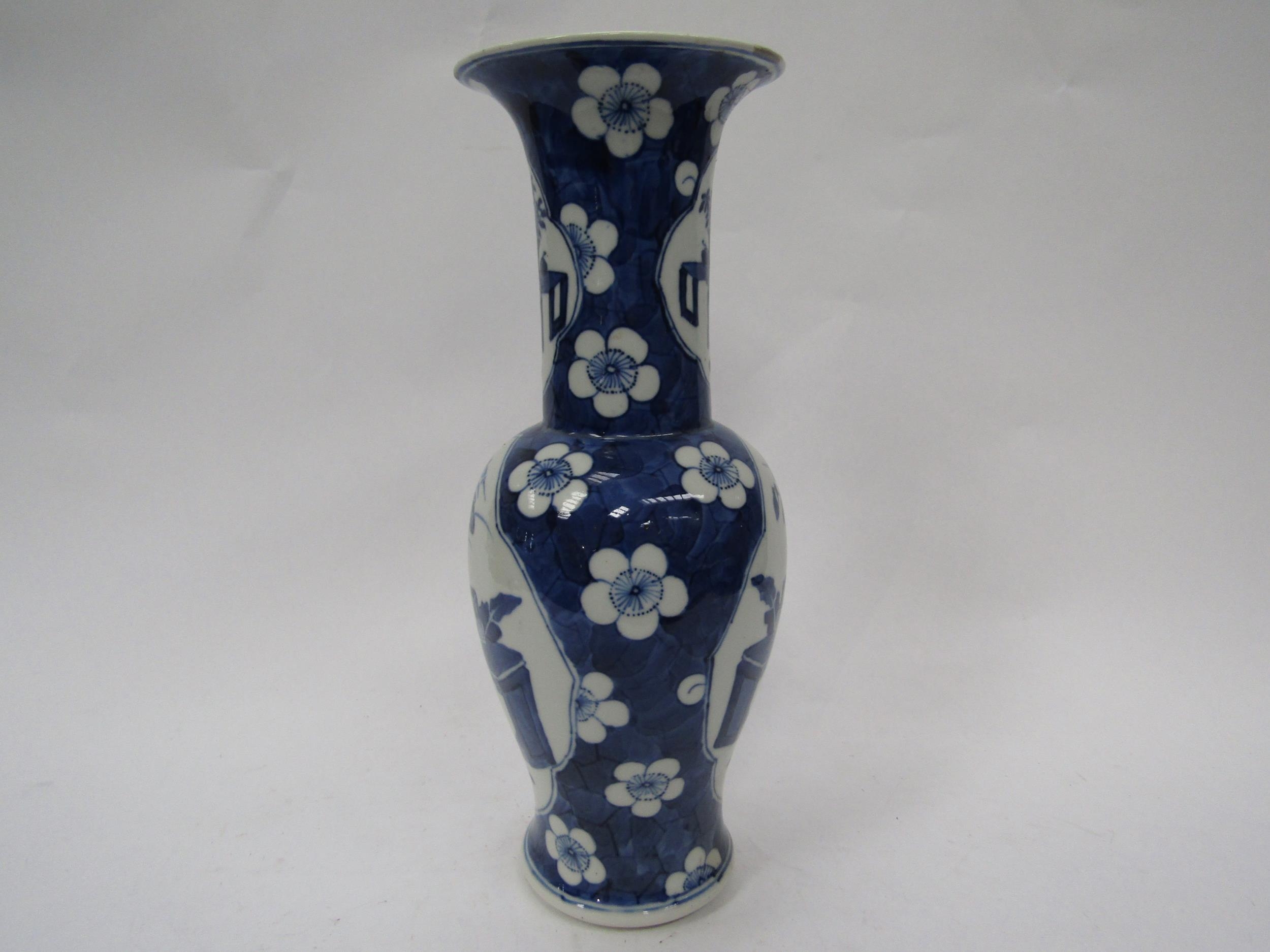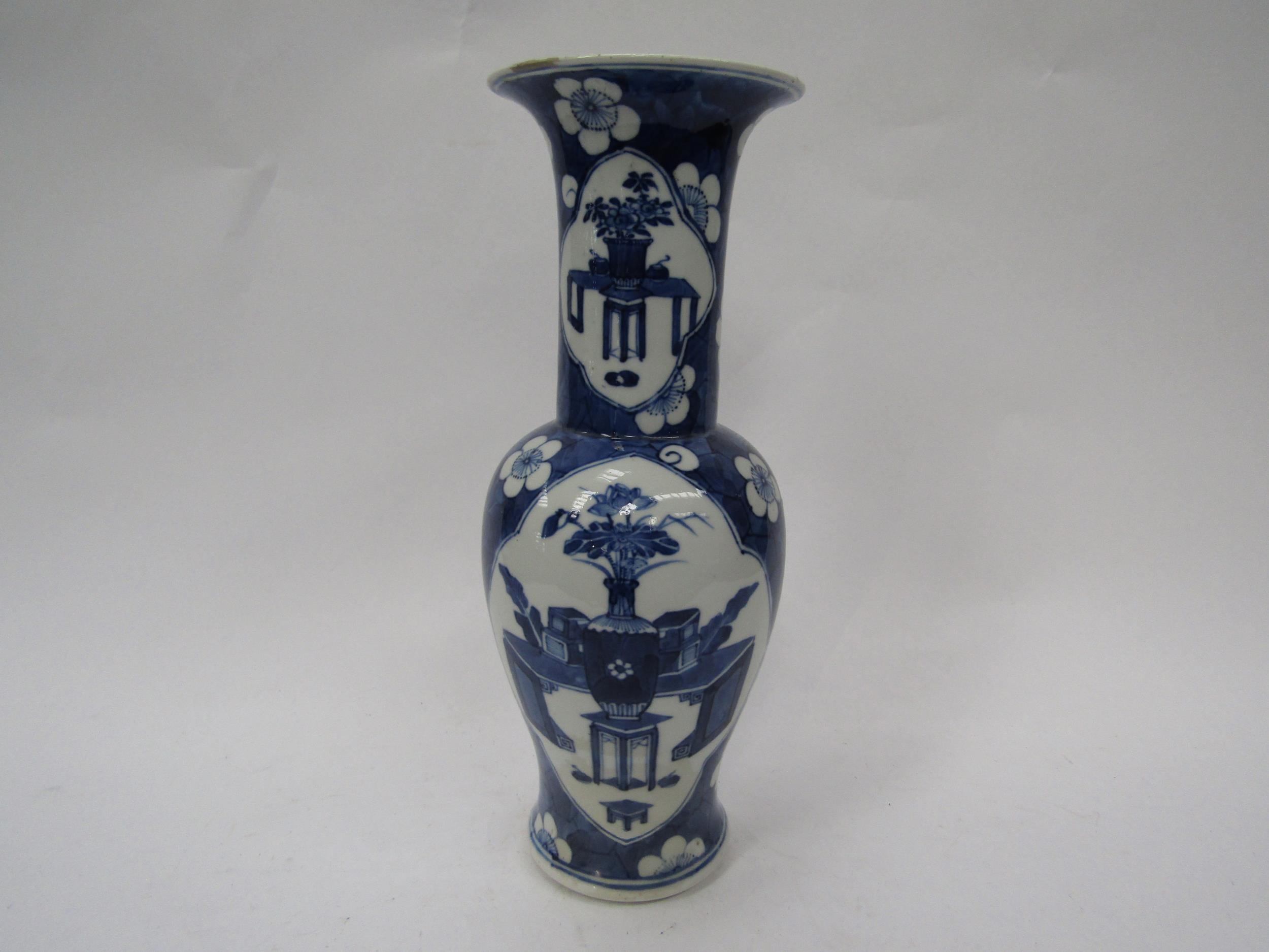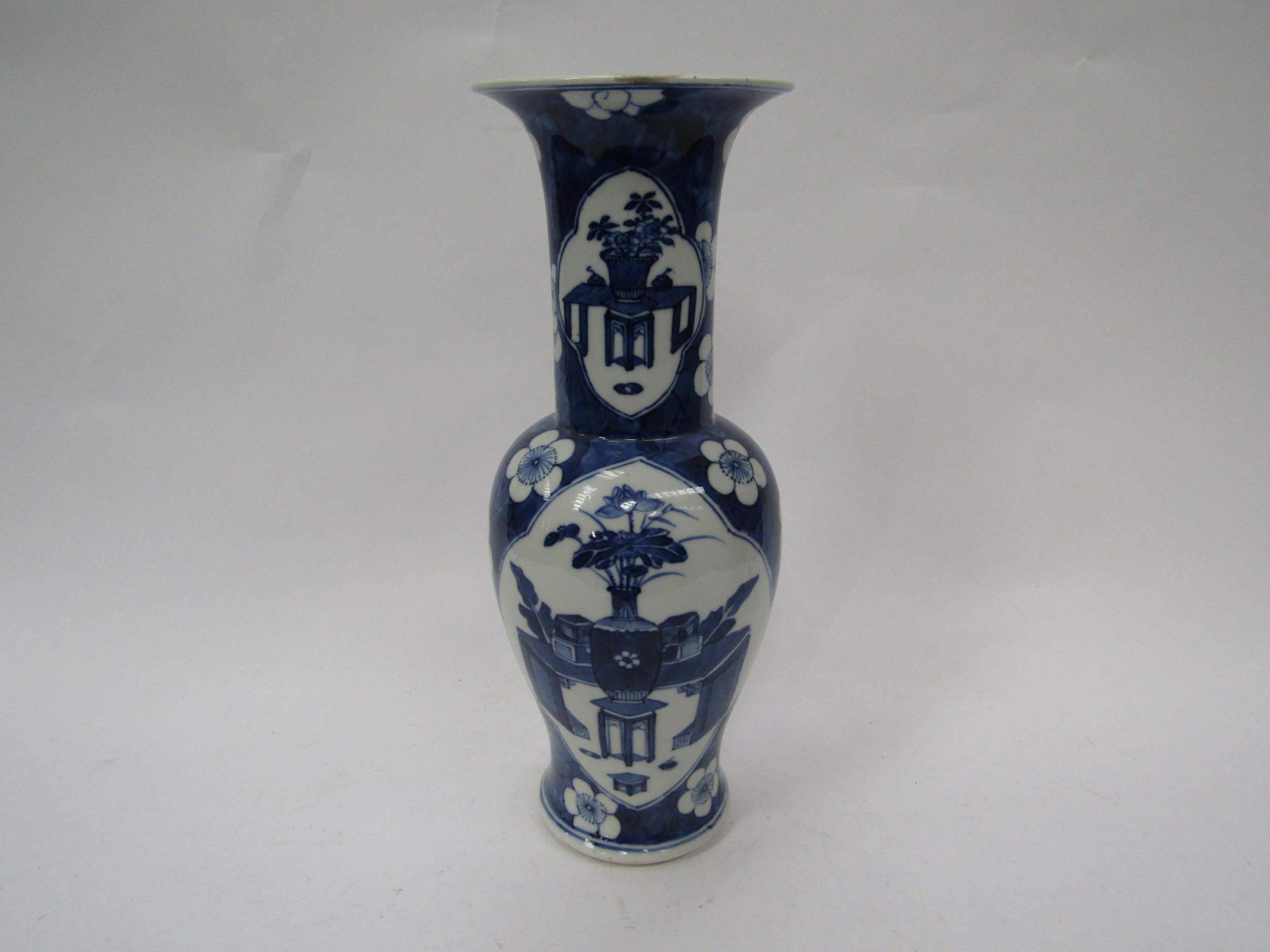 A Chinese blue and white vase with two cartouches depicting interior scene of vase of flowers and furniture, six character marks to base, two minor repairs to rim, 31cm