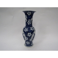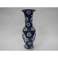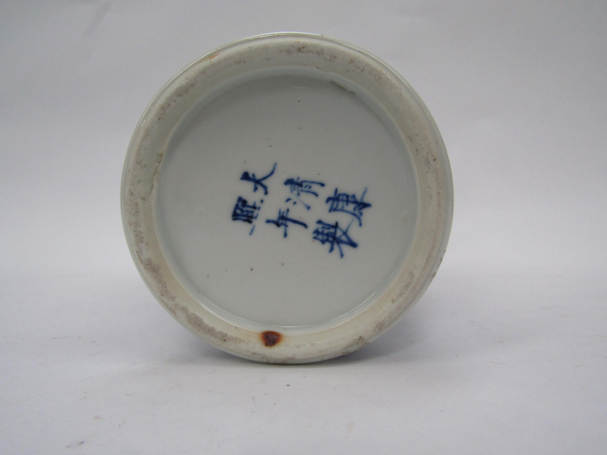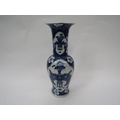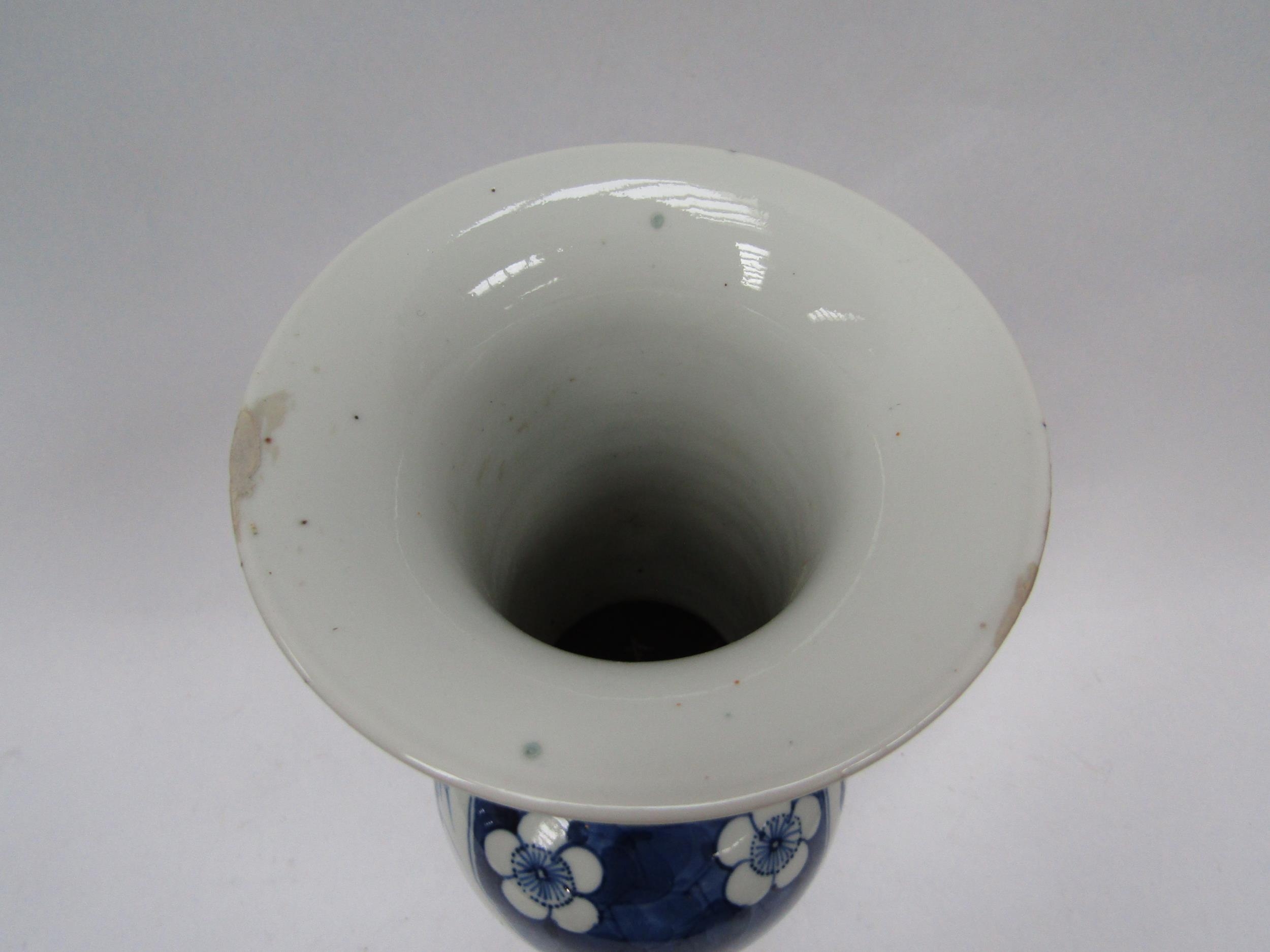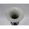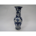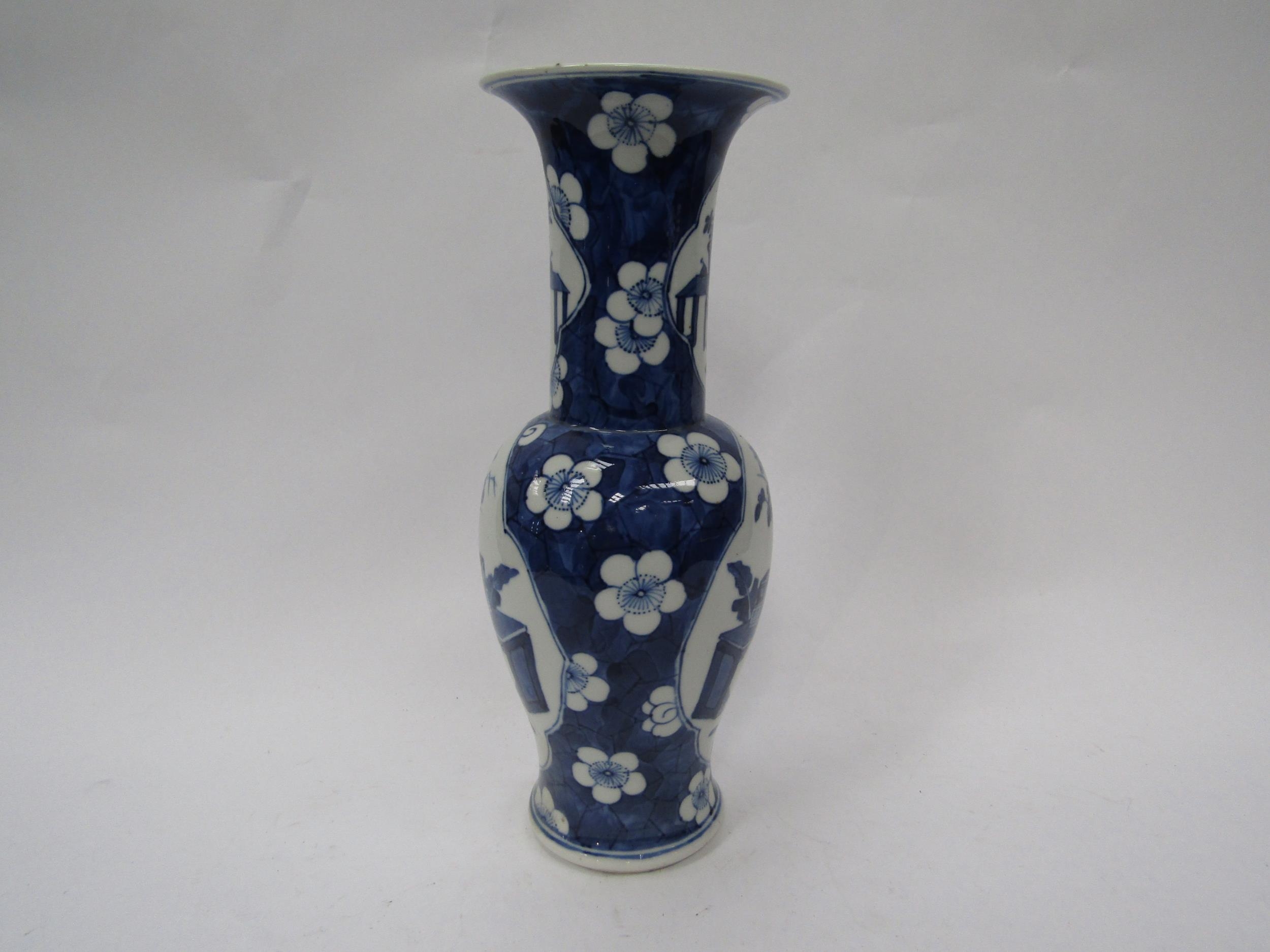 A Chinese blue and white vase with two cartouches depicting interior scene of vase of flowers and furniture, six character marks to base, two minor repairs to rim, 31cm