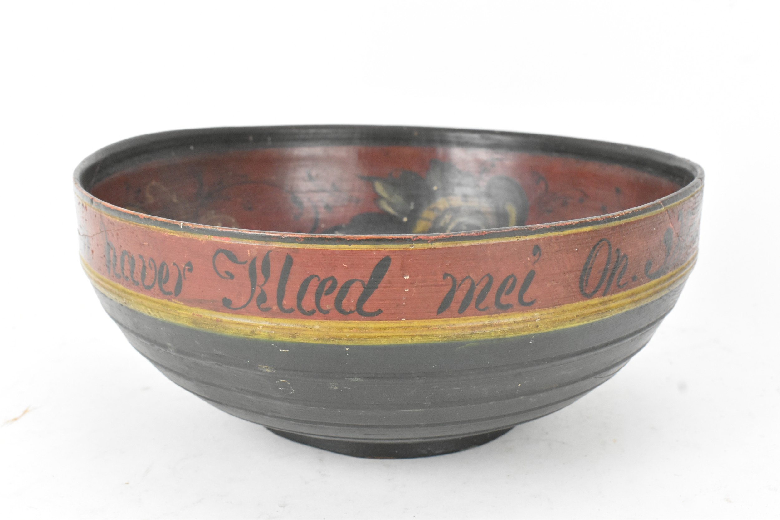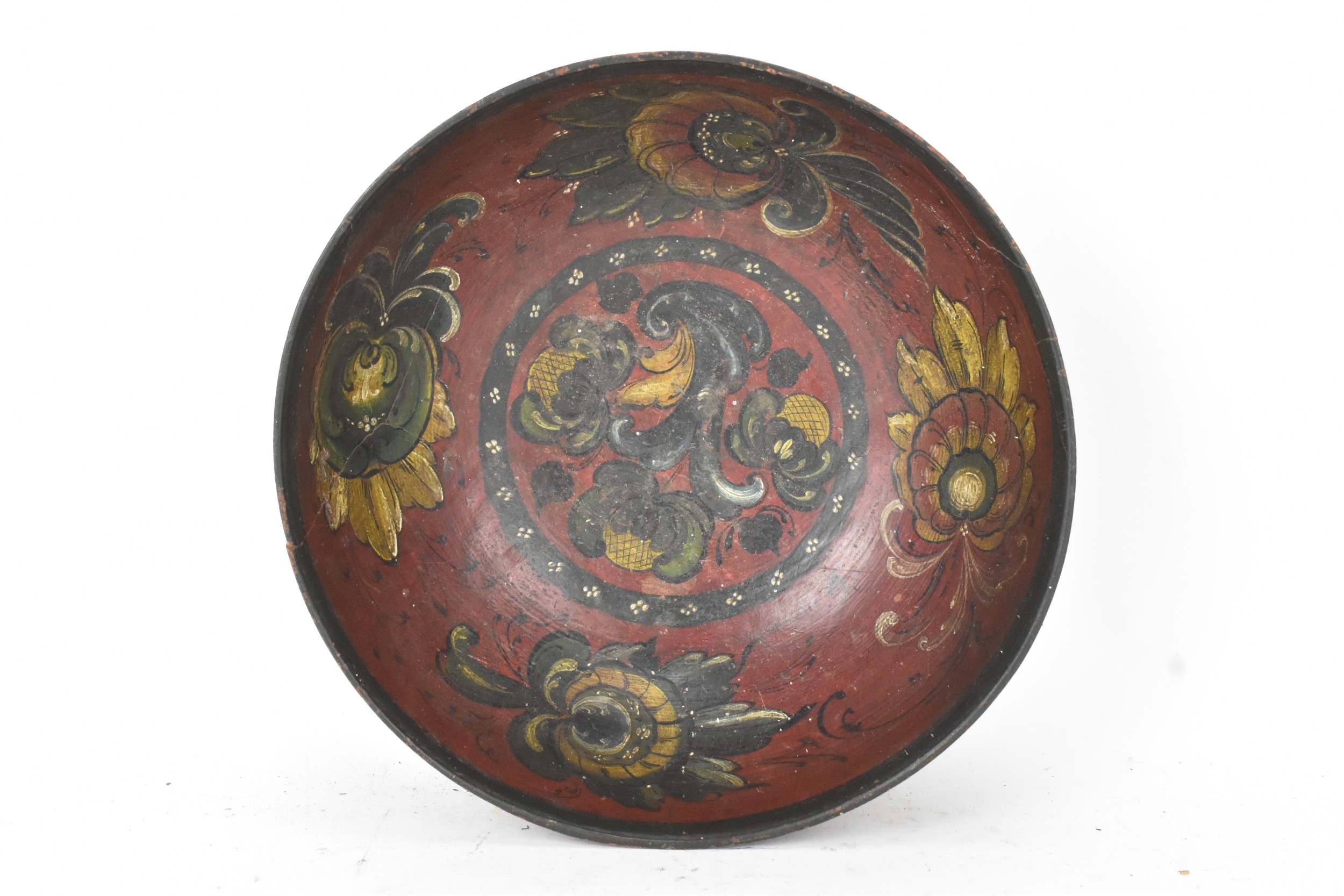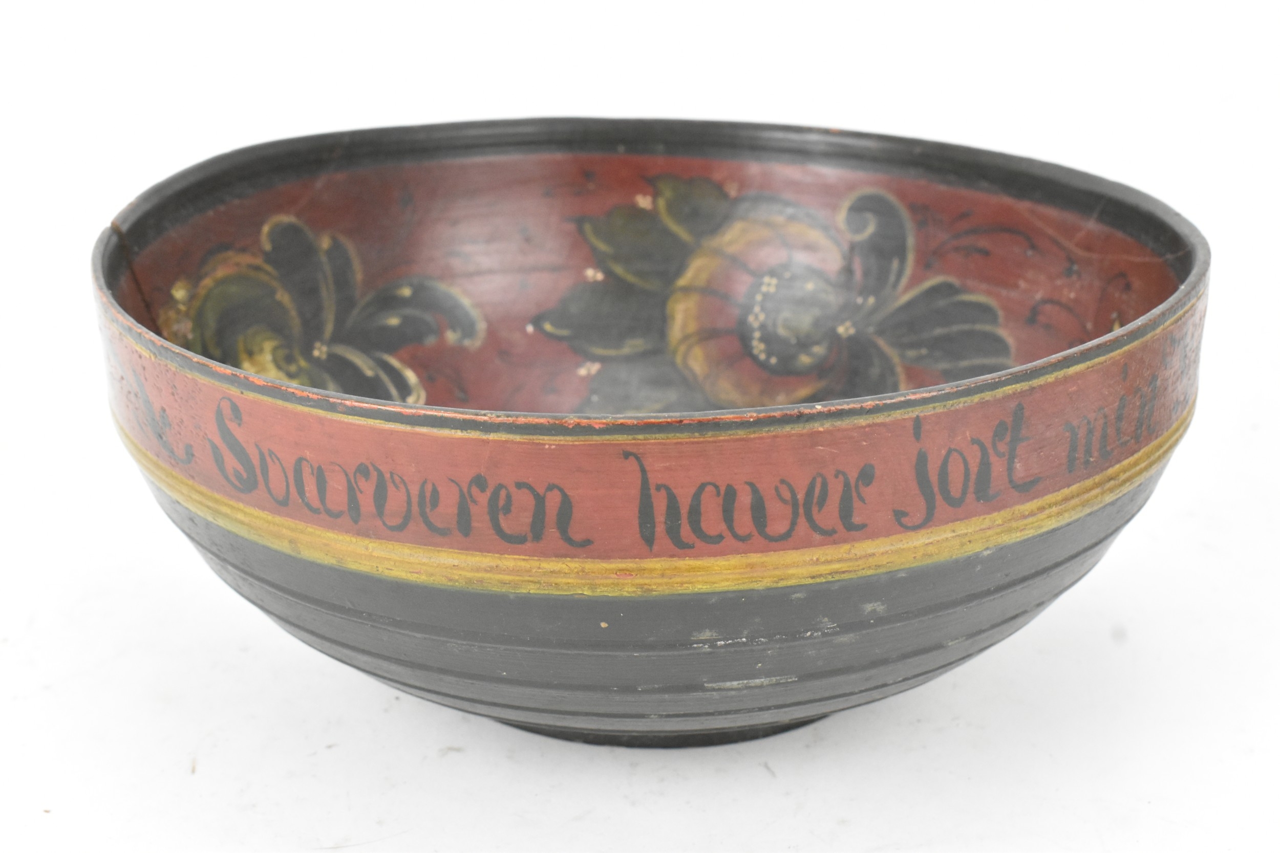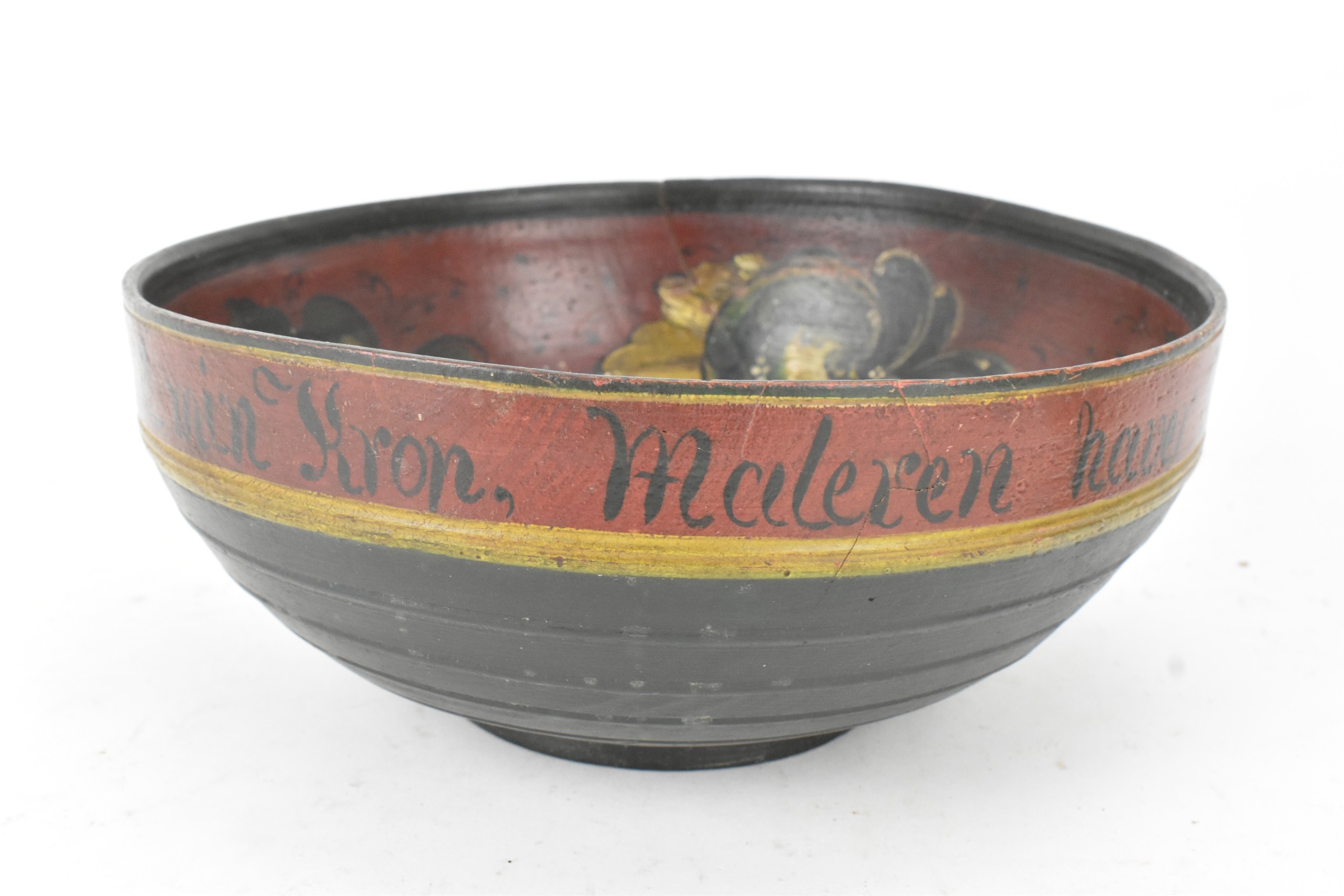 A Late 19th century Norwegian painted ale bowl (Ølboll), of turned wood, the interior decorated in polychrome with stylised floral motifs on a red ground, with an inscribed band around the rim, 11cm high x 26cm wide