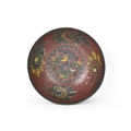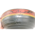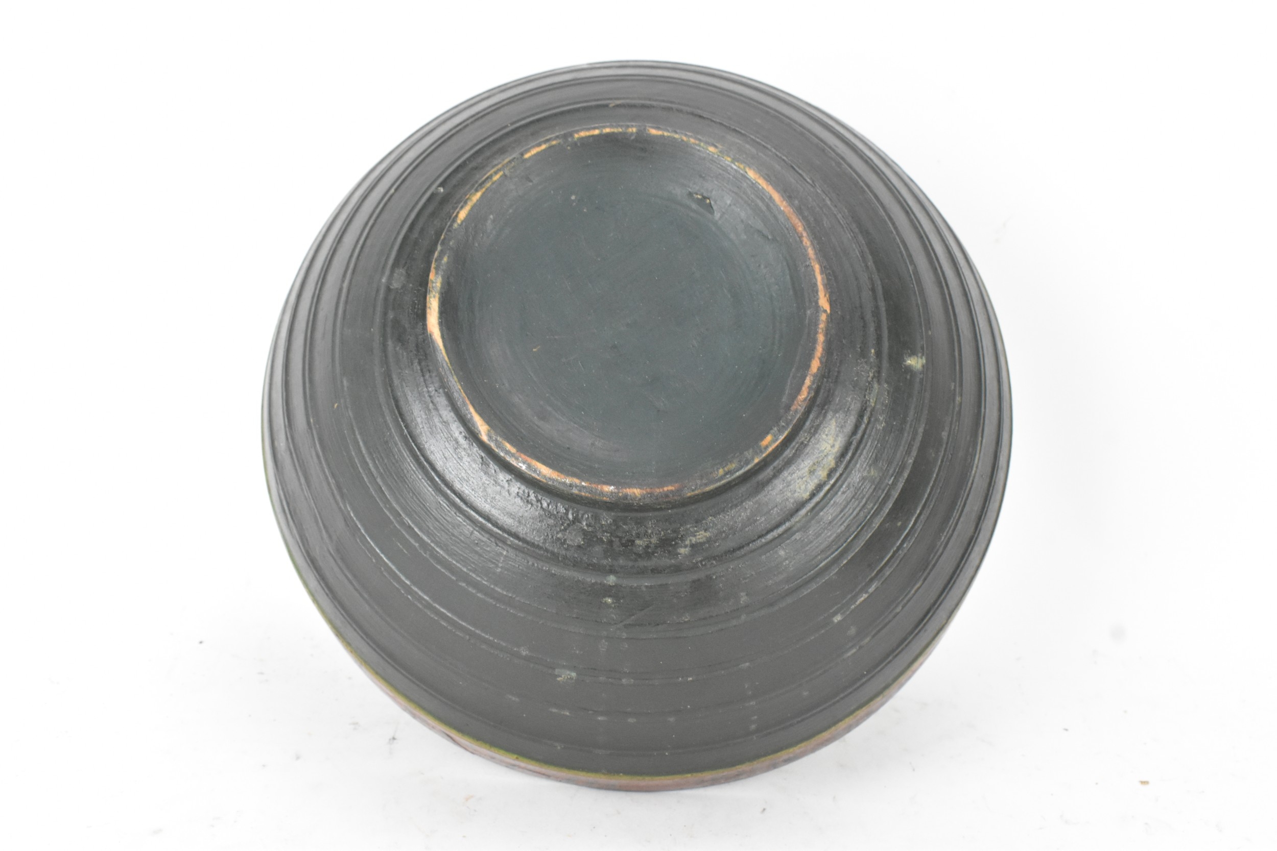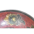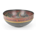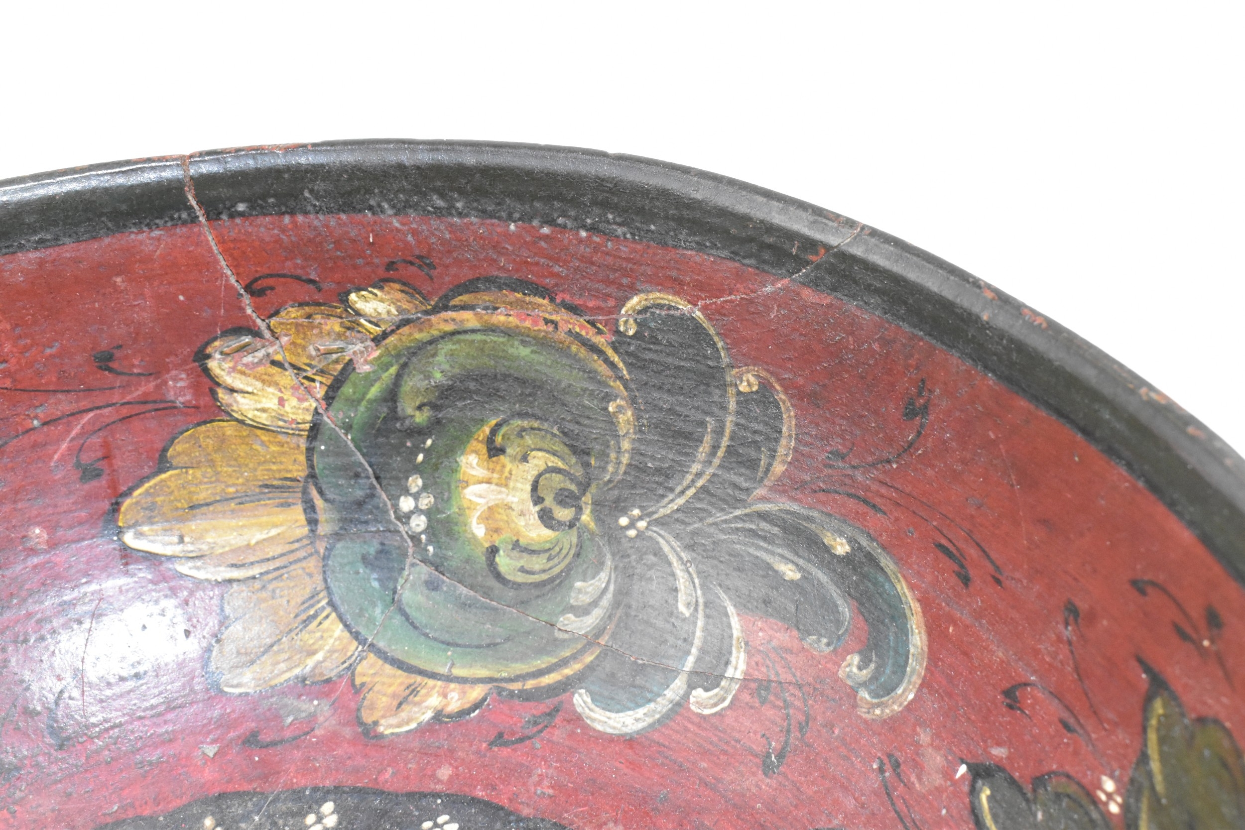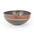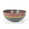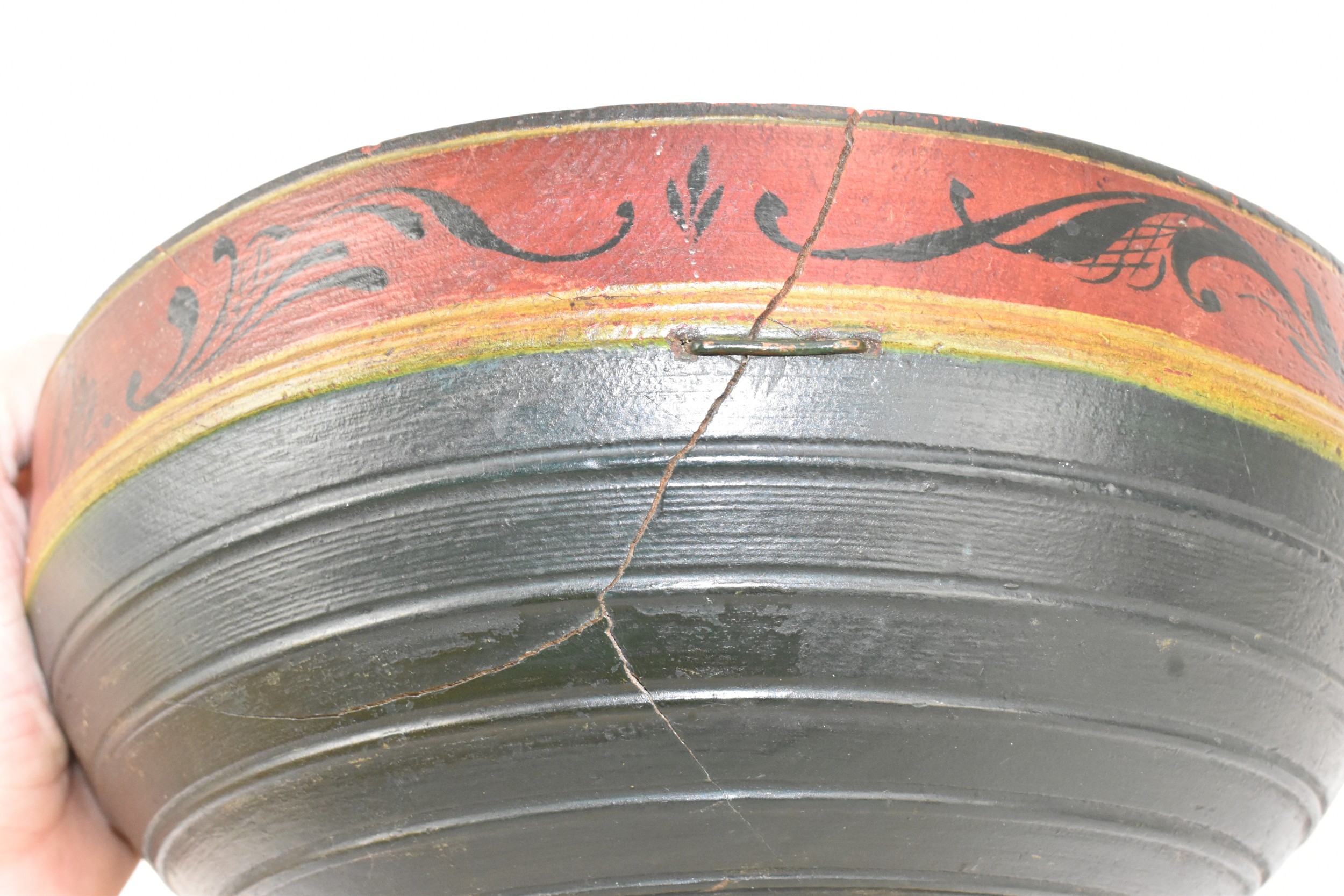 A Late 19th century Norwegian painted ale bowl (Ølboll), of turned wood, the interior decorated in polychrome with stylised floral motifs on a red ground, with an inscribed band around the rim, 11cm high x 26cm wide