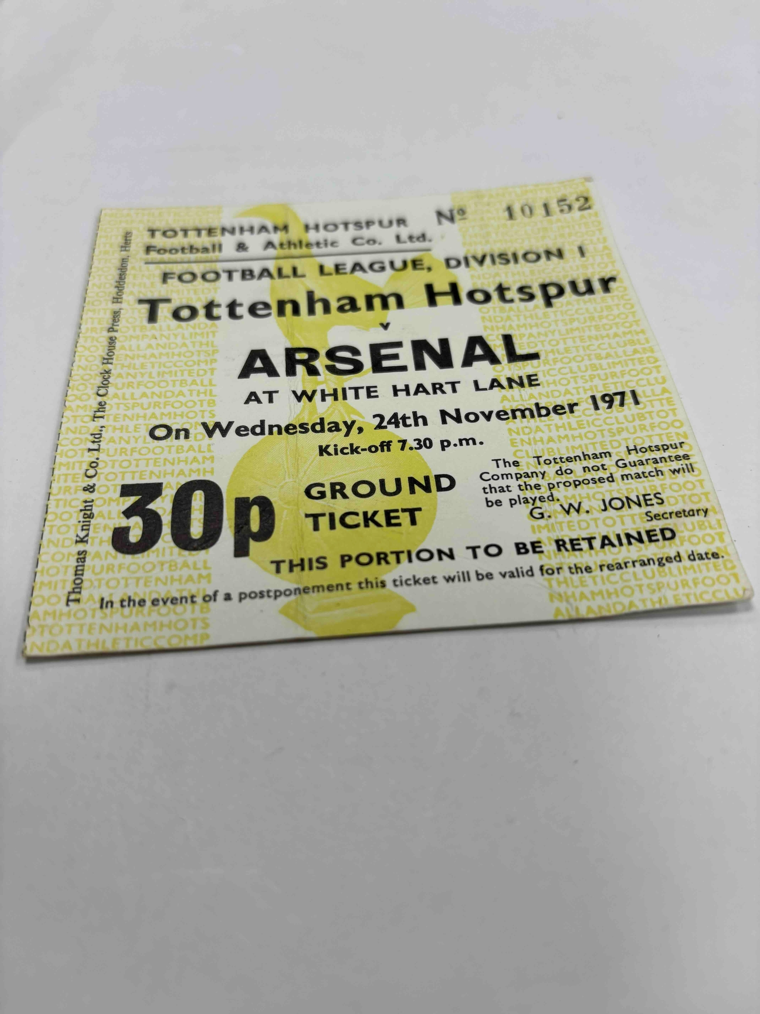 Ticket 1971/72 Tottenham v Arsenal, good condition