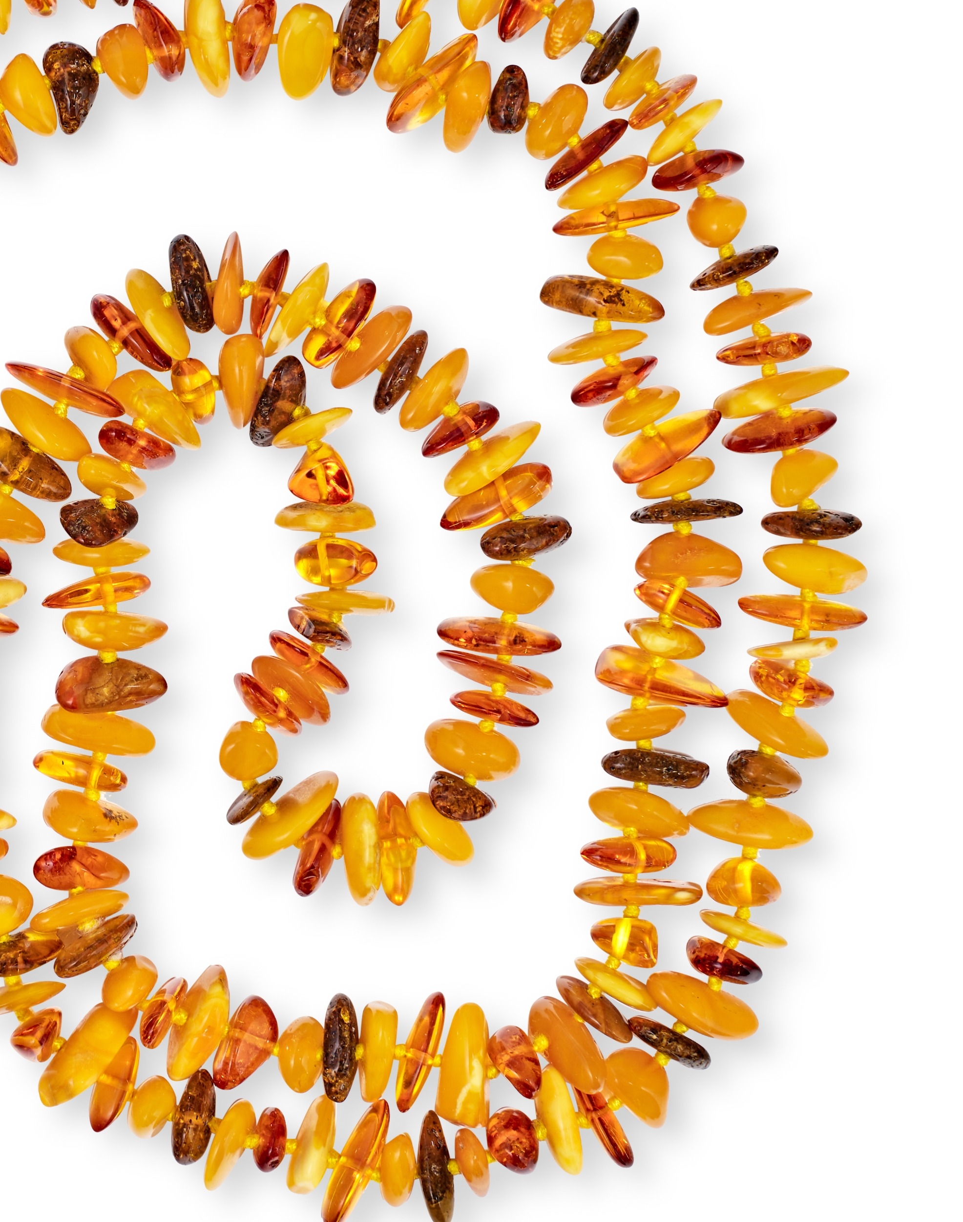 An assortment of Baltic Amber bead necklaces featuring beads in a variety of shapes, sizes, and colors. The collection includes a necklace composed of predominantly flat, disc-shaped beads, while others feature a mix of polished rounded, oval, and faceted amber beads. The color palette ranges from translucent pale yellow and butterscotch to deep cognac and cherry. All items are strung on yellow cord and display natural inclusions and minor surface irregularities characteristic of genuine Baltic amber.