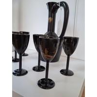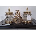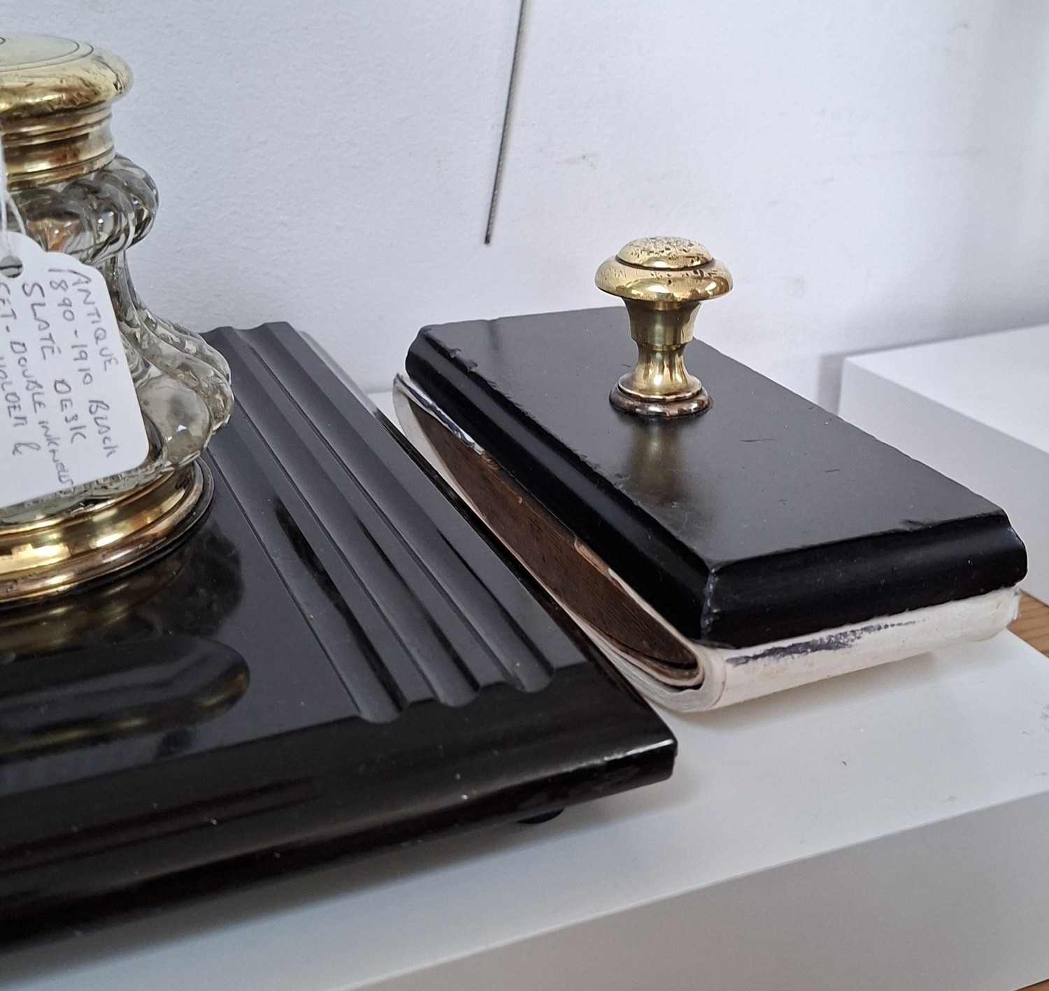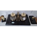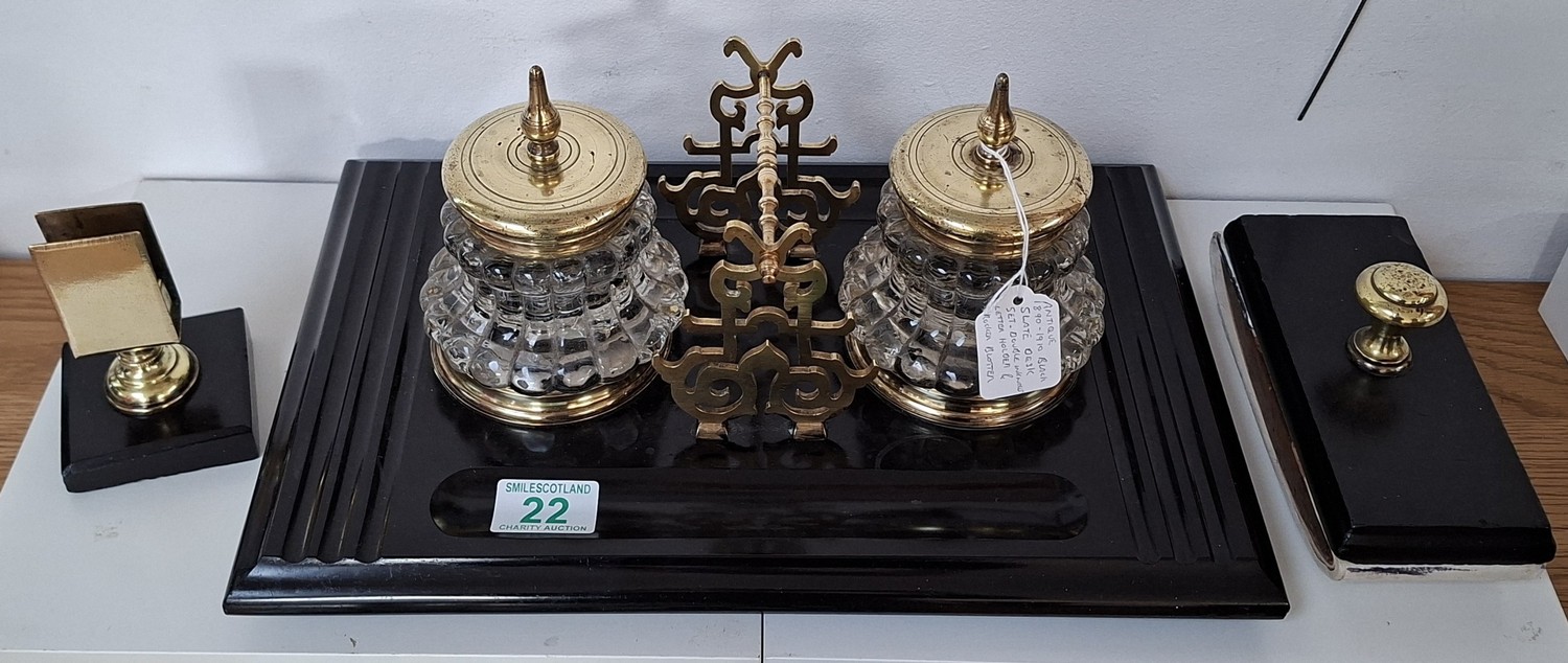 Antique circa 1900 black slate desk set double ink wells, pen and letter holder plus blotter