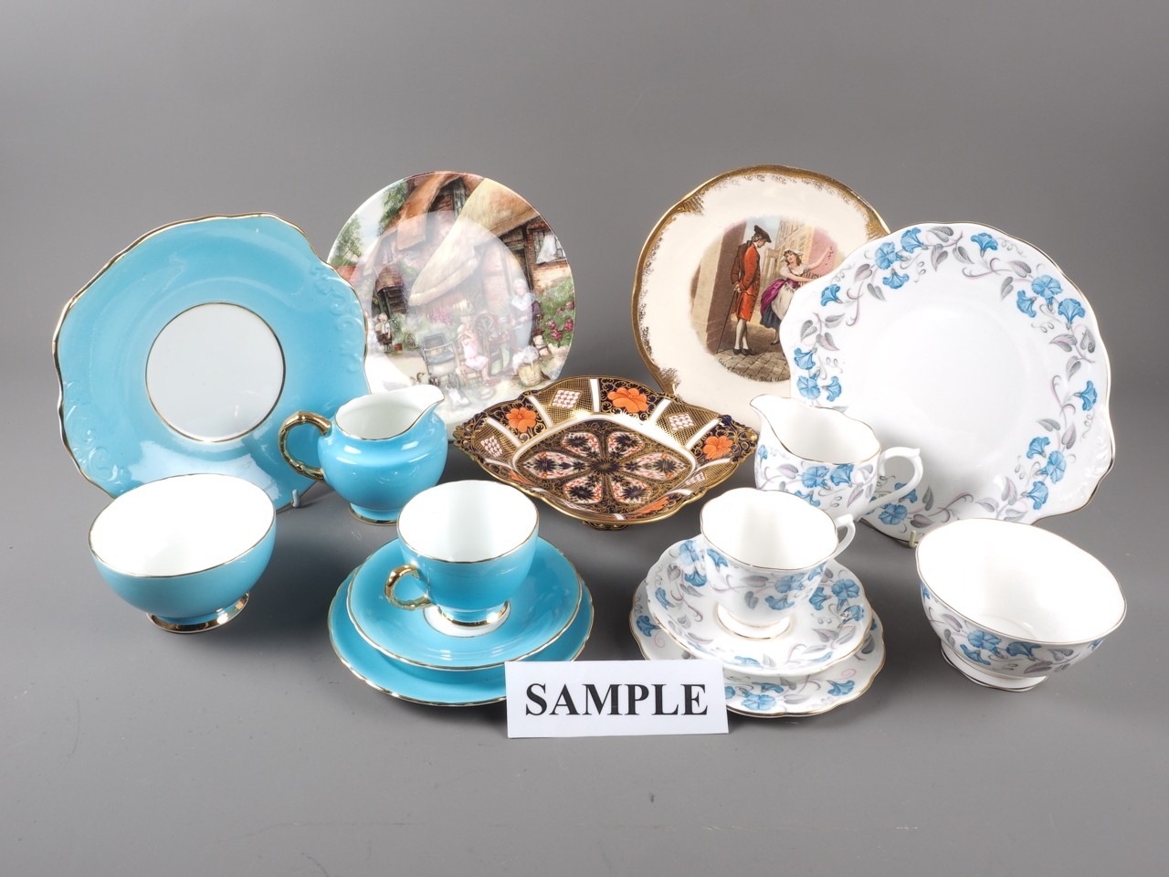 A Sutherland Bone China blue glazed part teaset, a Royal Albert "Morning Glory" pattern part teaset, and a quantity of mixed plates and other ceramics, various