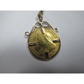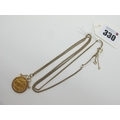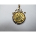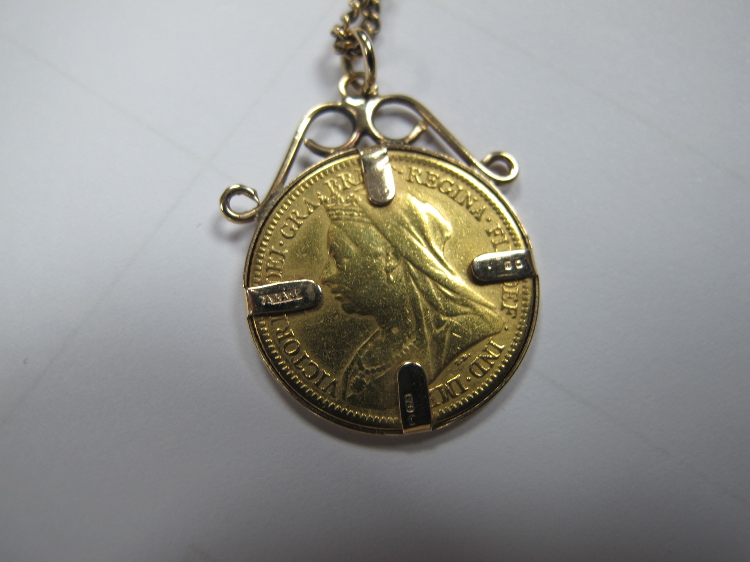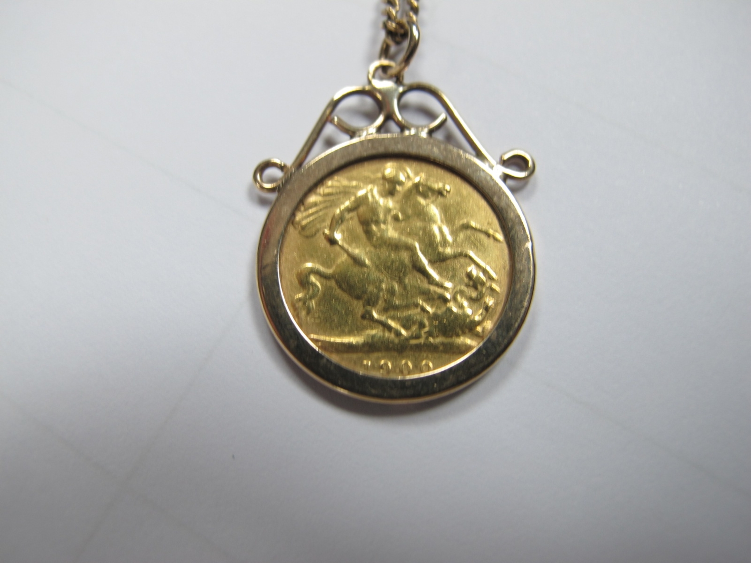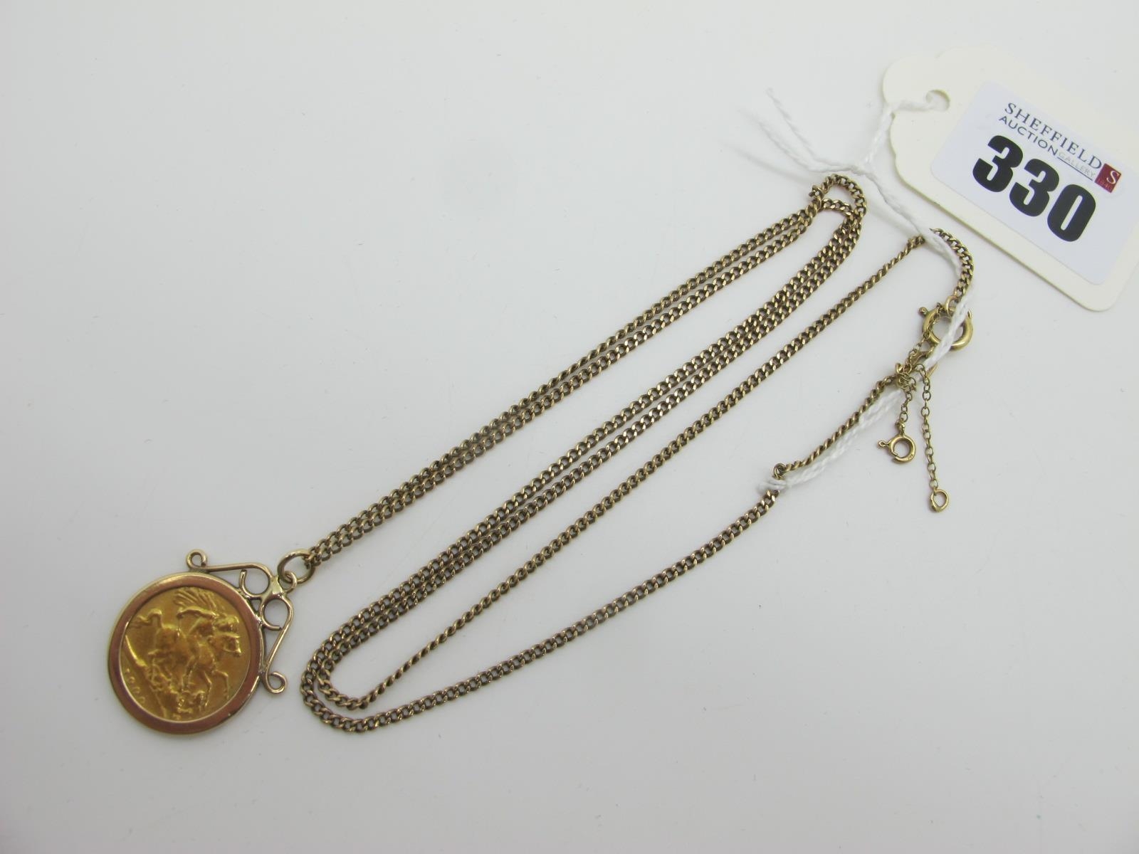 A 9ct Gold Fine Flat Link Curb Chain, 62cm long, suspending a Victoria half Sovereign 1900, loose(?) set within 9ct gold pendant mount.