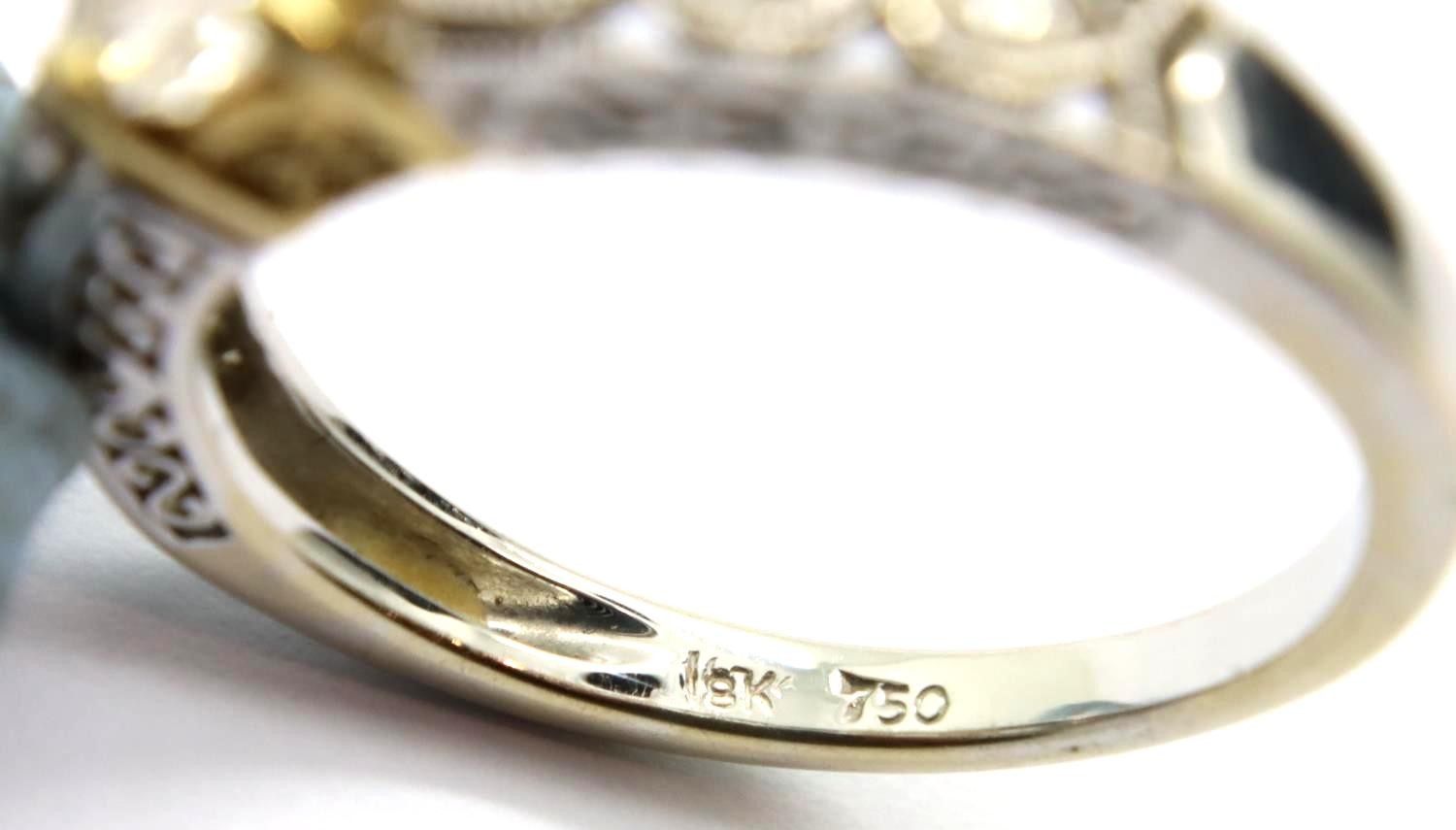 A modern 18ct white and yellow gold solitaire diamond dress ring, the central stone of approximately 0.5cts flanked by six small diamonds, size N/O, 4.2g. P&P Group 1 (£14+VAT for the first lot and £1+VAT for subsequent lots)