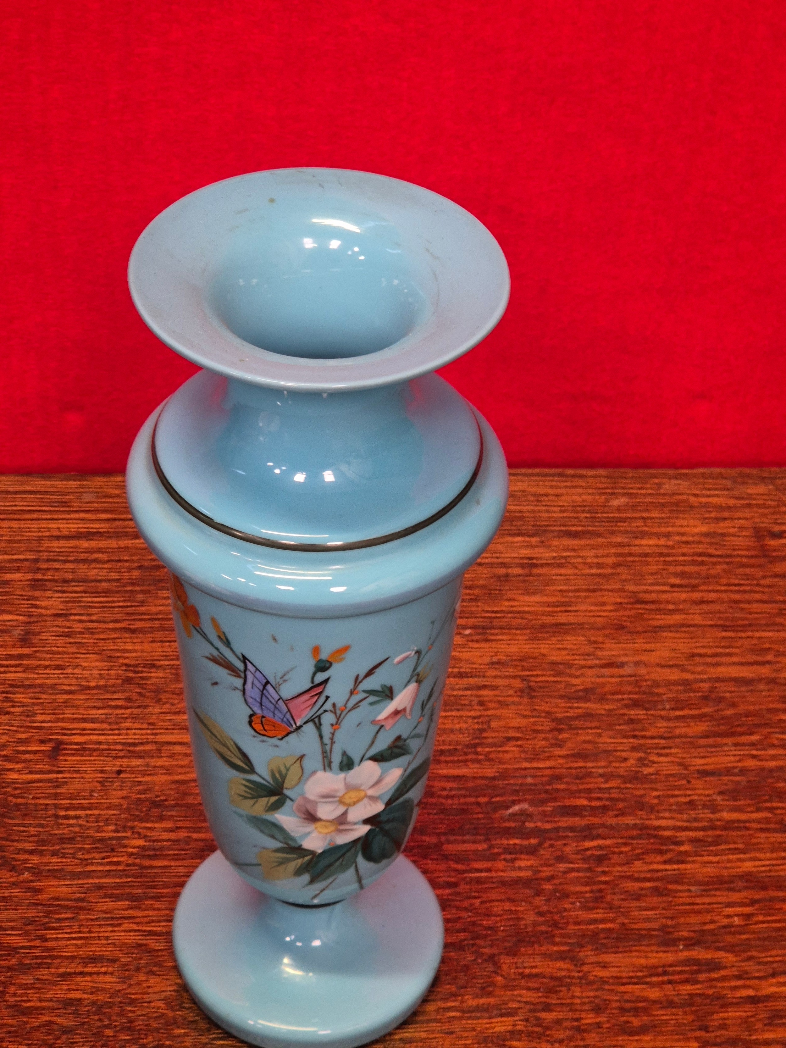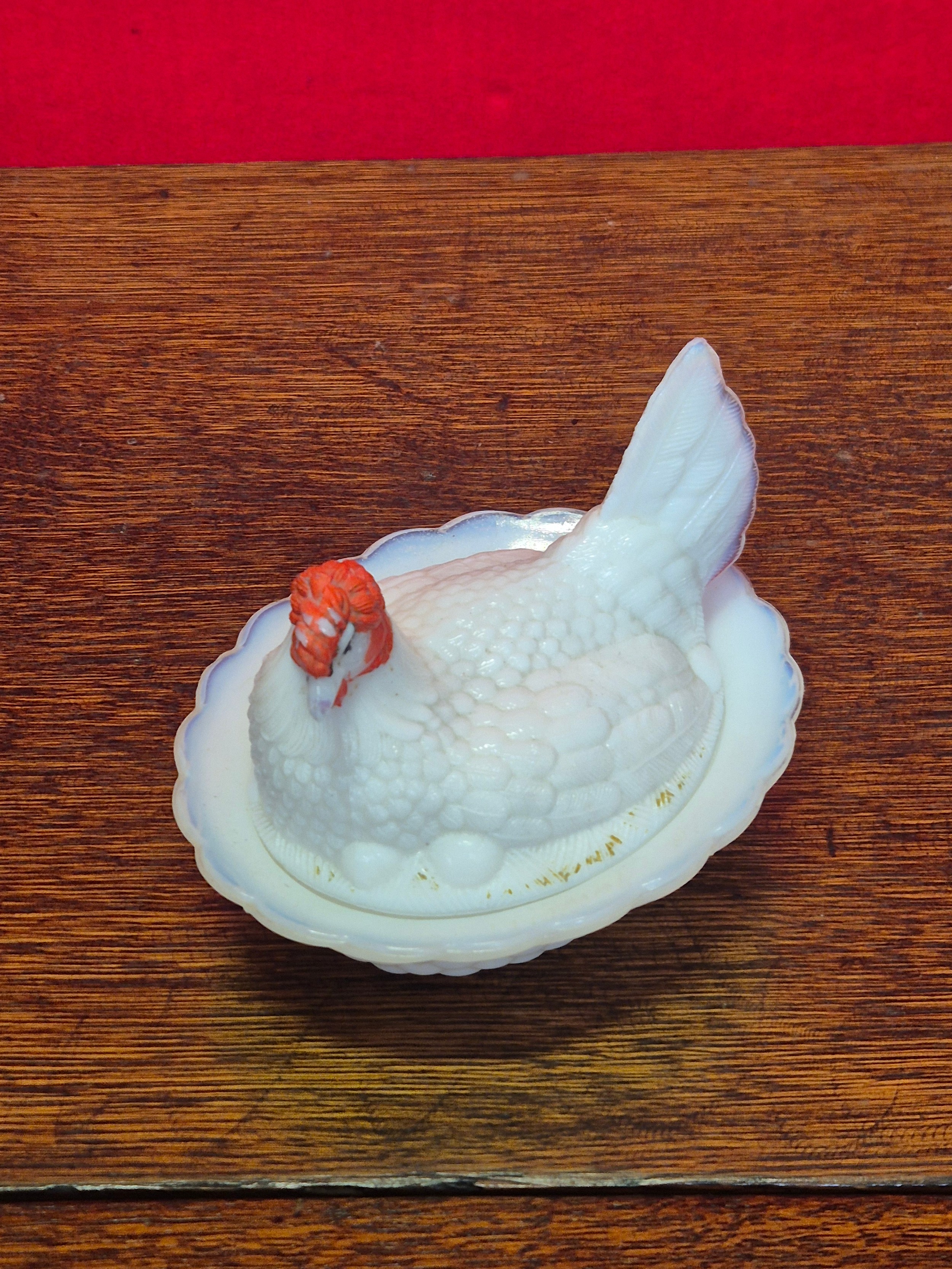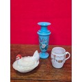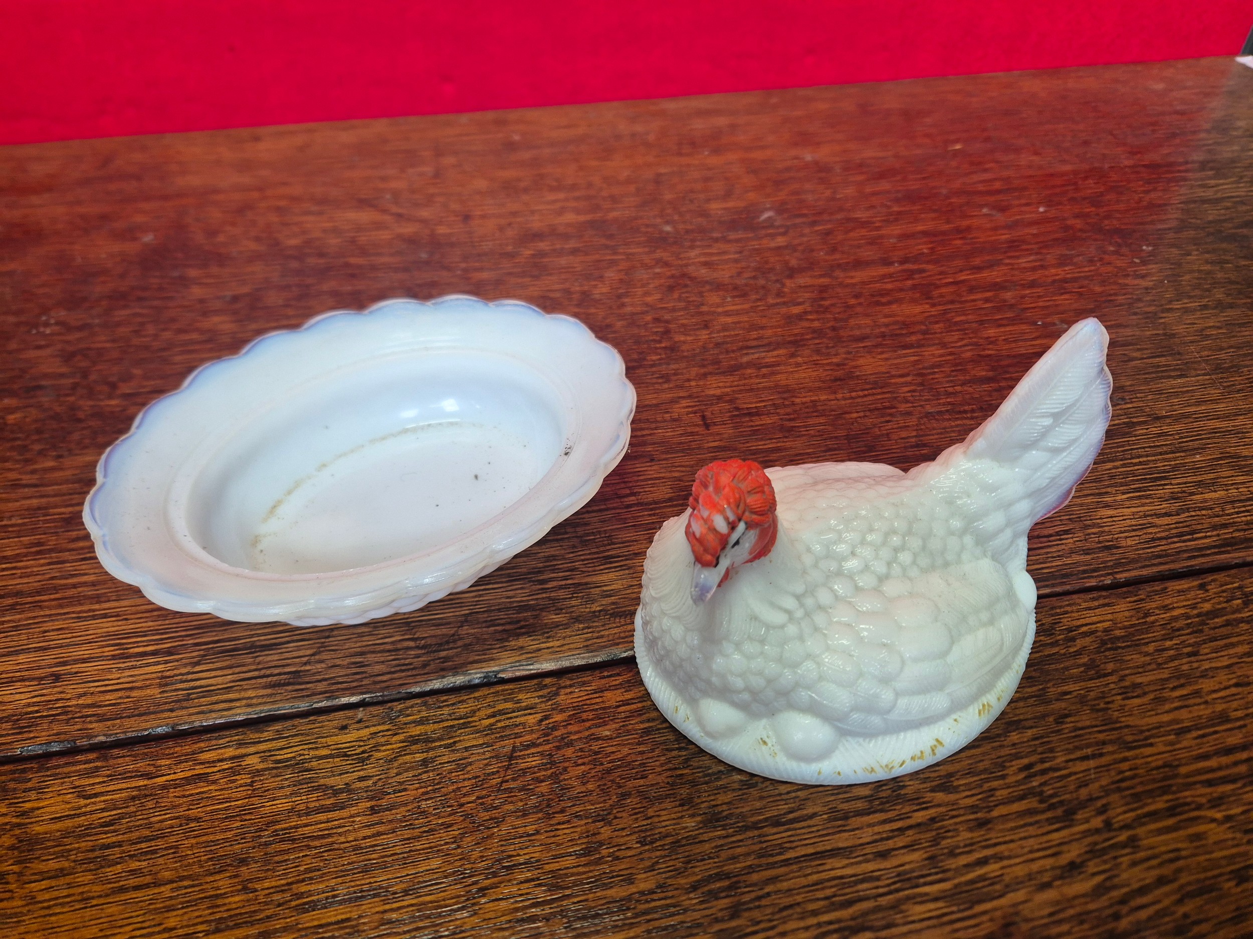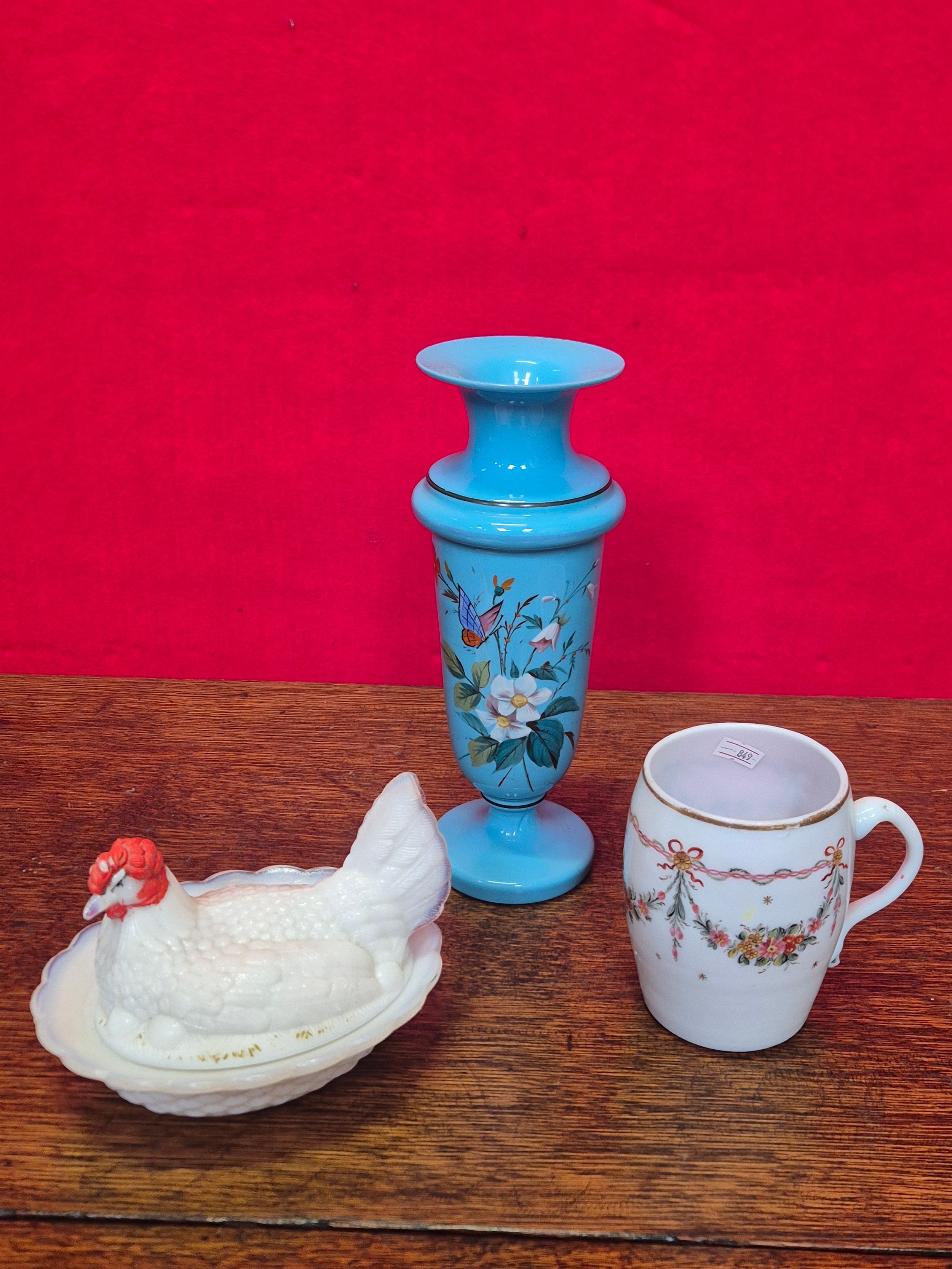 Antique opaline glass lot - including a tankard with polychrome floral swagging decoration, a blue vase with hand painted floral motif and vintage Westmoreland milk glass ‘hen on a nest’ covered dish.