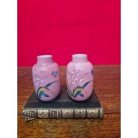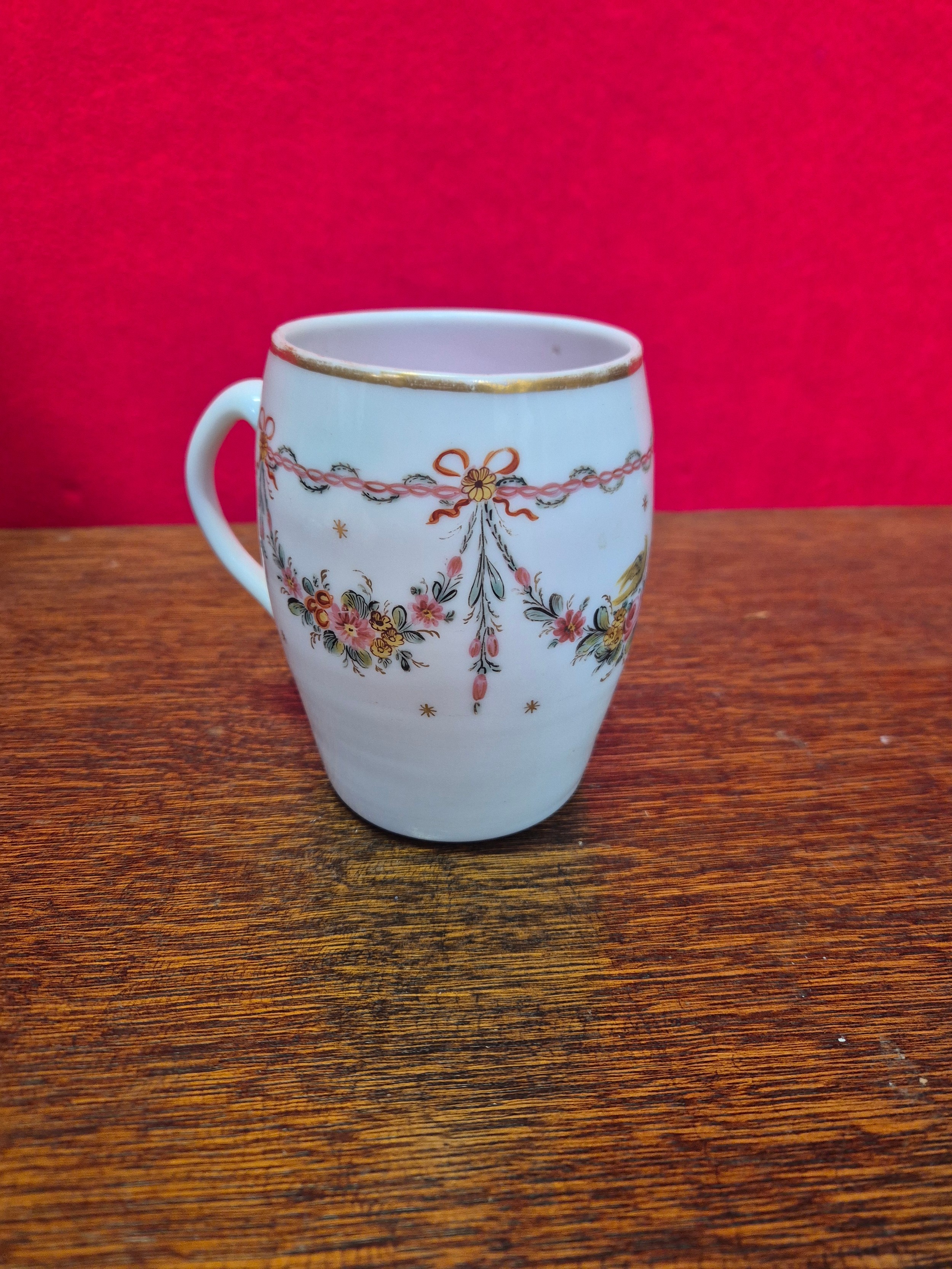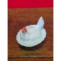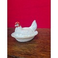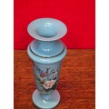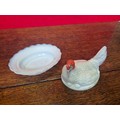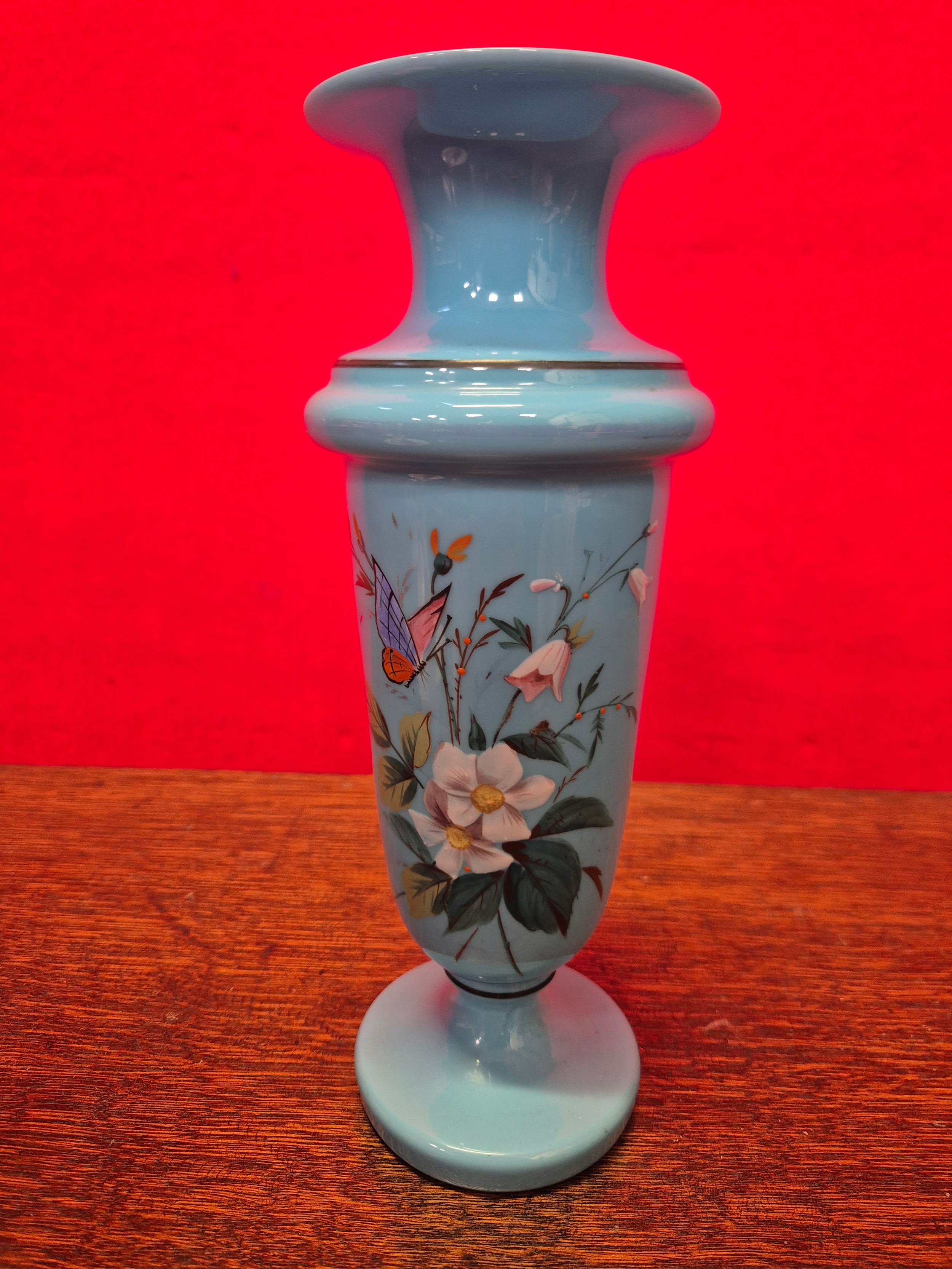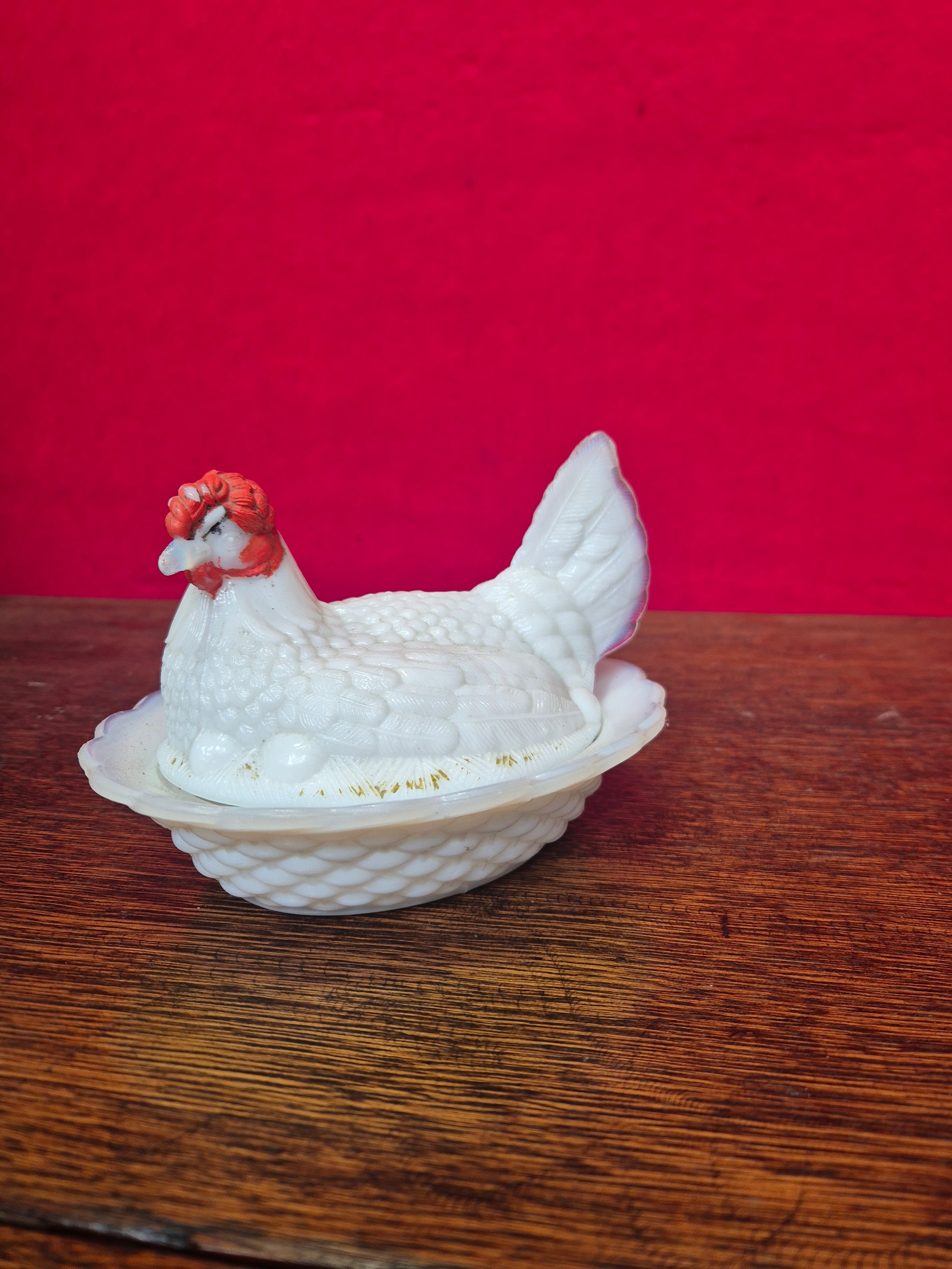 Antique opaline glass lot - including a tankard with polychrome floral swagging decoration, a blue vase with hand painted floral motif and vintage Westmoreland milk glass ‘hen on a nest’ covered dish.