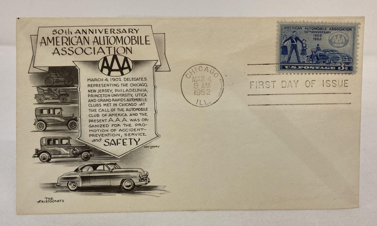 A 1952 American first day cover for 50th Anniversary of the American Automobile Association. Post mark Chicago March 4th.