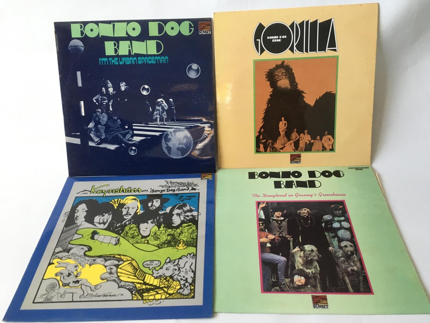 Four Bonzo Dog Doo Dah Band LPs comprising 'Gorilla', 'Keyndham' and two others, all reissues on the Sunset label.