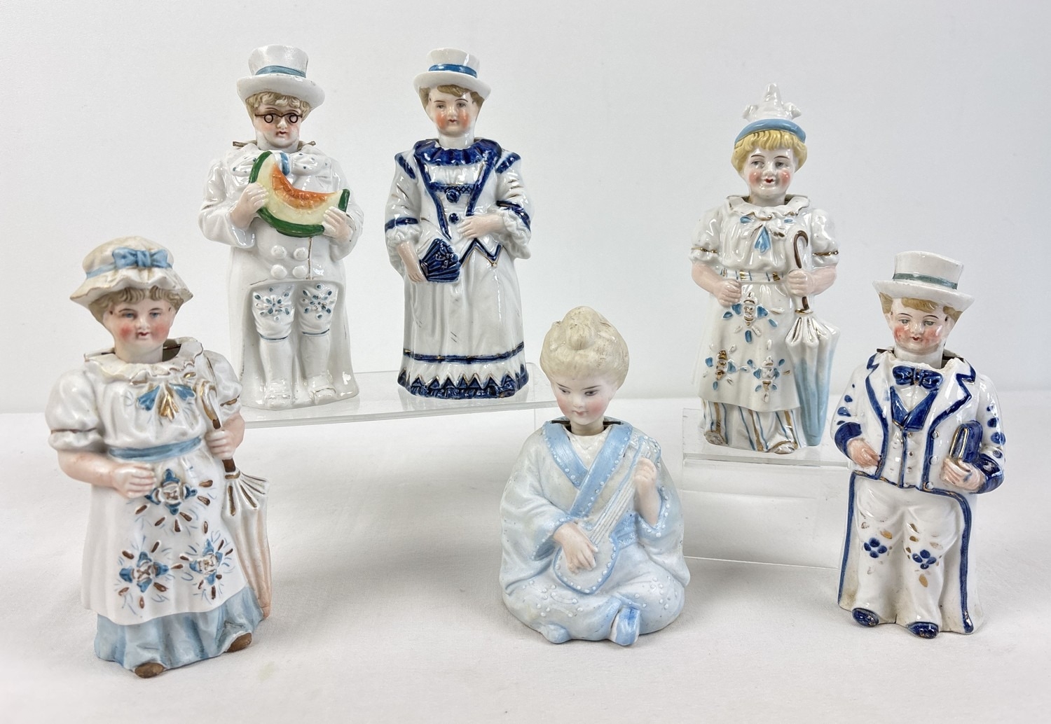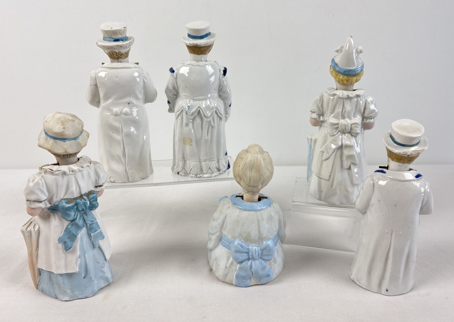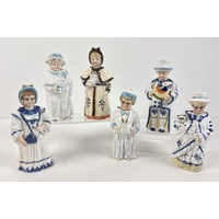 6 assorted antique bisque nodder figurines in varying designs and colours to include Oriental seated lady. Largest approx. 18.5cm tall.