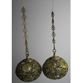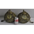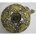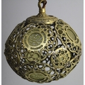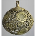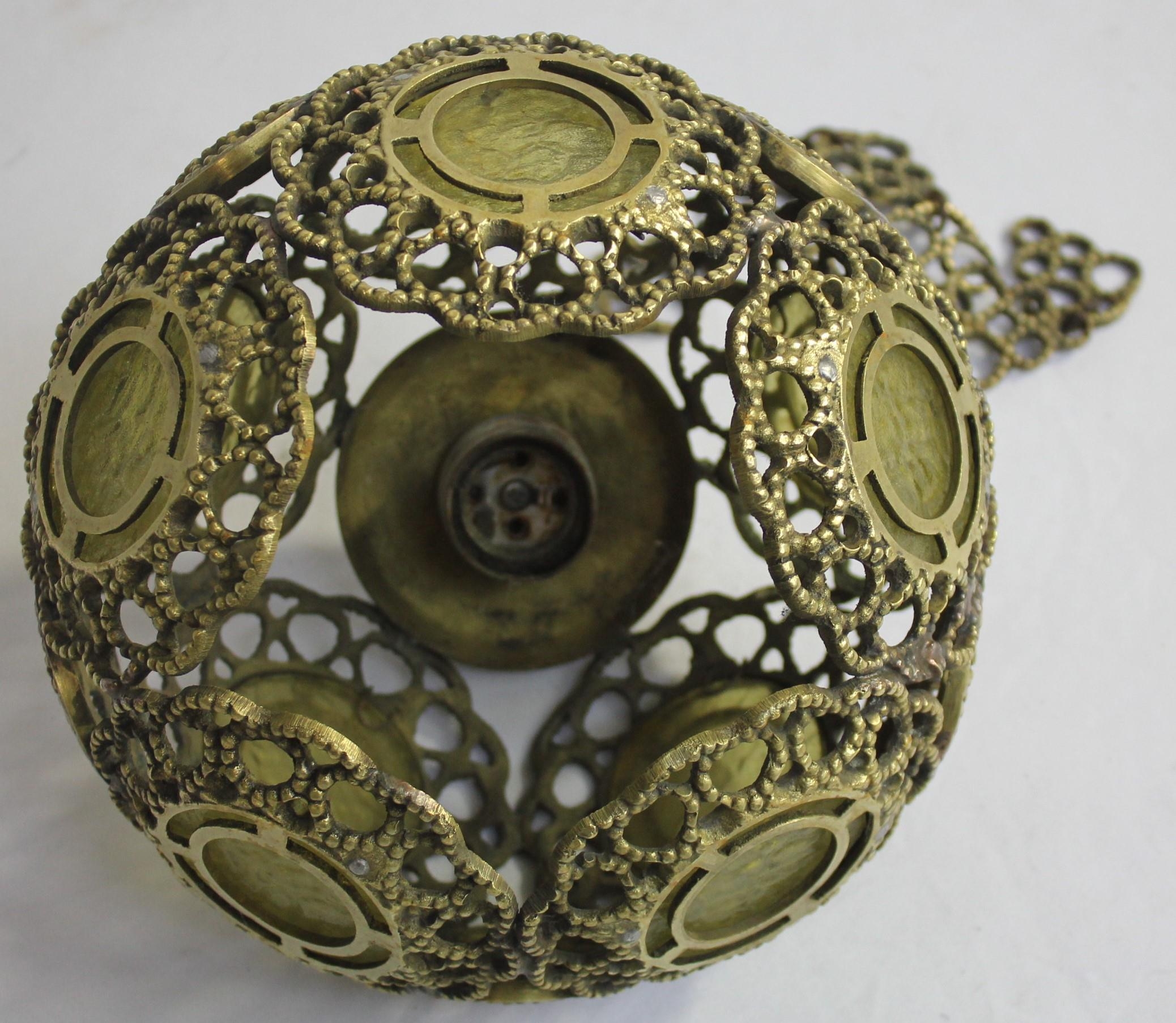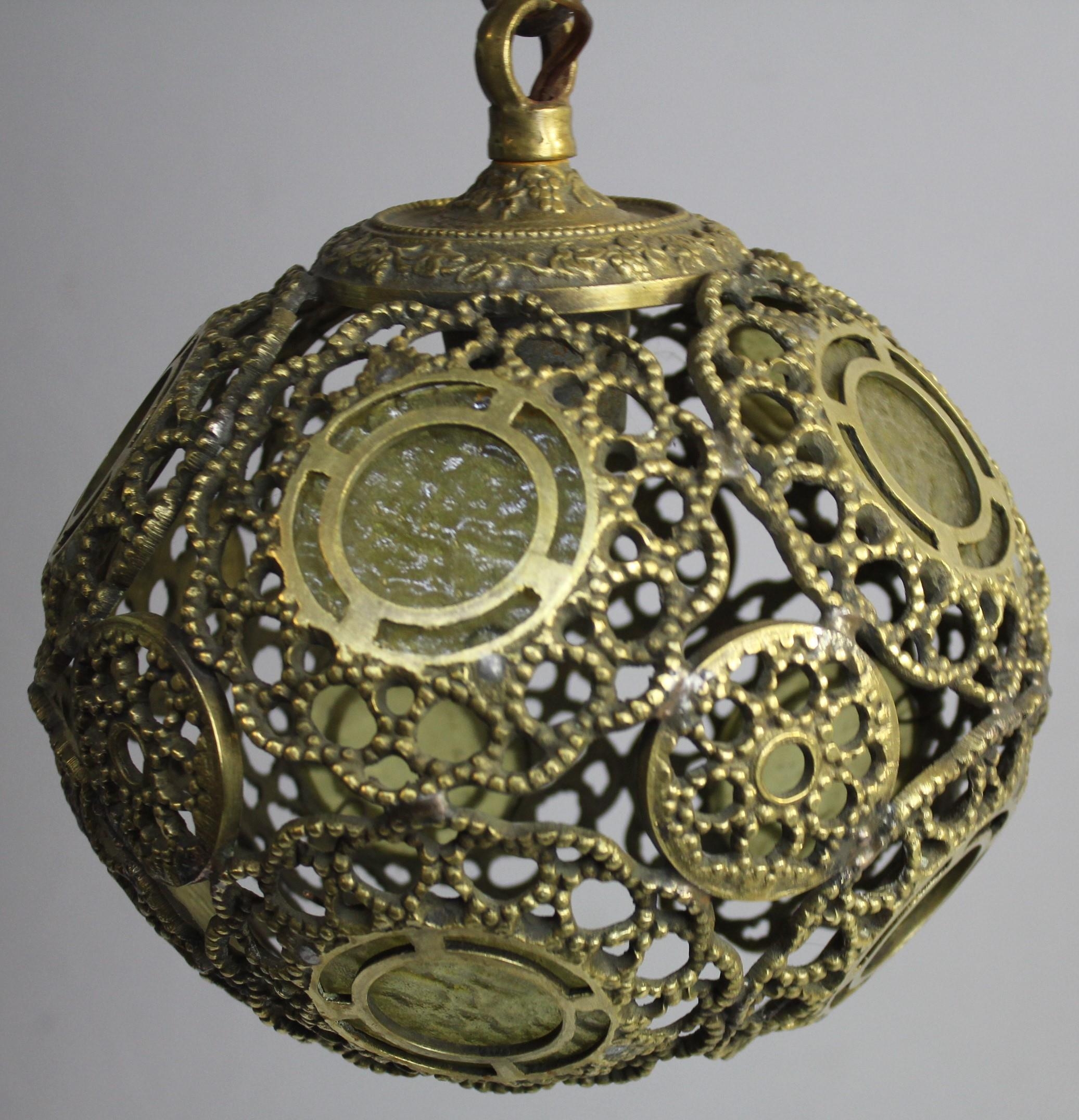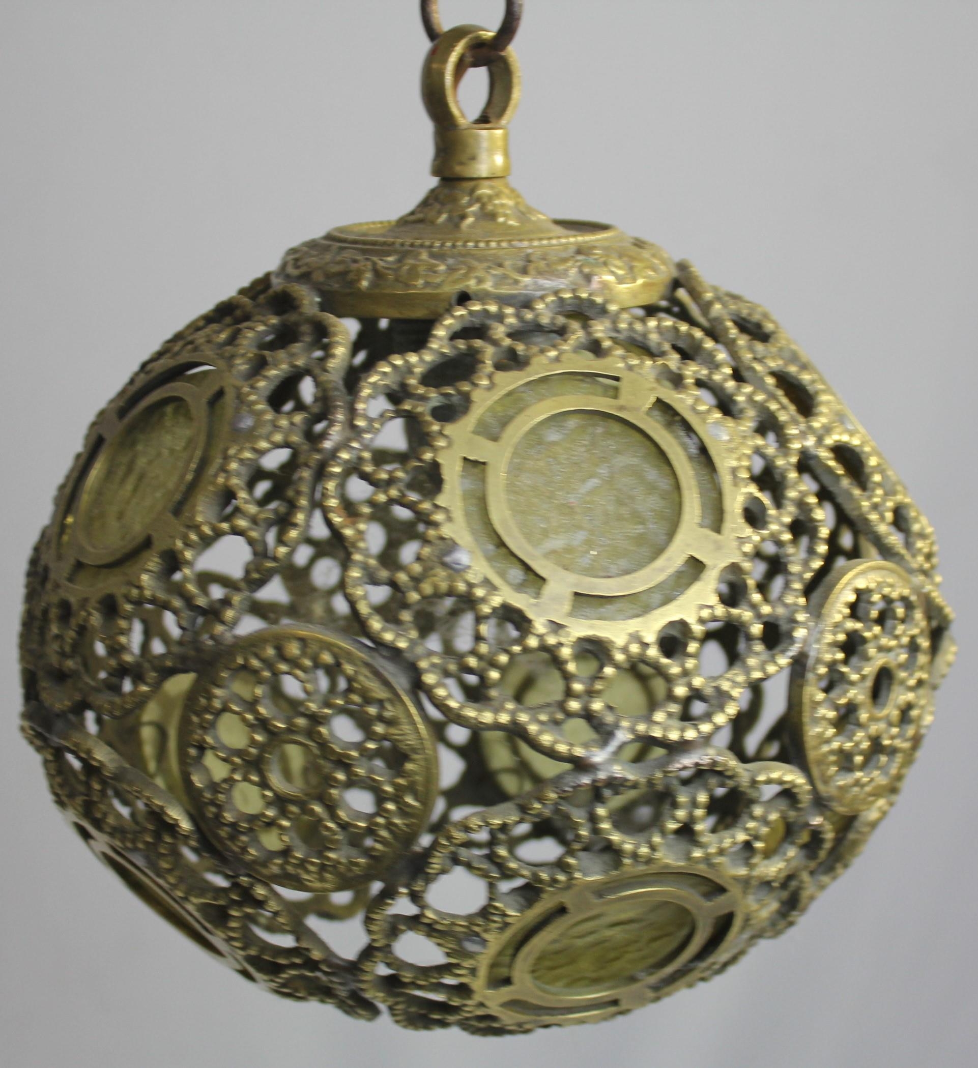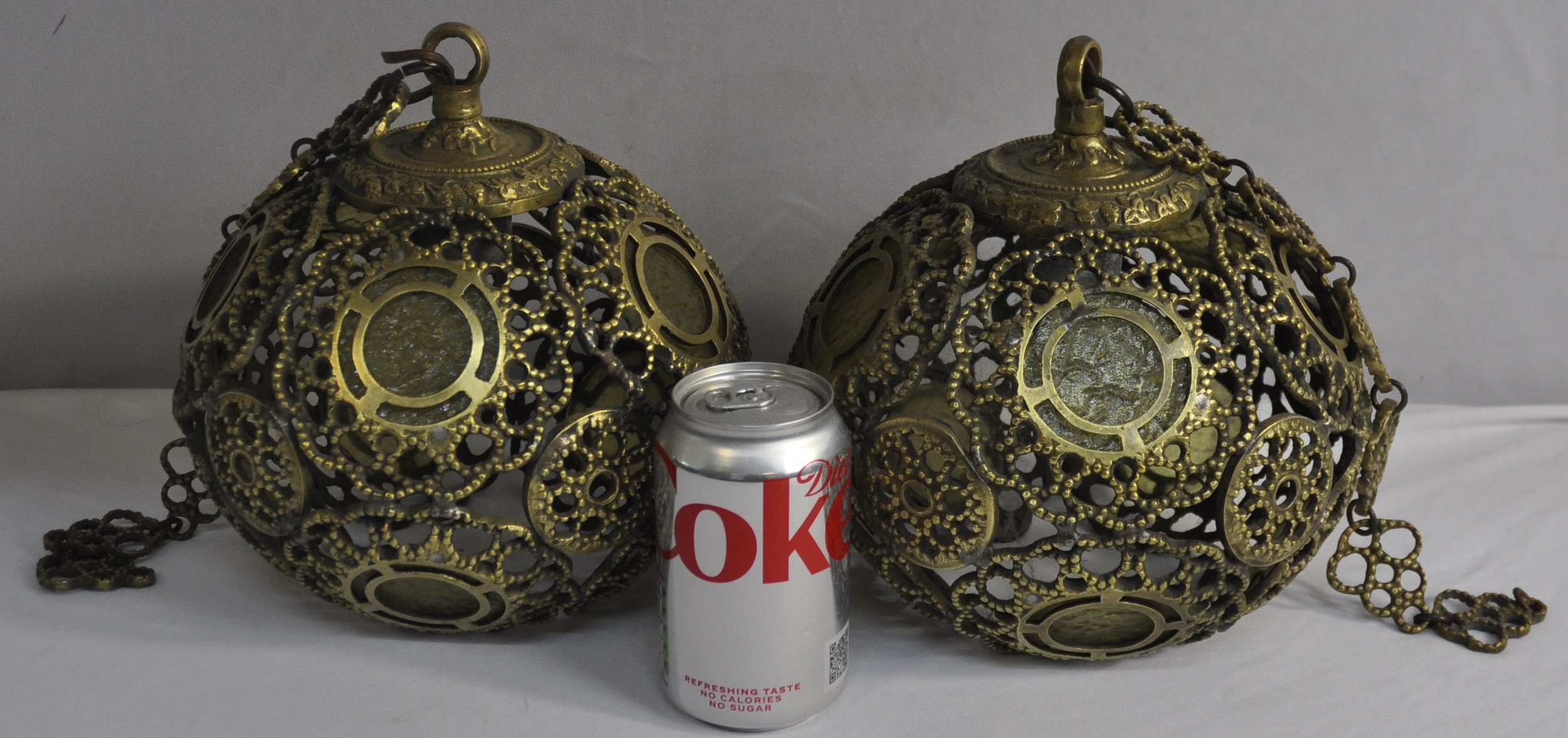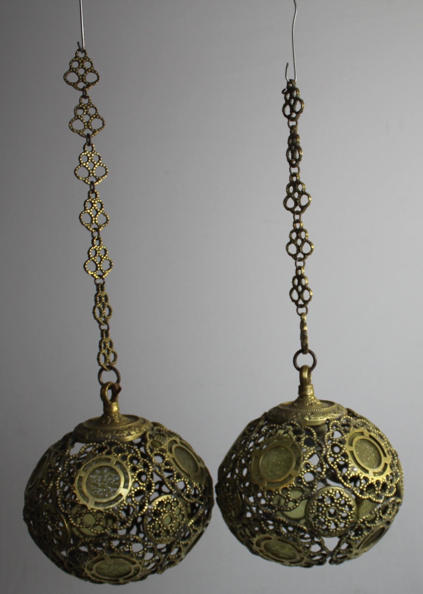2 CHINESE STYLE BRASS GLOBE CAGE CEILING LIGHTS ON CHAINS