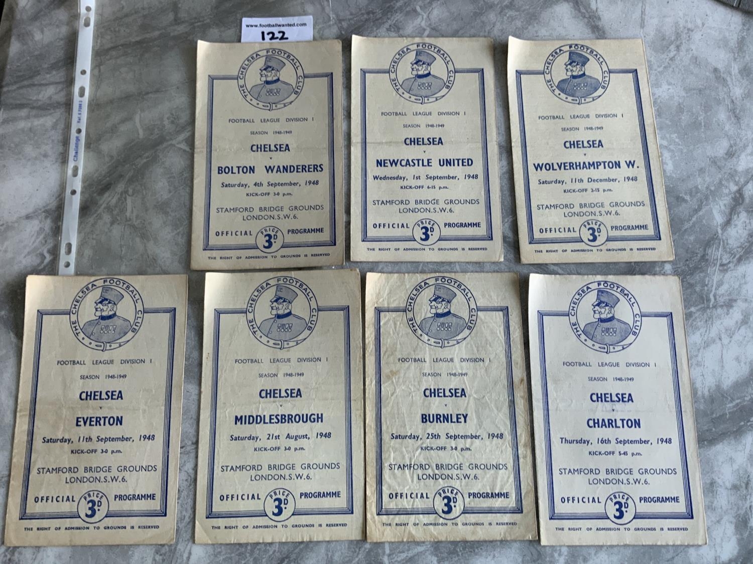 48/49 Chelsea Home Football Programmes: League matches in good condition with no writing except Everton which has pencilled team changes and Burnley which is creased. (7)
