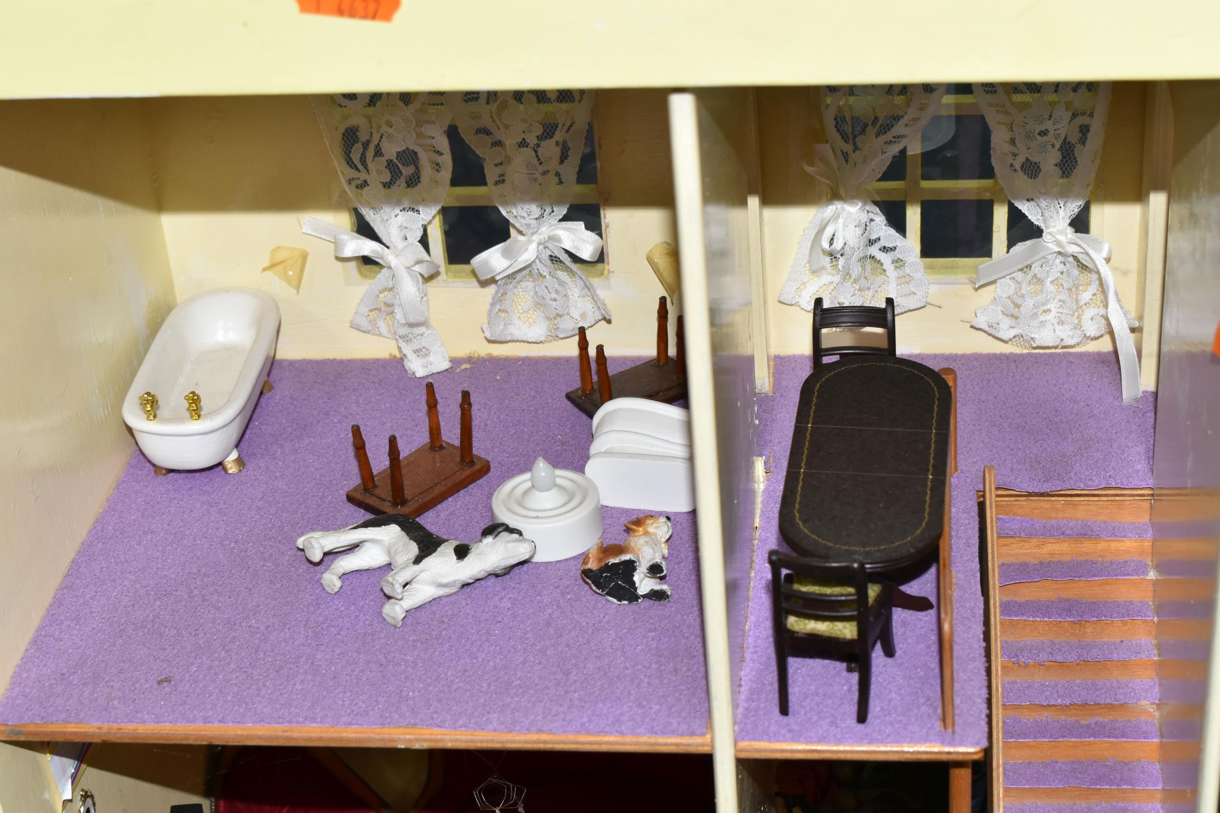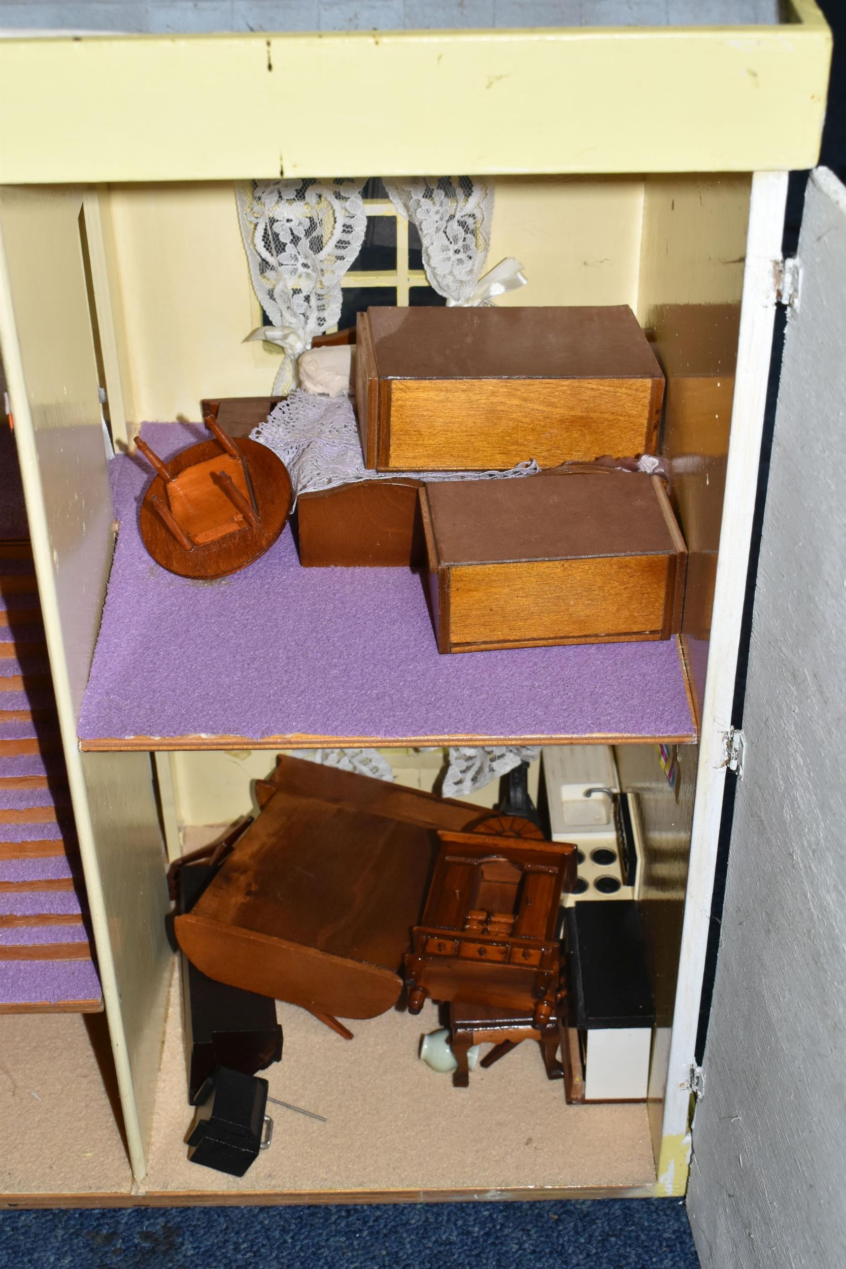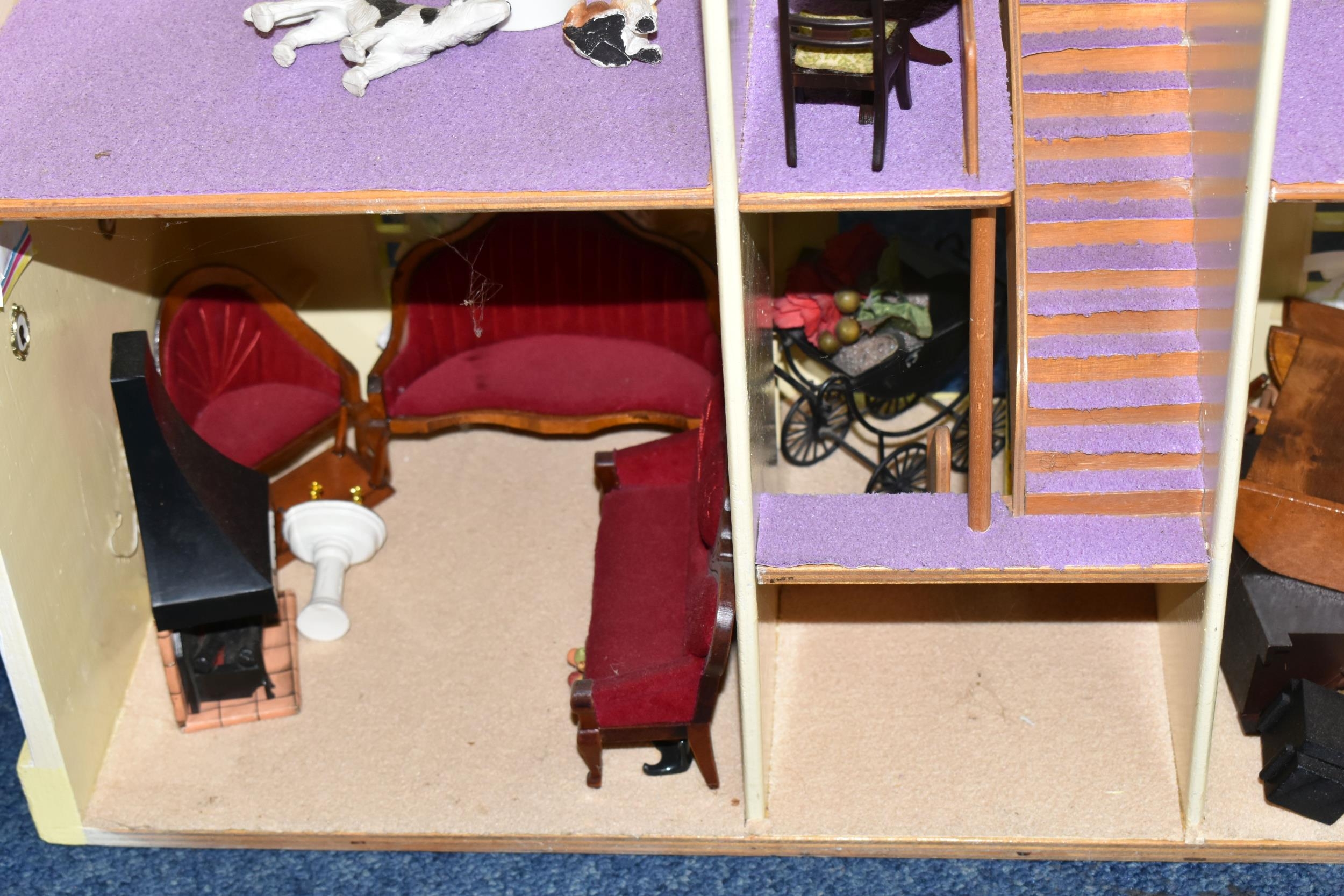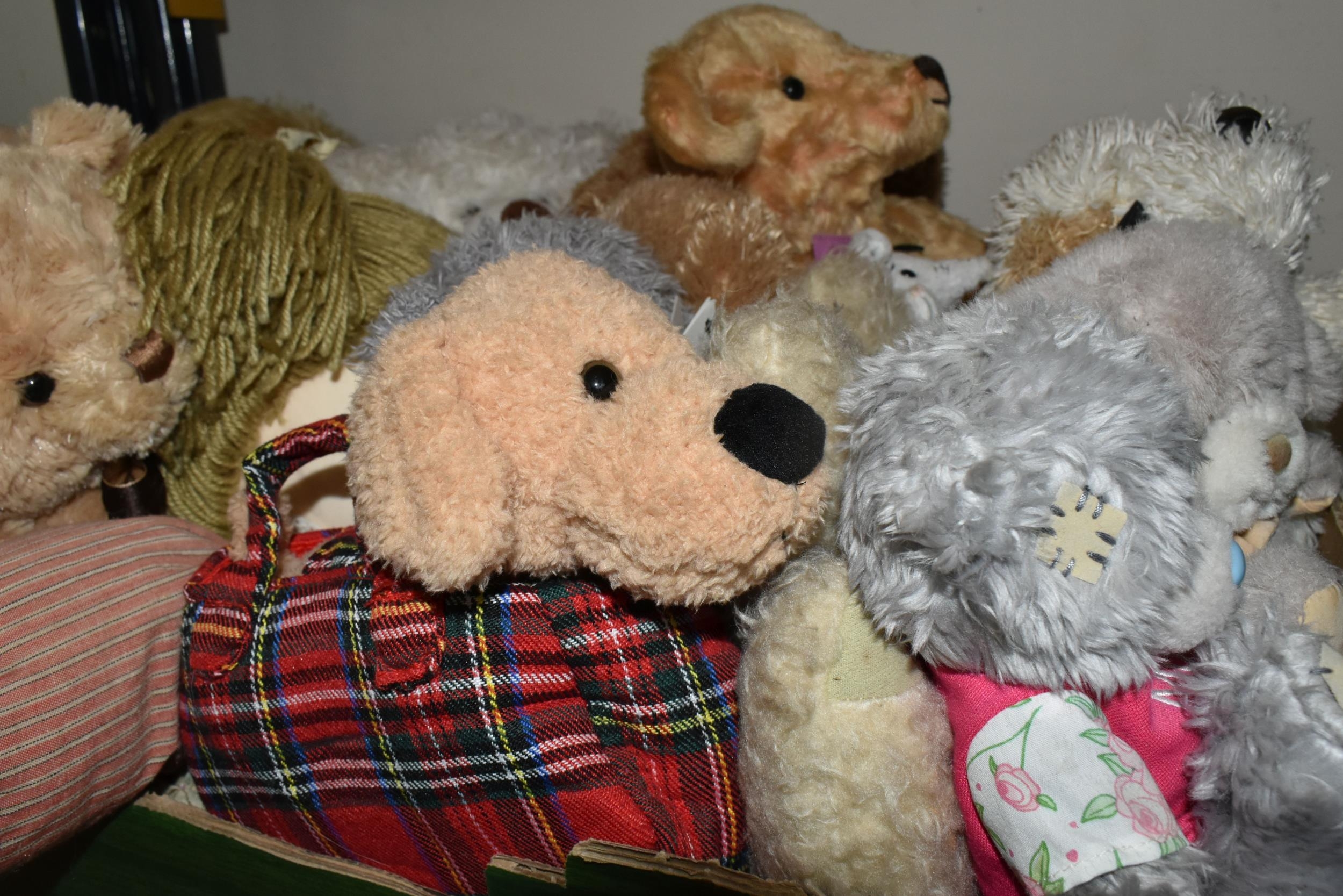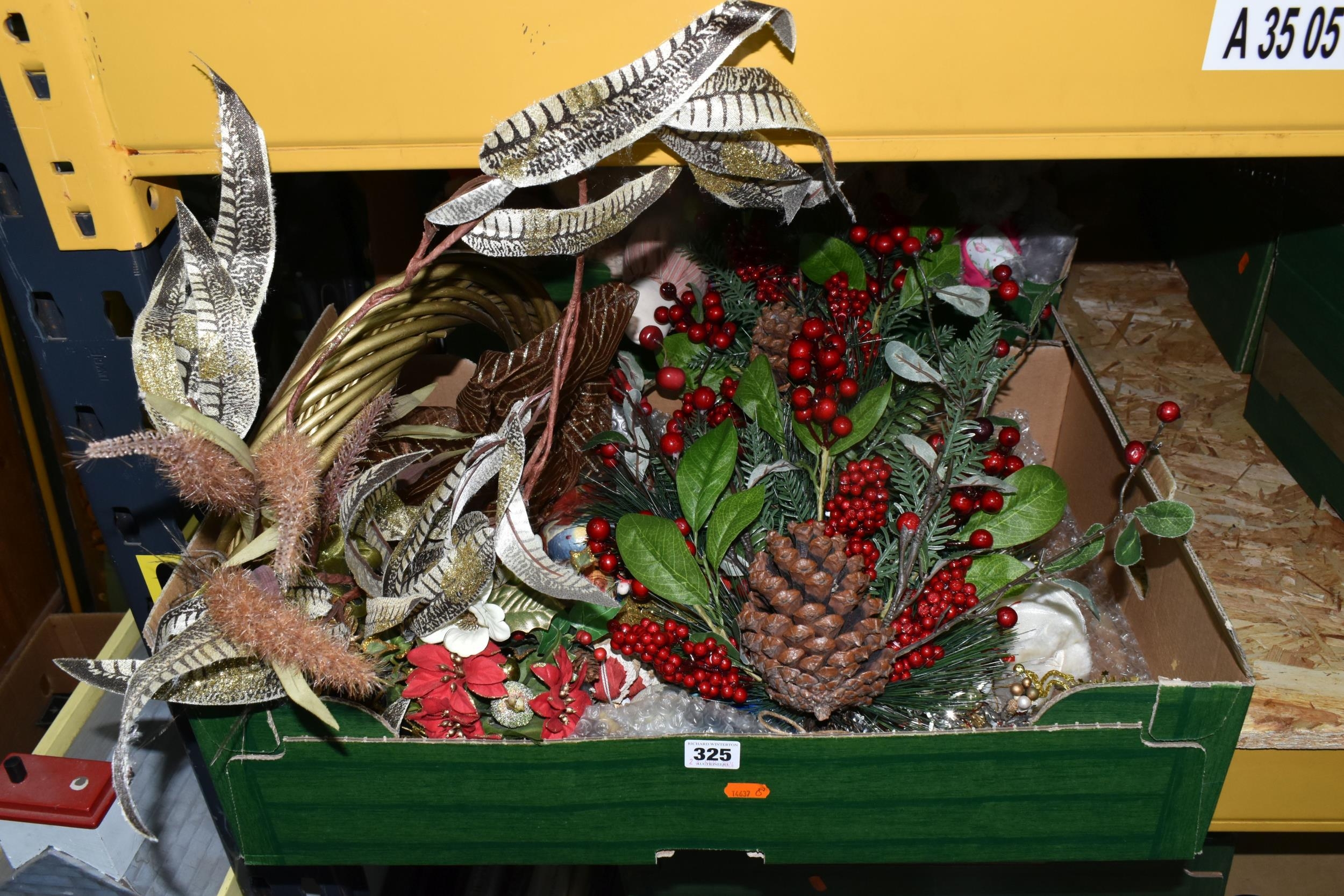 TWO BOXES AND LOOSE OF MIXED TOYS AND CHRISTMAS DECORATIONS to include a box of plush toys comprising bears, dogs, and dolls from modern high street manufacturers, and a box of Christmas decorations to include a vintage table-top miniature white Christmas tree, a small group of vintage tree decorations, assorted modern decorations, artificial flowers, and a wreath, a dolls house height 61cm x length 60cm x width 25cm with detachable roof, a quantity of furniture, figures, etc (2 boxes and loose) (s.d)