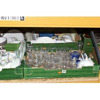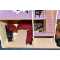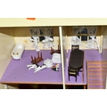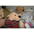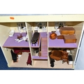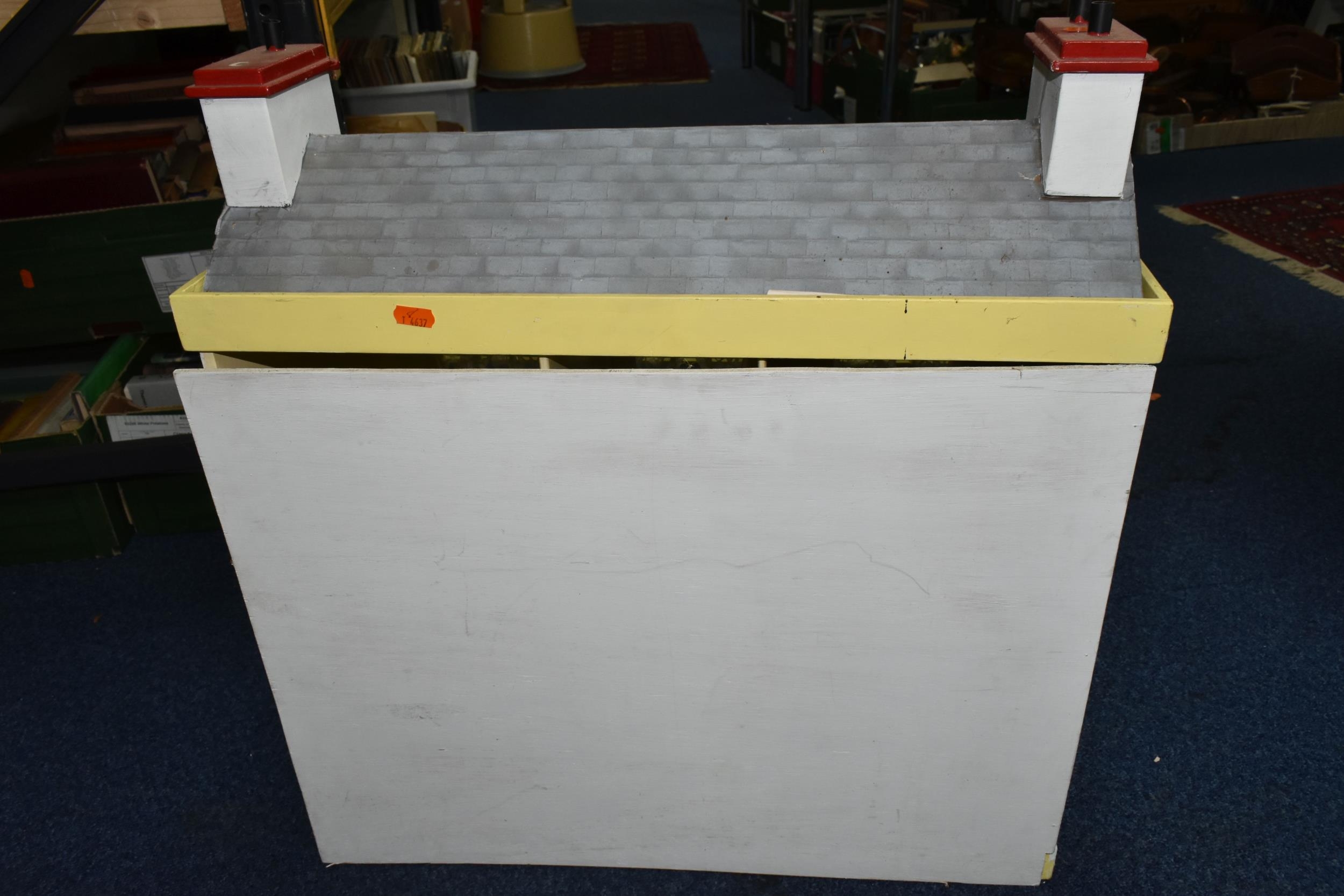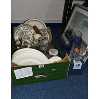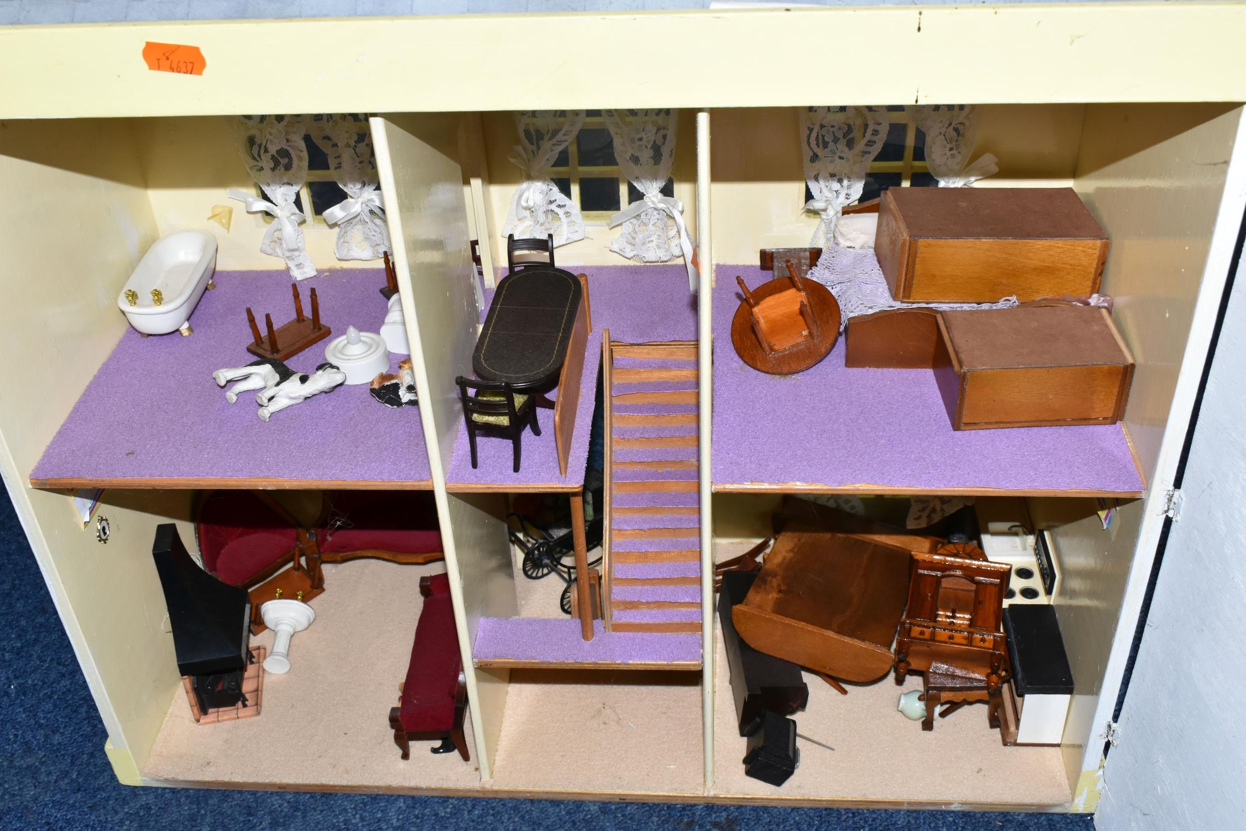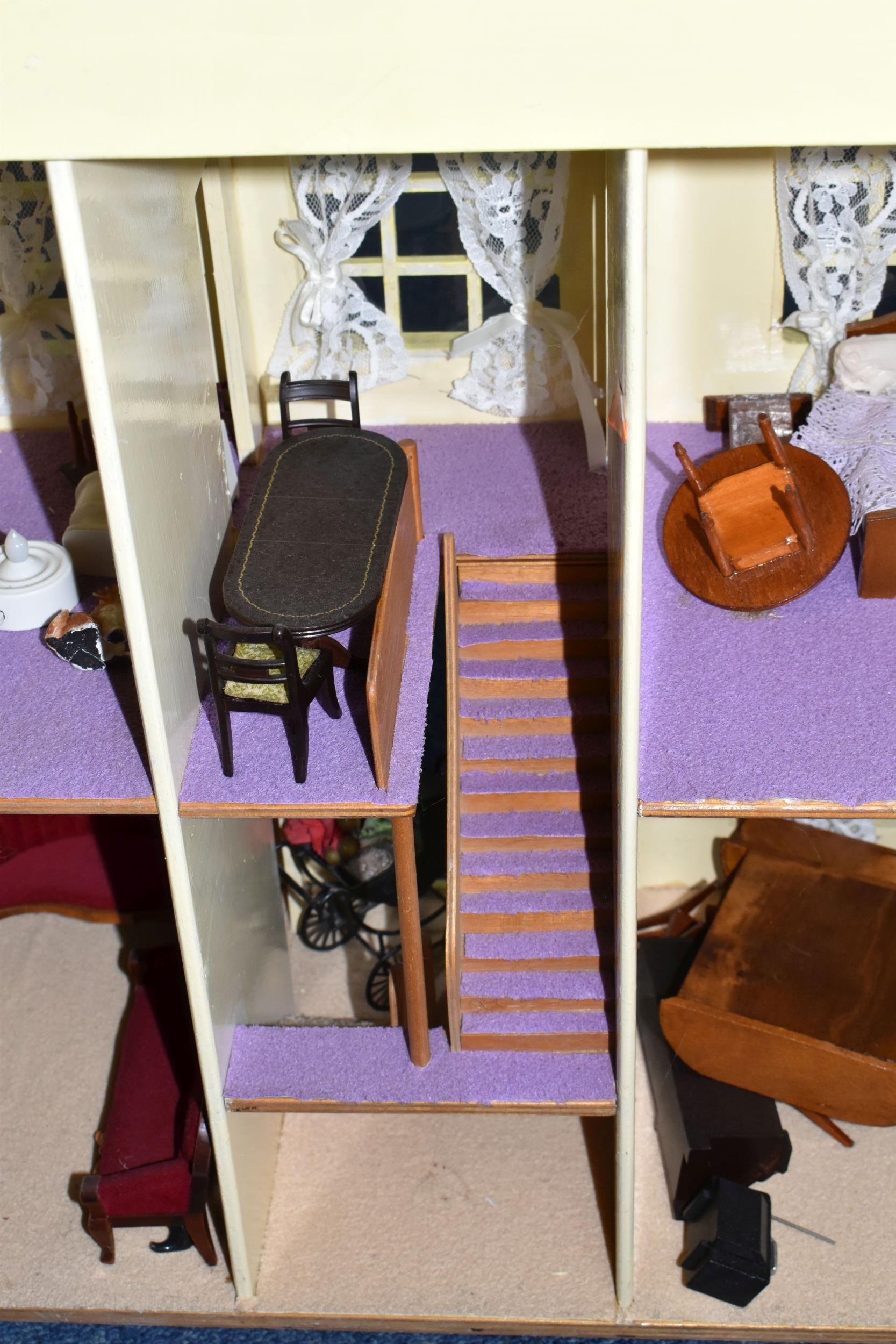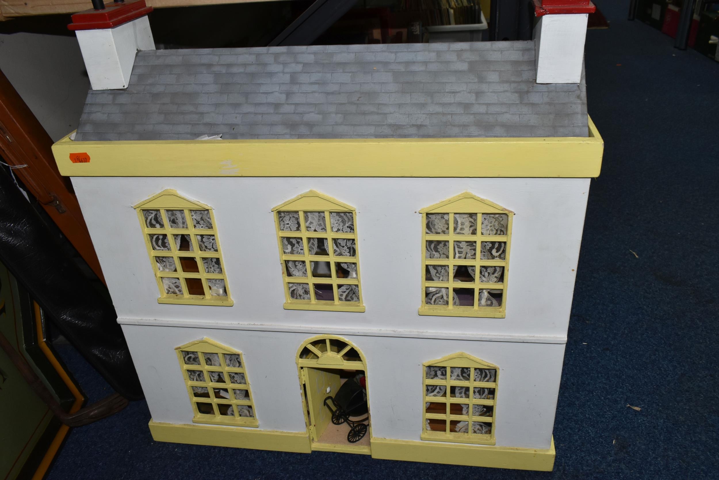 TWO BOXES AND LOOSE OF MIXED TOYS AND CHRISTMAS DECORATIONS to include a box of plush toys comprising bears, dogs, and dolls from modern high street manufacturers, and a box of Christmas decorations to include a vintage table-top miniature white Christmas tree, a small group of vintage tree decorations, assorted modern decorations, artificial flowers, and a wreath, a dolls house height 61cm x length 60cm x width 25cm with detachable roof, a quantity of furniture, figures, etc (2 boxes and loose) (s.d)