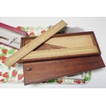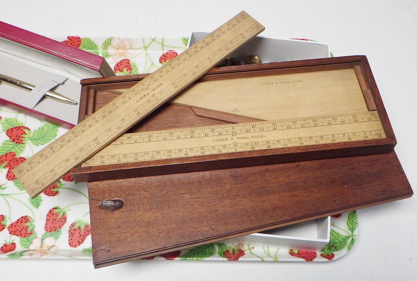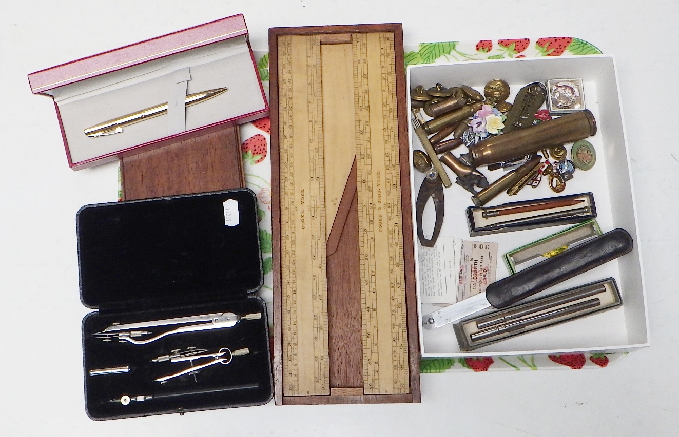 A cased wooden three piece ruler set by Cooke, York; a cased drawing set, other pens; group of military badges, buttons; etc