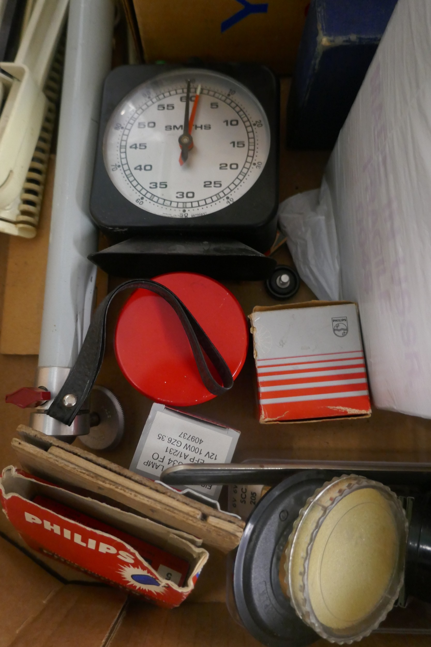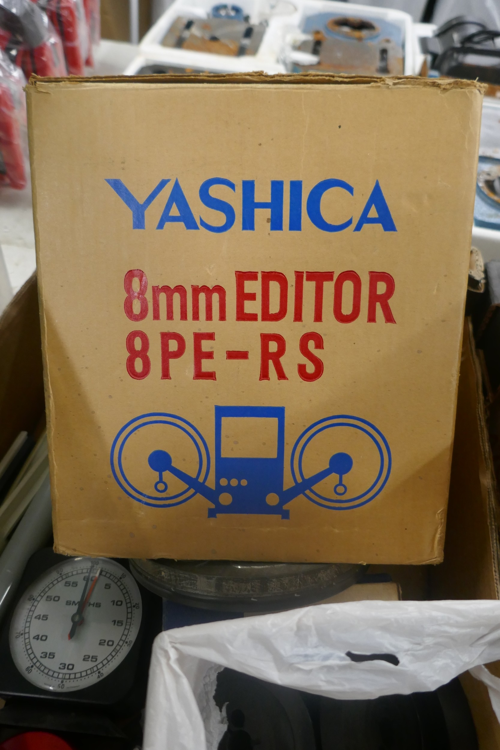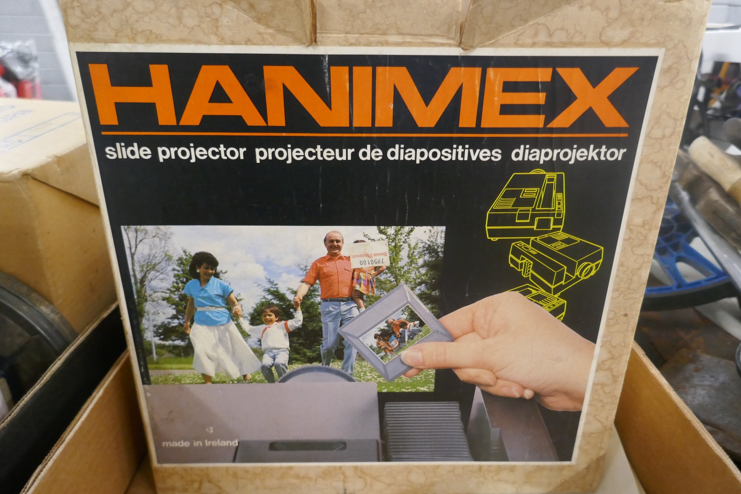 A quantity of photographic/cinema items including, slide projector, cine projector, editor, etc.**Hanimex and editor failed there PAT test due to no insulation sleeves on the plug pins and editor failed PAT test due to having no plug so these items are all sold as scrap only