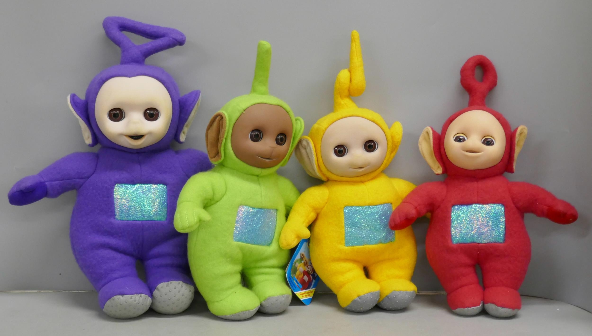 The Teletubbies - four Plush Toys from the 1990s, Tinky Winky, Dipsy, La La and Po