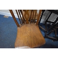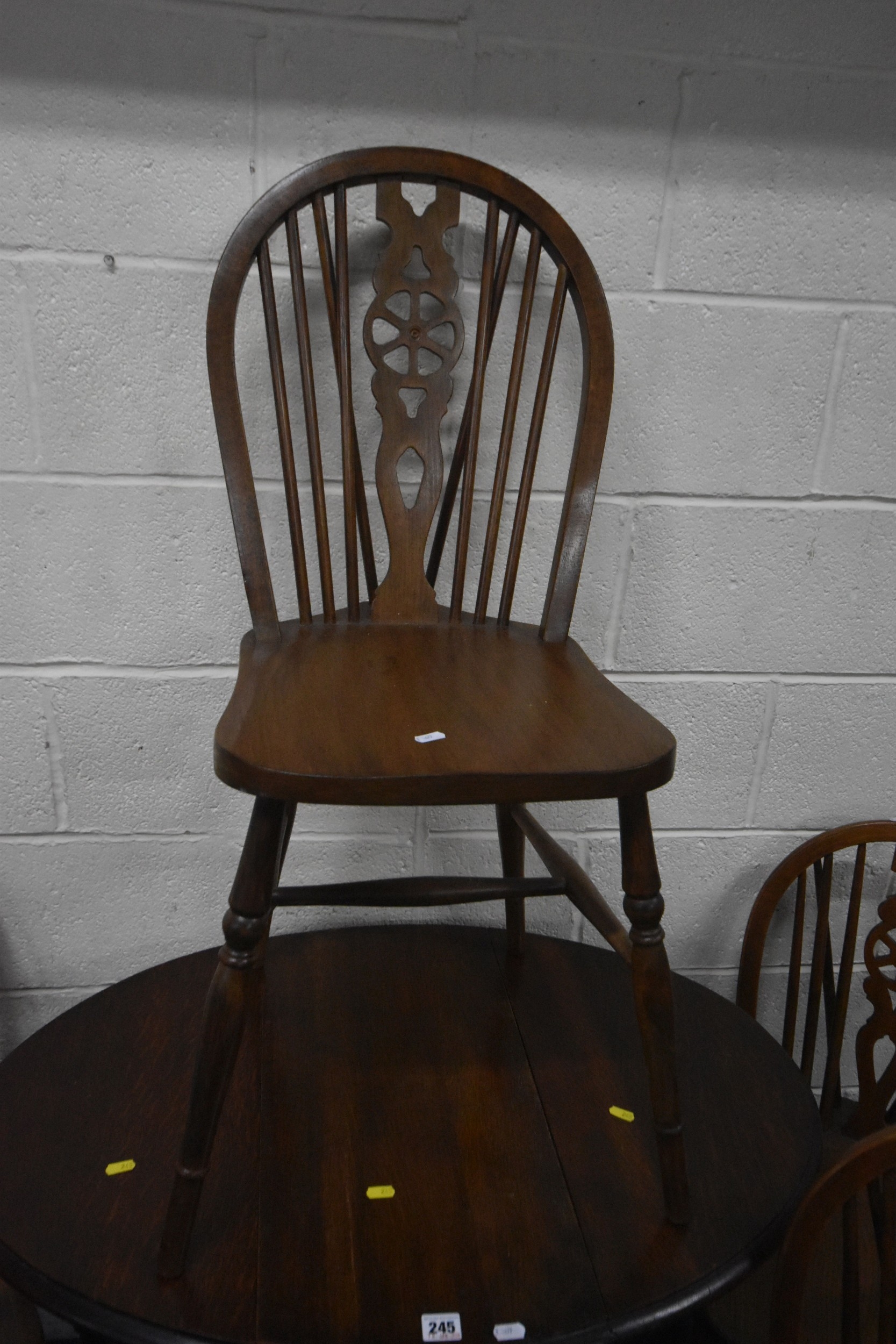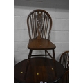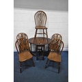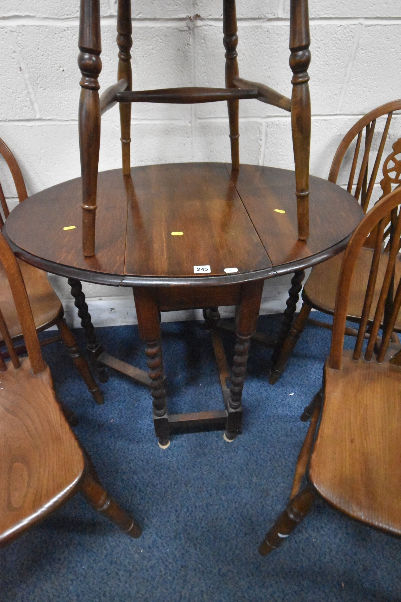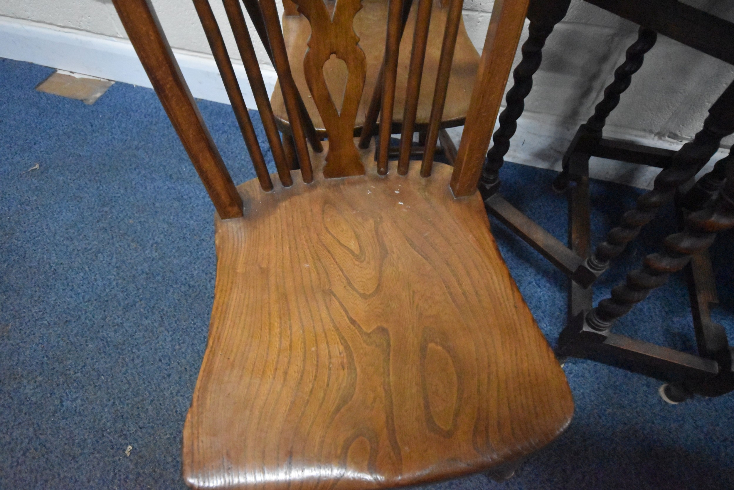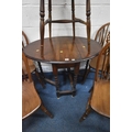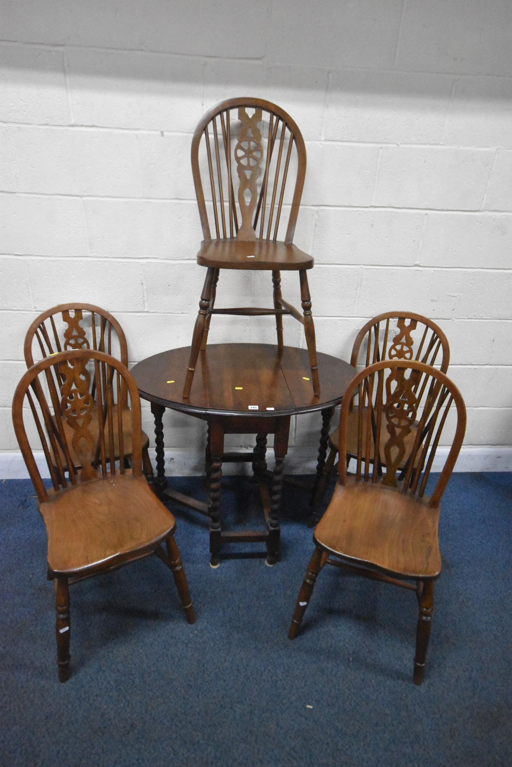 AN EARLY 20TH CENTURY OAK GATE LEG TABLE, with barley twist supports, open width 90cm x closed width 32cm x height 60cm x height 74cm, along with a set of five elm seated wheel back chairs, condition report: all with general signs of wear and usage (6)