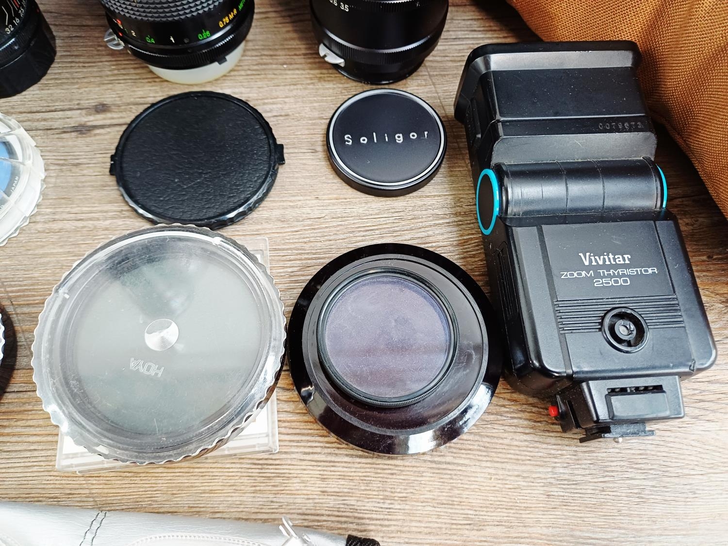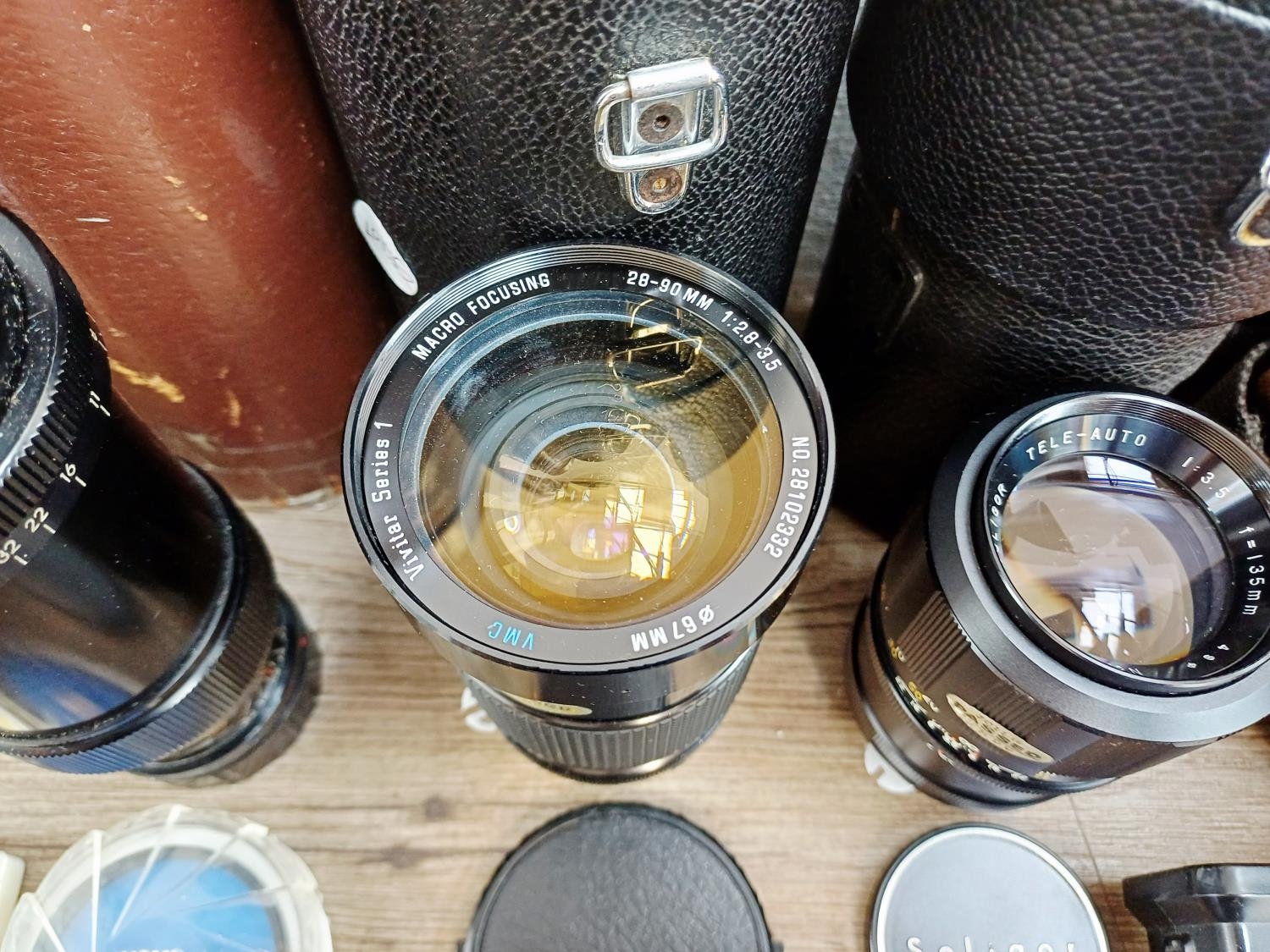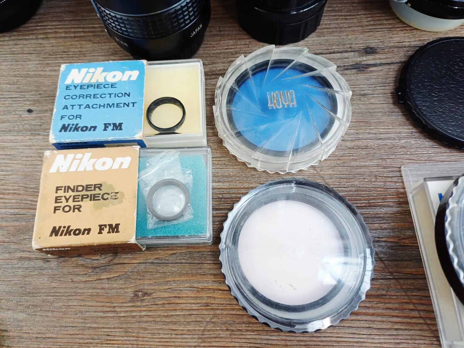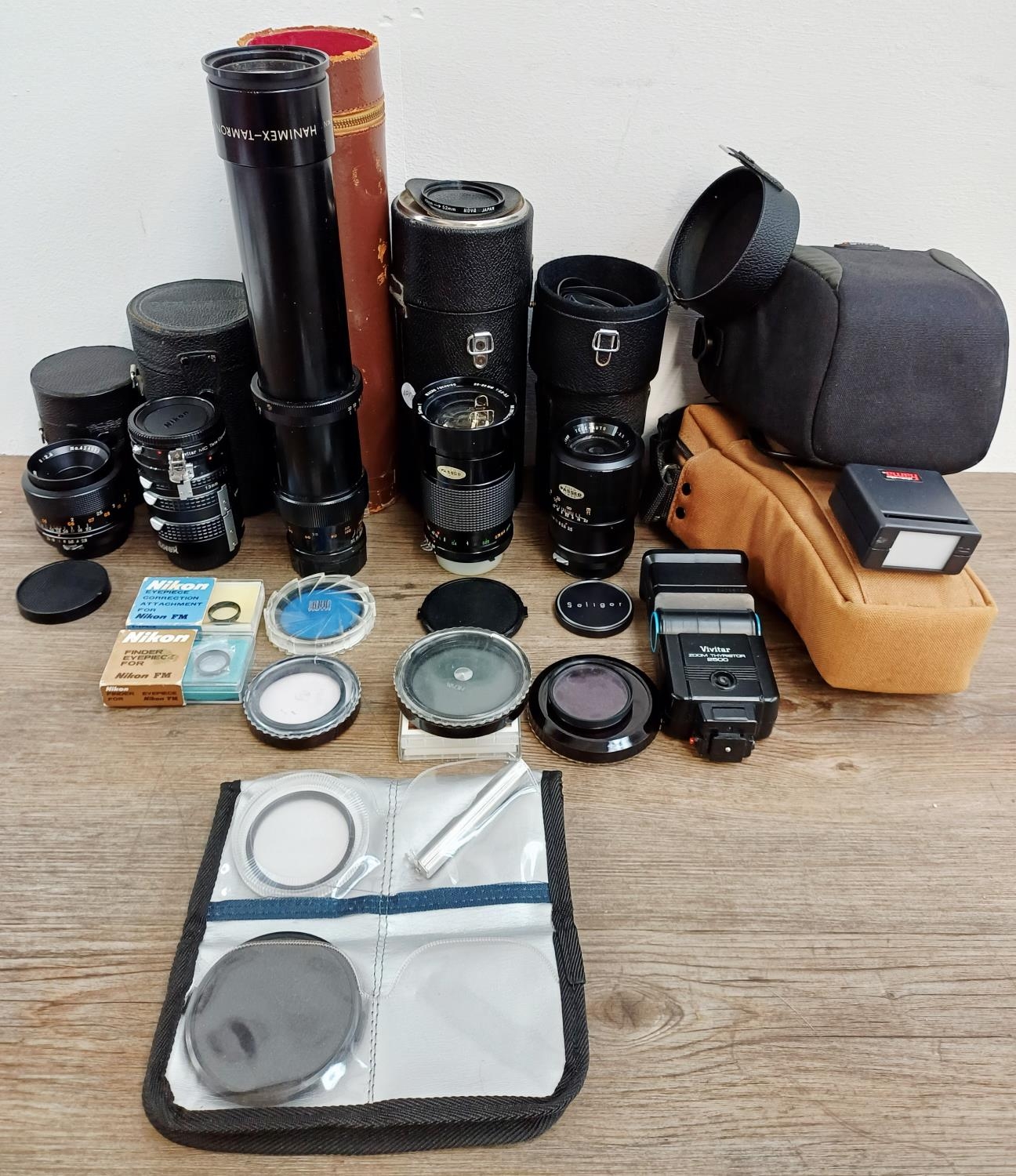 Five cased lenses for Nikon to include Soligor Tele-Auto 1:3.5 135mm, Vivitar Series 1 1:2.8-3.5 28-90mm macro focusing zoom, Vivitar MC Tele Converter, Unitor 1:2.8 35mm auto wide etc. together with two boxed Nikon FM eyepiece accessories, filters, Lowepro camera case etc.