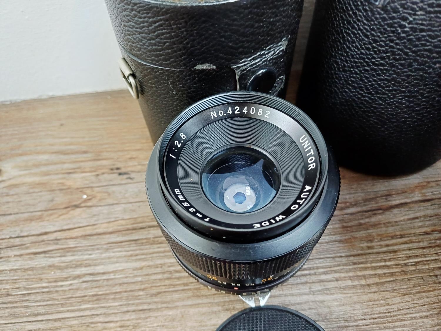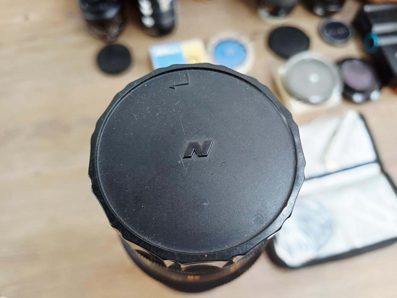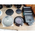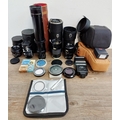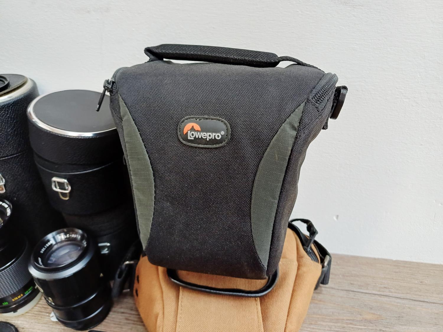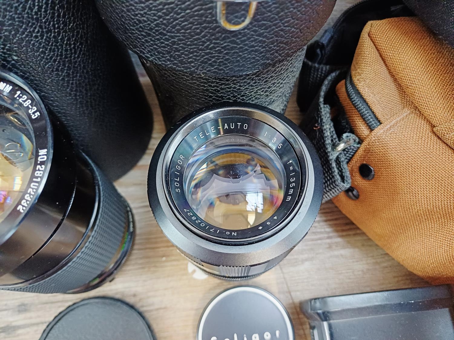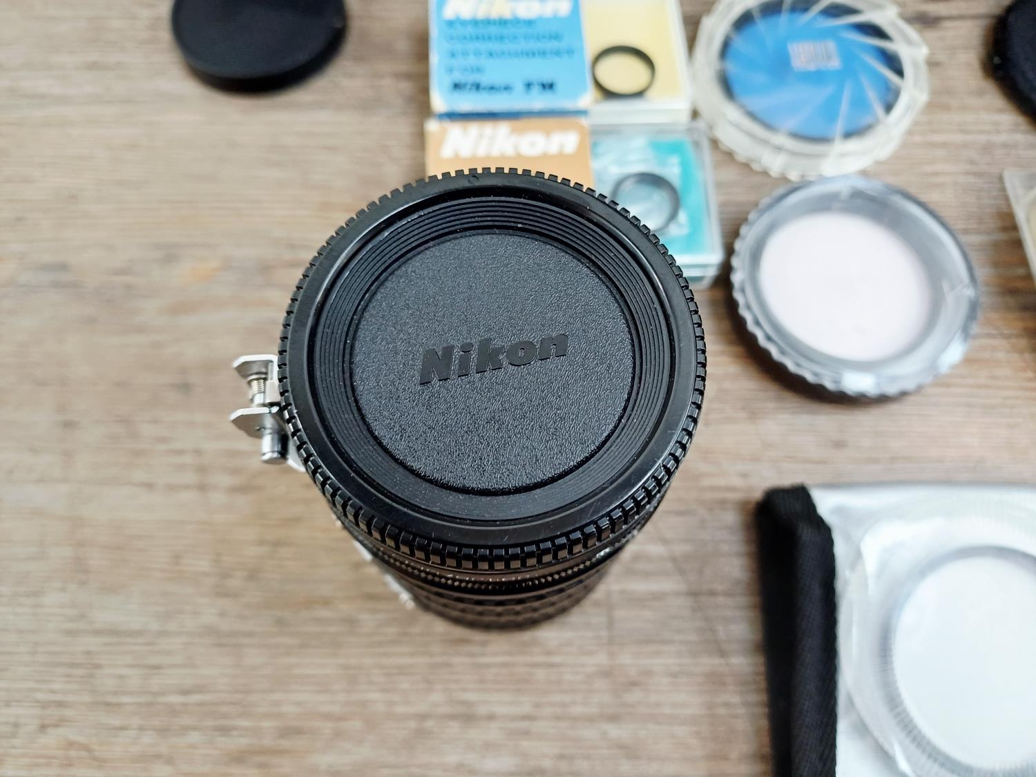 Five cased lenses for Nikon to include Soligor Tele-Auto 1:3.5 135mm, Vivitar Series 1 1:2.8-3.5 28-90mm macro focusing zoom, Vivitar MC Tele Converter, Unitor 1:2.8 35mm auto wide etc. together with two boxed Nikon FM eyepiece accessories, filters, Lowepro camera case etc.
