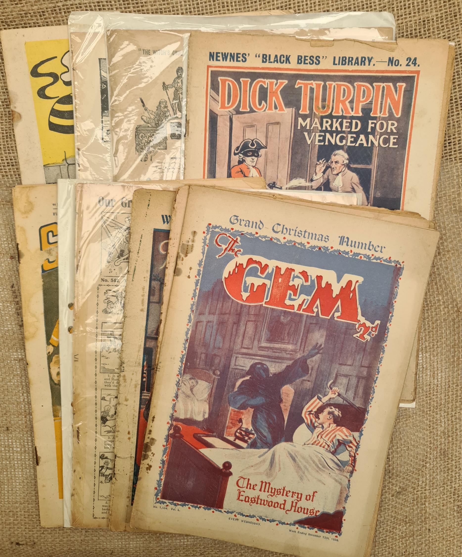 10 x 20th Century Comics or Boys Papers Includes The Gem 1930's, School Cap 1953, The Schoolgirl 1937 Film Fun 1930 Boys Of Our Empire 1902 Boys of England 1896 and Newnes "Black Bess" Library 1922 Dick Turpin. Shipping is available. Please ask for a quote before bidding. Where possible we combine shipping costs. Remember, if you are the highest bidder above reserve on this Lot you have bought the item and are legally responsible for the item. Viewing is recommended in either person or via video link. Contact us to arrange. #F10